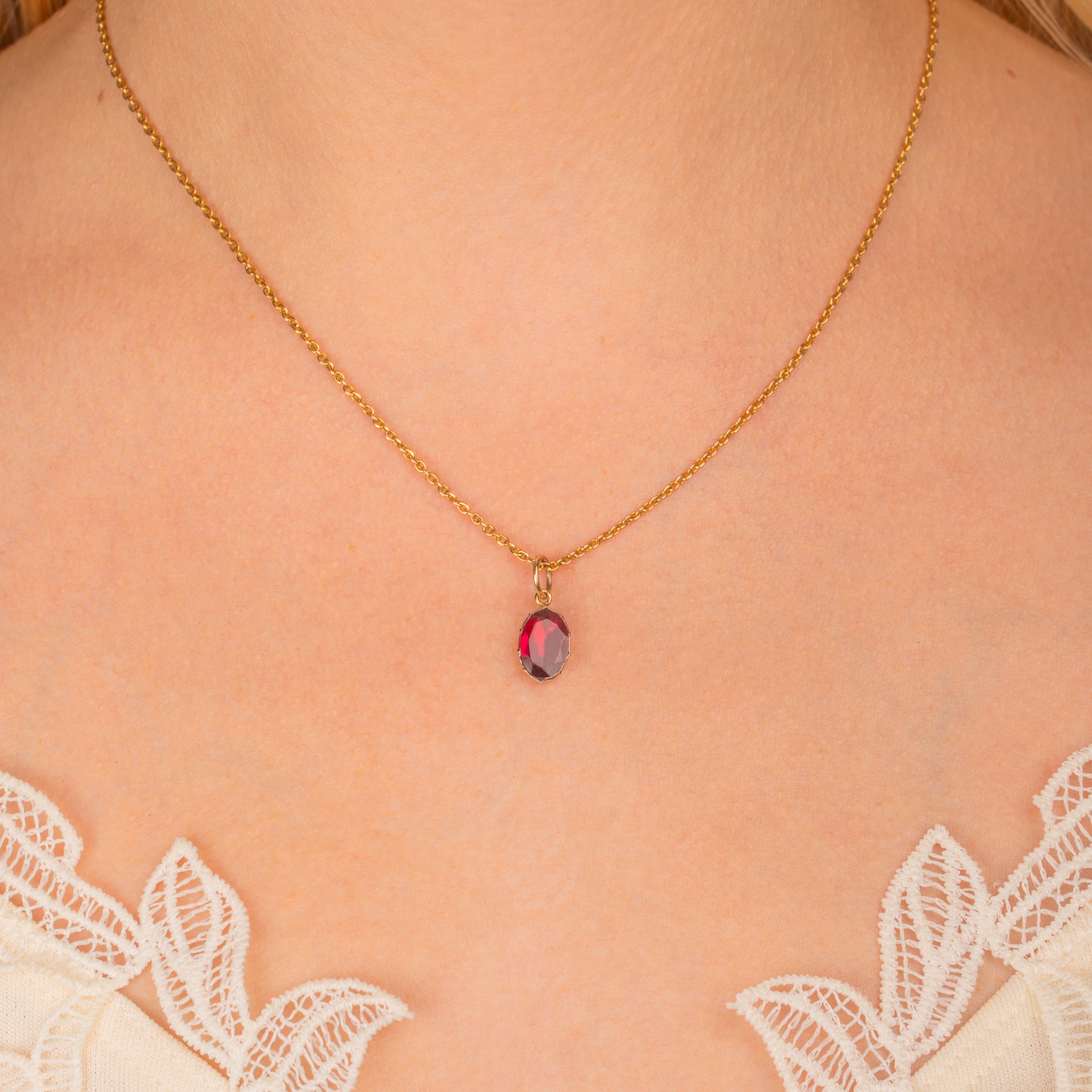 A deliciously juicy 9ct Gold Georgian flat-cut Garnet charm to liven up your necklace stacks. The Garnet has a gorgeous merlot hue, whilst her faceted, foiled form reveals fabulous flashes of purple under the light.