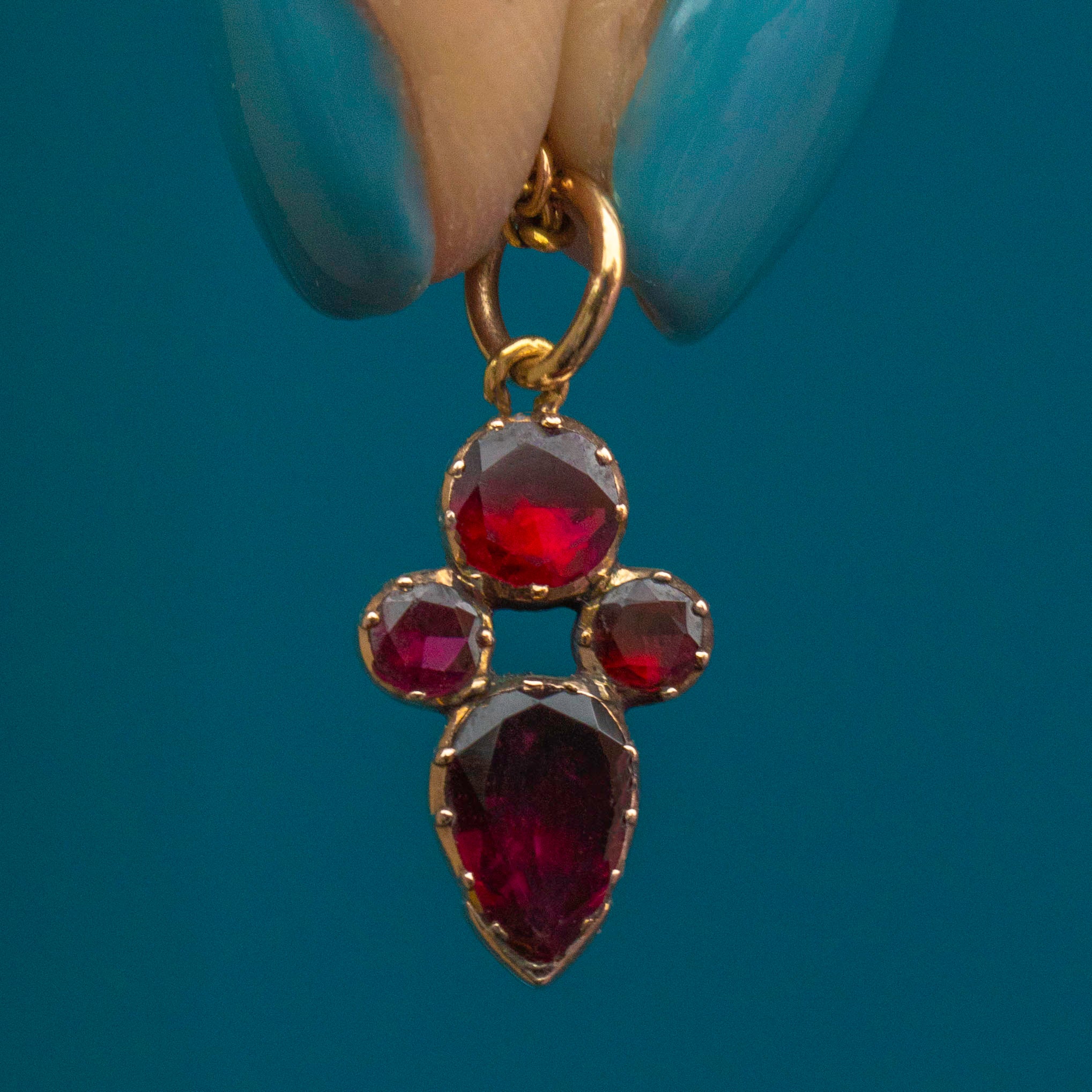 EXCELLENT. This Georgian 9ct Gold flat-cut Garnet charm is in superb condition. All four Garnets have stood the test of time and are held securely in their solid gold piecrust setting. While there are one or two dings on the back of the 9ct Gold setting, this is not visible during wear. You'll adore this Georgian Garnet pendant so much, you won't want to take her off!