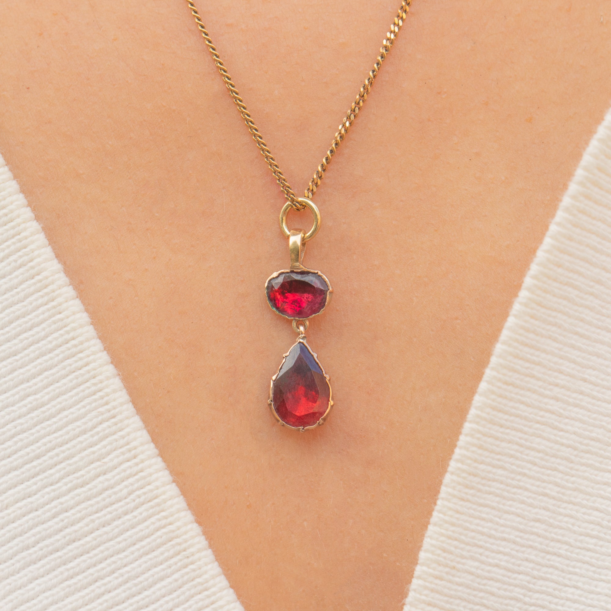 This Georgian charm is set with two glowing flat-cut Garnets in a classic drop arrangement: an oval to the top and a pear-shaped drop beneath. Foil-backed and mounted in traditional cut-down collet settings of 9ct Gold, the stones show that rich claret hue so prized in early 19th-century jewels. A dainty, characterful piece ready to add a pop of Georgian colour to any chain.