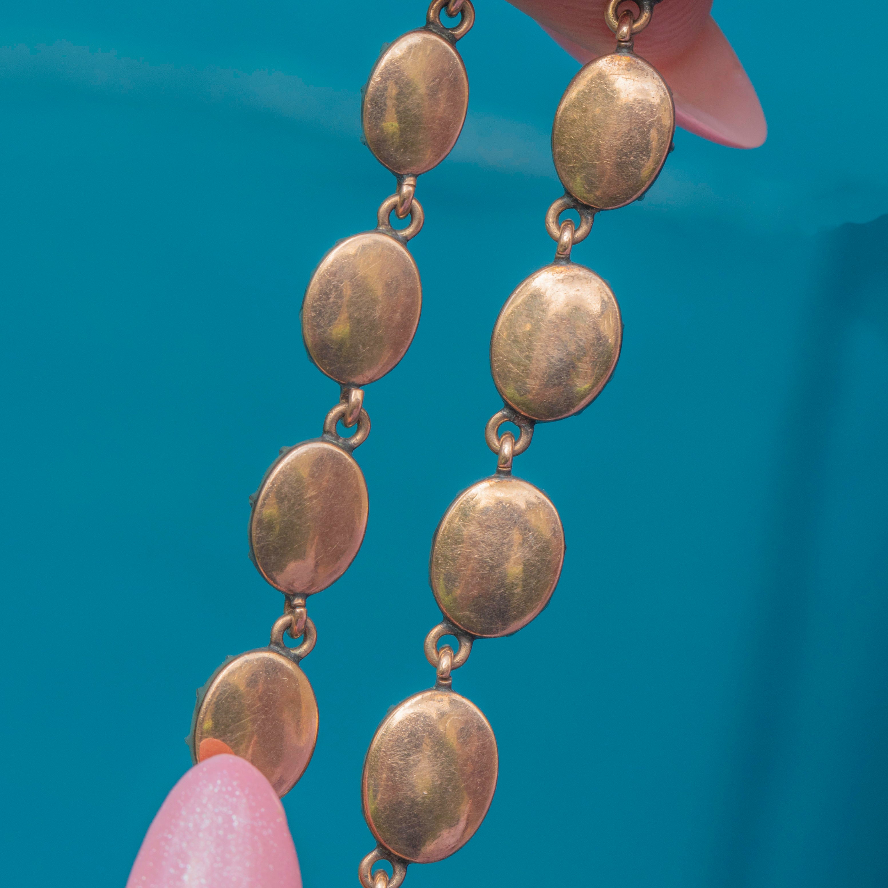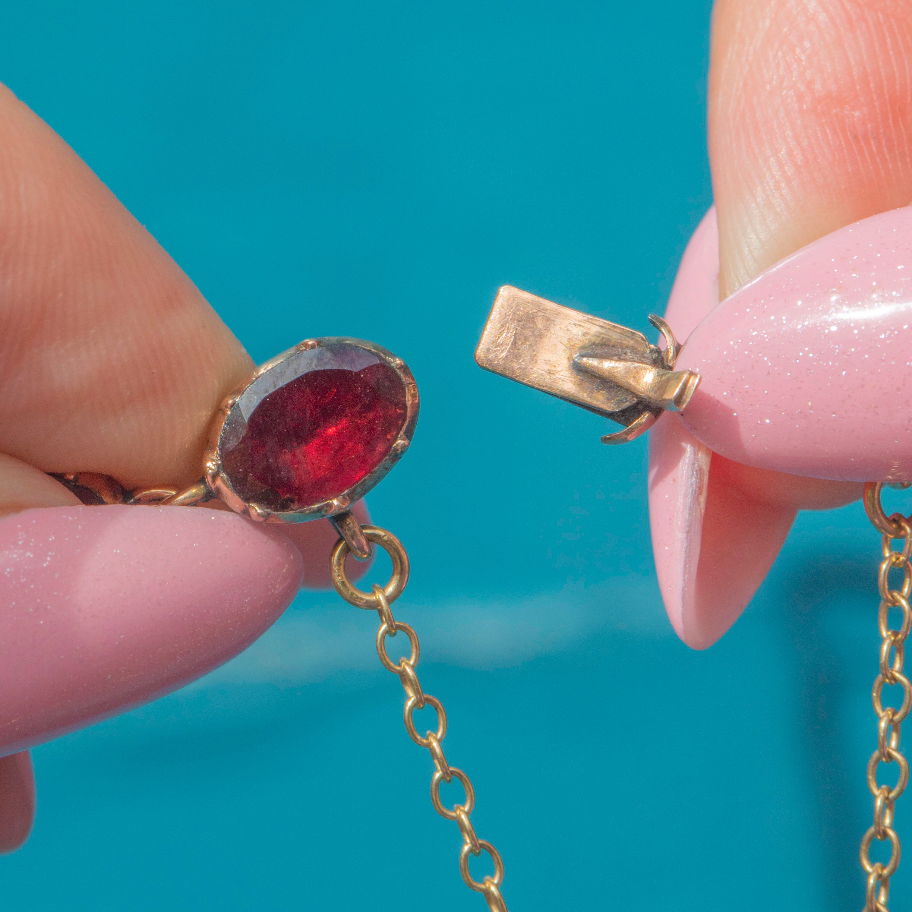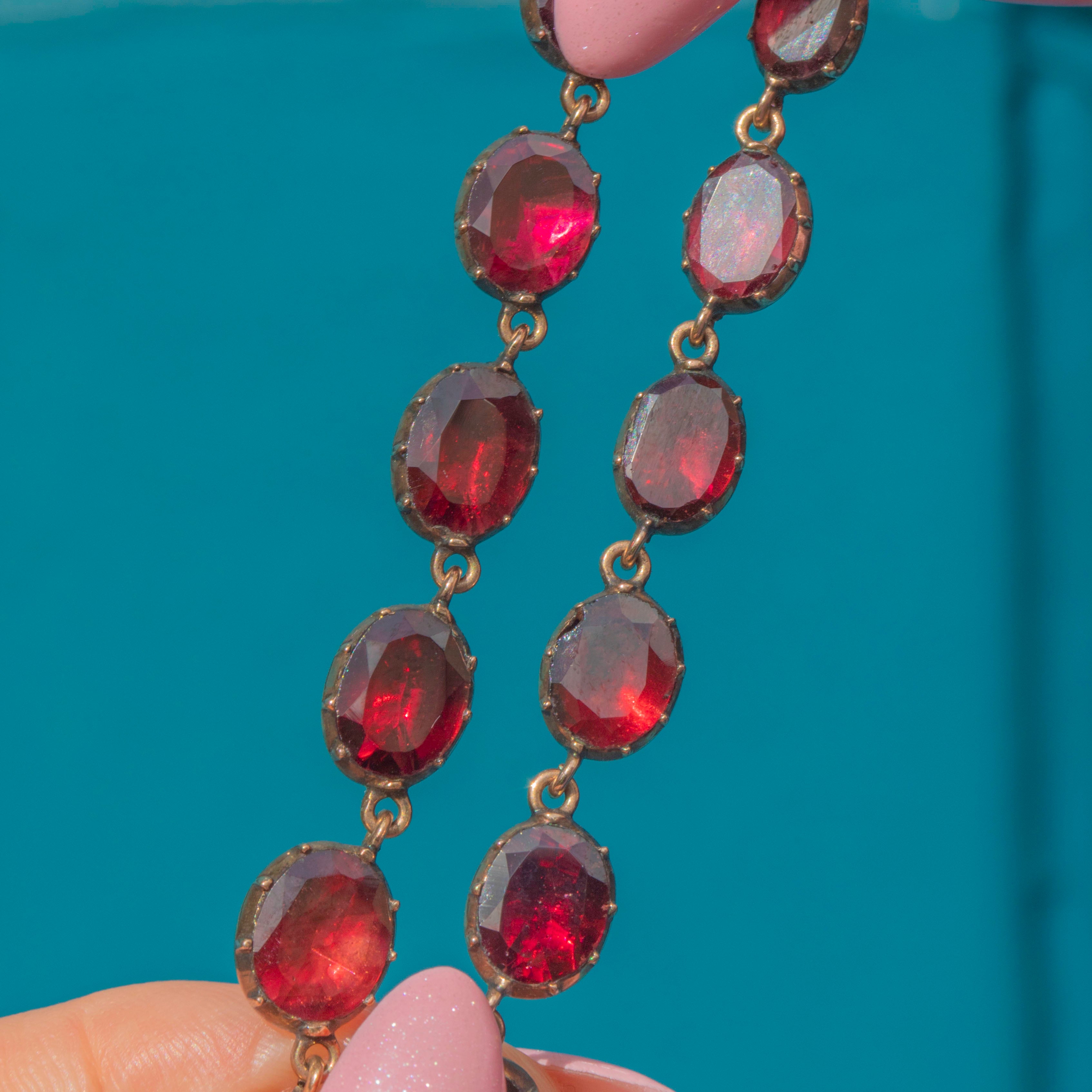 EXCELLENT: It is rare to find a Georgian necklace in such fabulous condition. The backs are pristine, with no dings or dents - and this is definitely unusual for such an old necklace. One of the smallest Garnets has a little chip (right around the back of the necklace), but the rest are all pristine. The clasp is in perfect working order, and has a safety chain for your peace of mind.