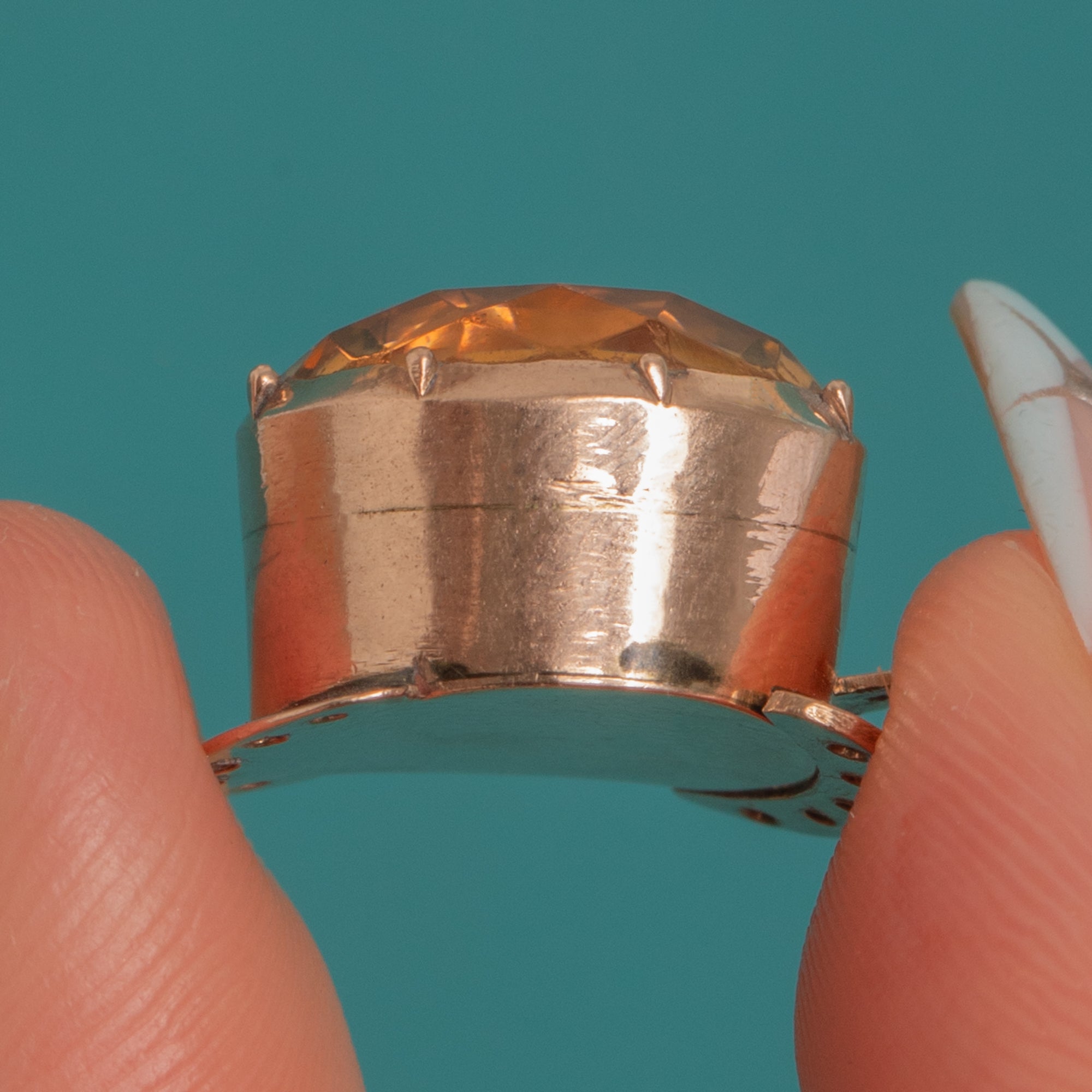 EXCELLENT: The Yellow Paste shows only light abrasions and minute facet wear visible under magnification, remaining bright and lively. The 9ct Gold setting has fine surface scratches and a soft patina consistent with age, with crisp edges and a well-preserved finish. No obvious repairs or alterations observed.