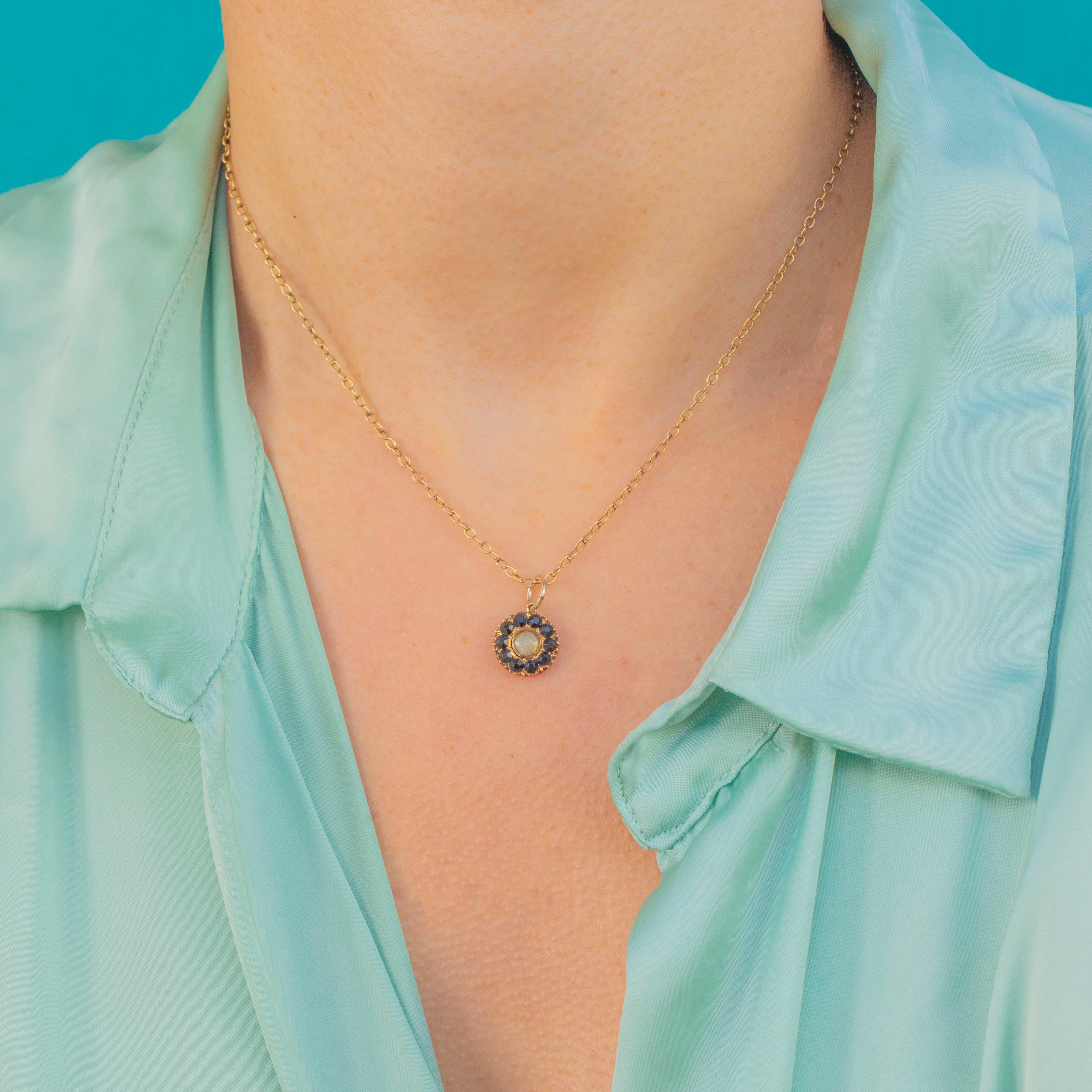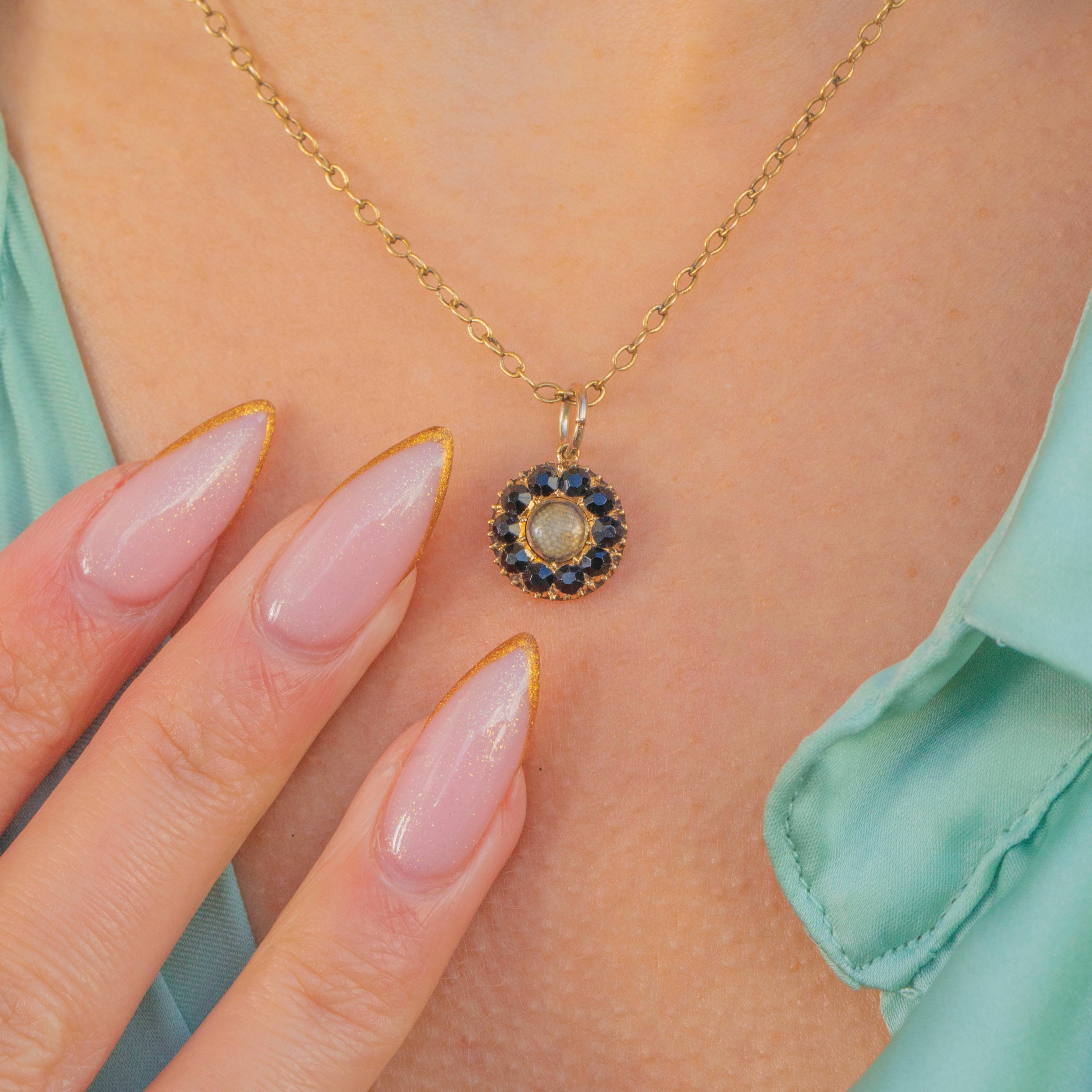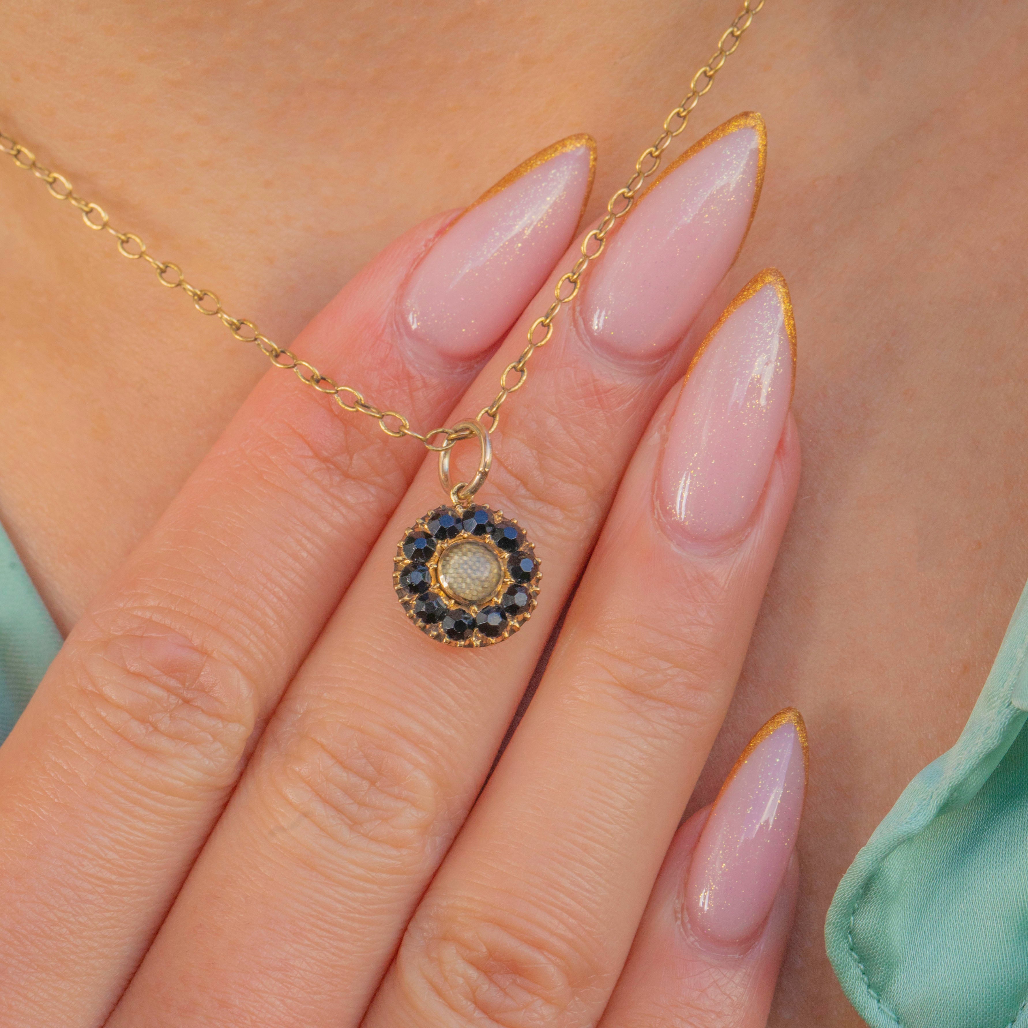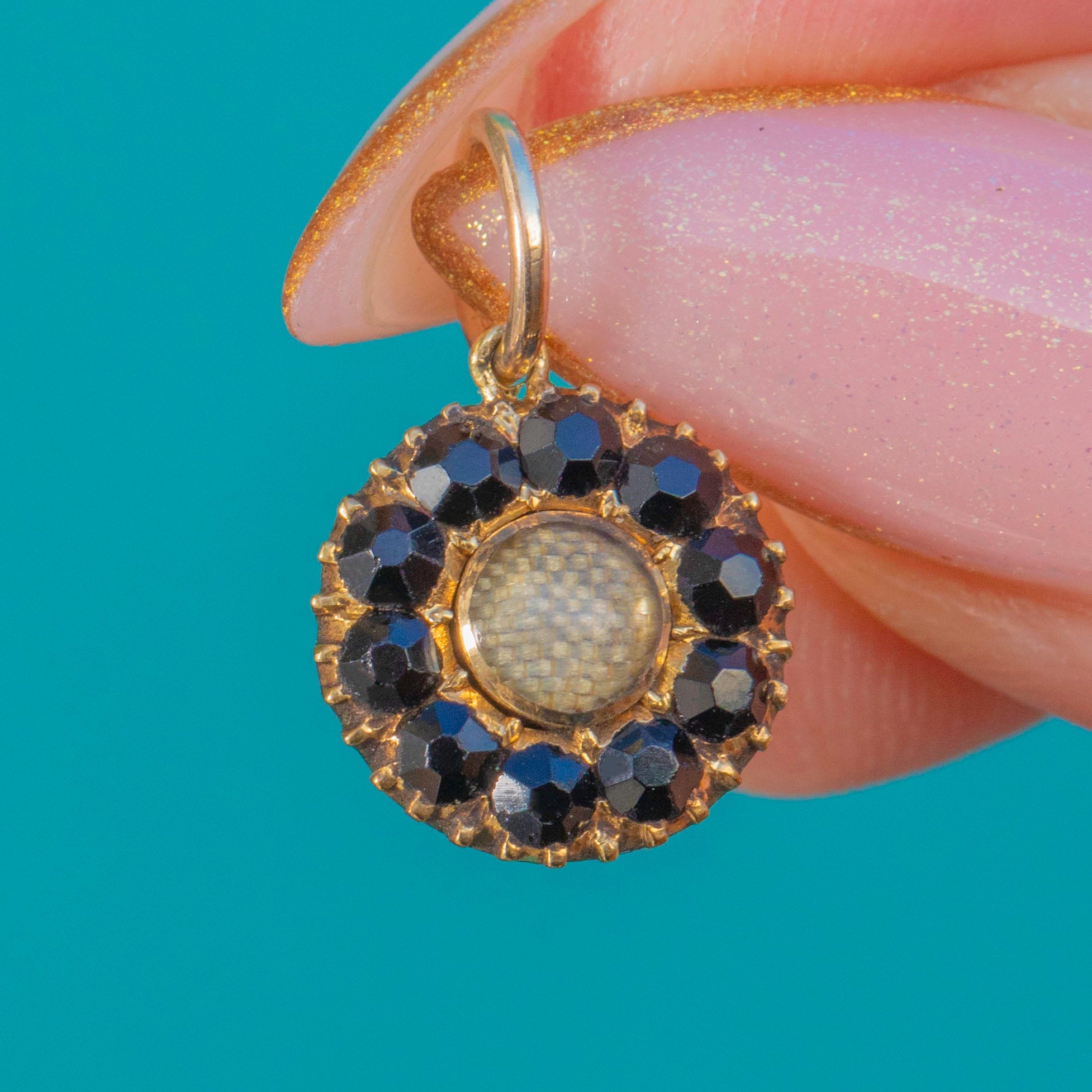 A beautiful late Georgian charm crafted in 9ct Gold and set with sparkling French Jet. The glossy black faceted stones form a striking halo around the central Woven Hair compartment, creating that dramatic light-catching contrast so beloved in Georgian jewellery. Rich in sentiment and perfectly wearable today, it makes a wonderful addition to any antique charm or fob collection.