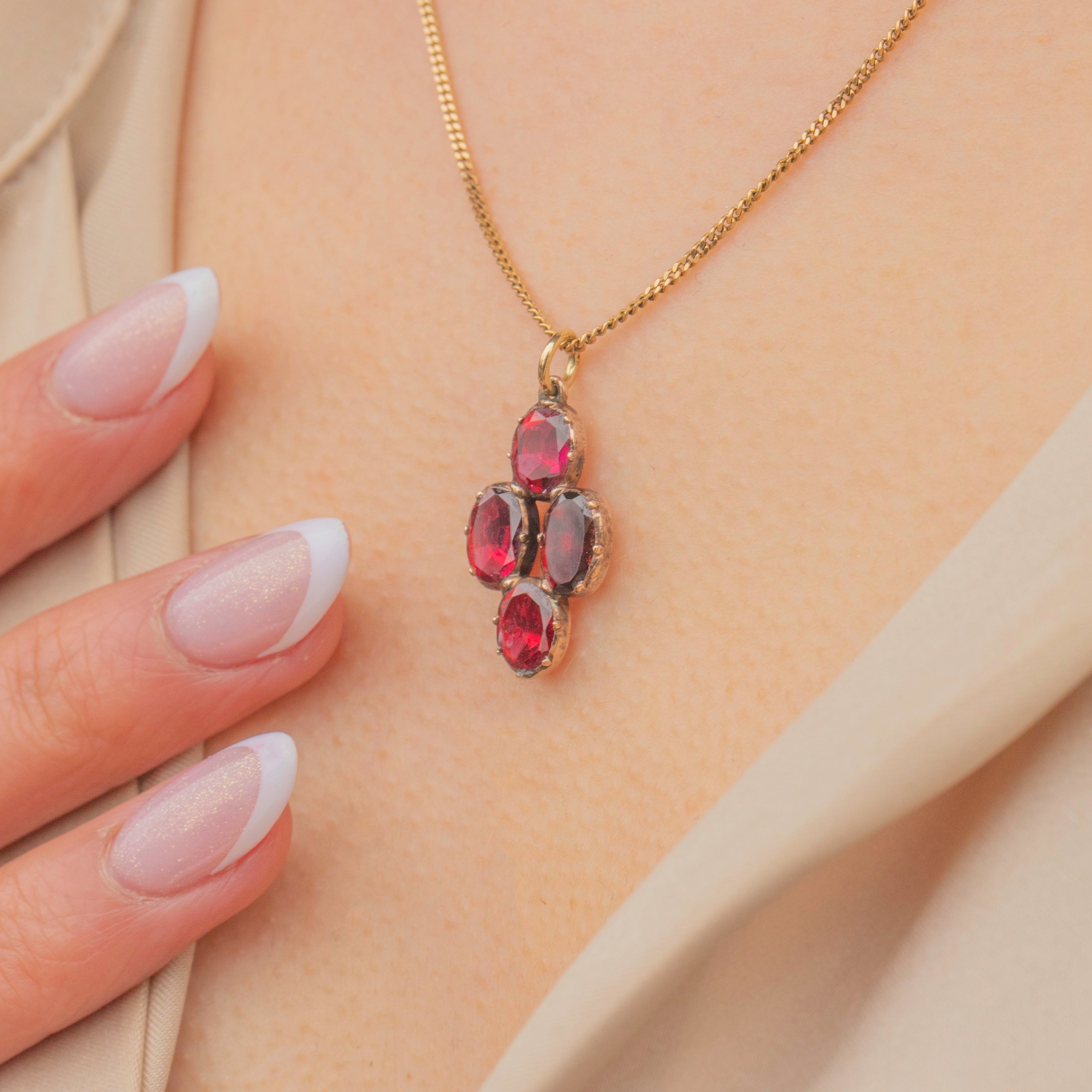 This exquisite Georgian 9ct Gold Garnet charm is a true delight! Showcasing four beautifully flat-cut Garnets arranged in a quartet formation, she shimmers with deep, crimson hues—reminiscent of a cluster of ripe, irresistible berries.