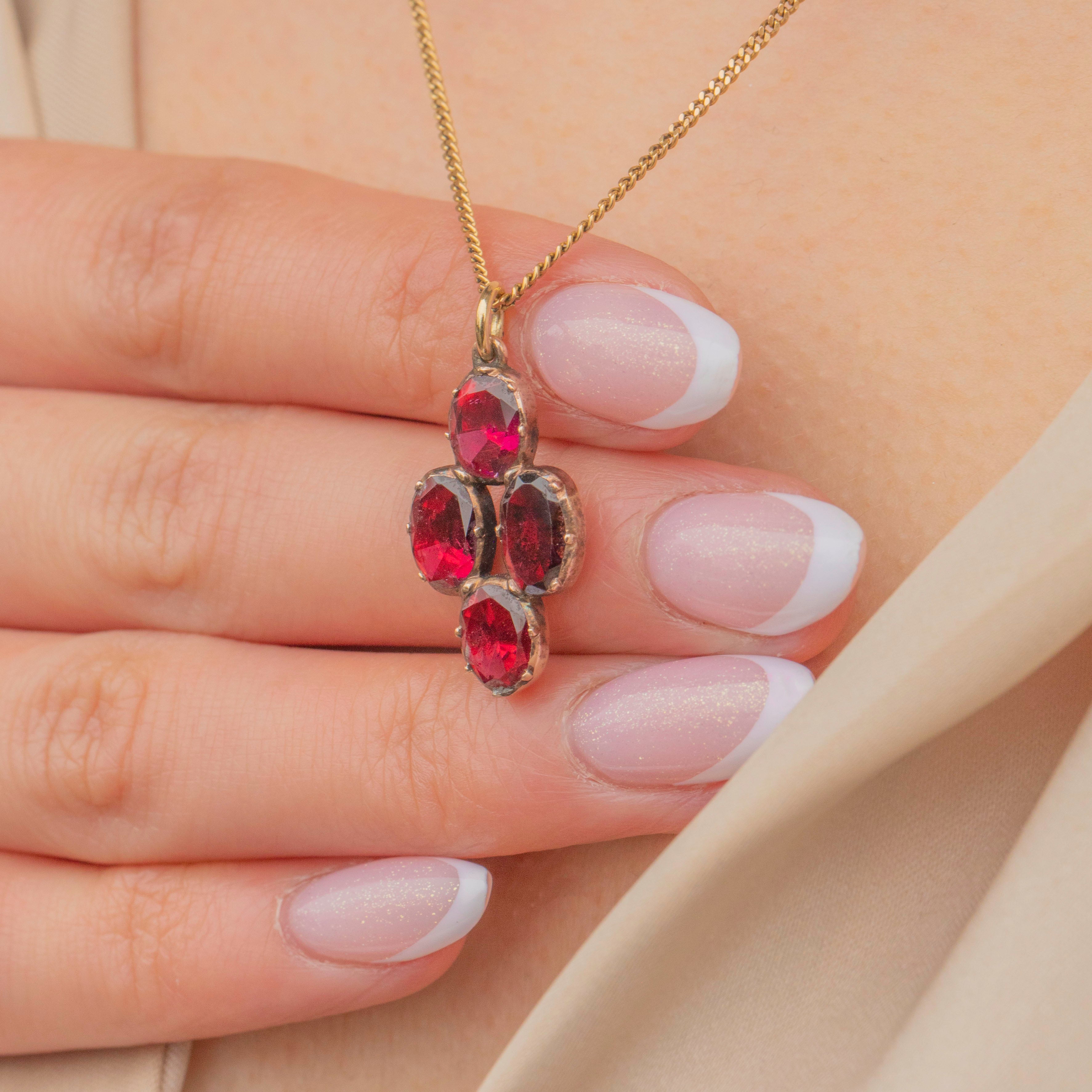Each Garnet is set within delicate, rosy Gold piecrust settings, with a polished back that ensures comfortable wear. A testament to the craftsmanship of the Georgian era, this piece exudes timeless sophistication, making it a captivating addition to your collection!