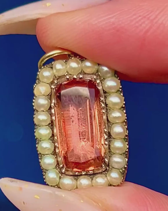 A delicate Georgian treasure, this 9ct Gold pendant centres on a long rectangular Imperial Topaz glowing with warm peachy-orange hues. The stone is framed by a refined halo of creamy Seed Pearls, the whole composition brought together with a hand-finished piecrust collet and fine milgrain detailing for that sought-after period charm.