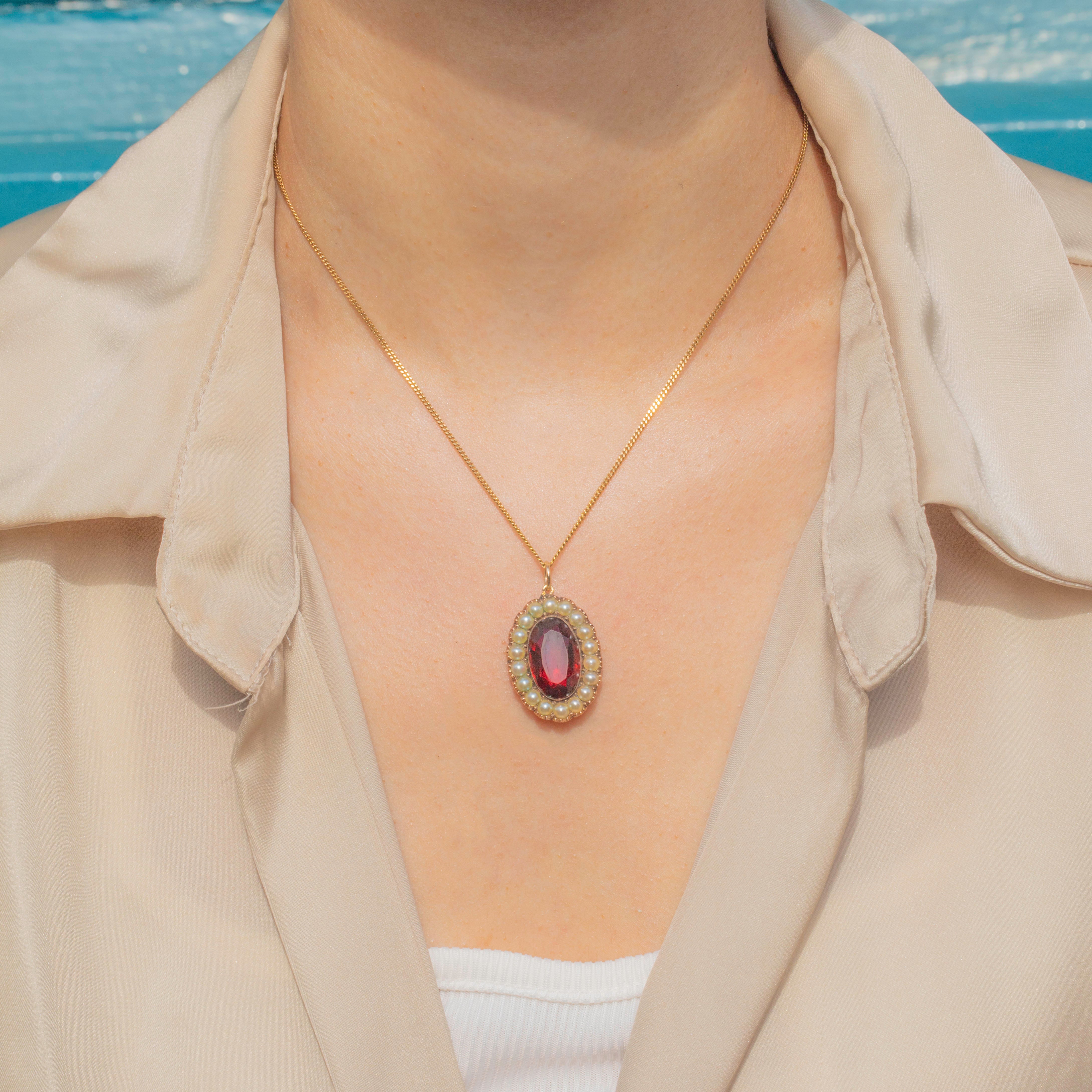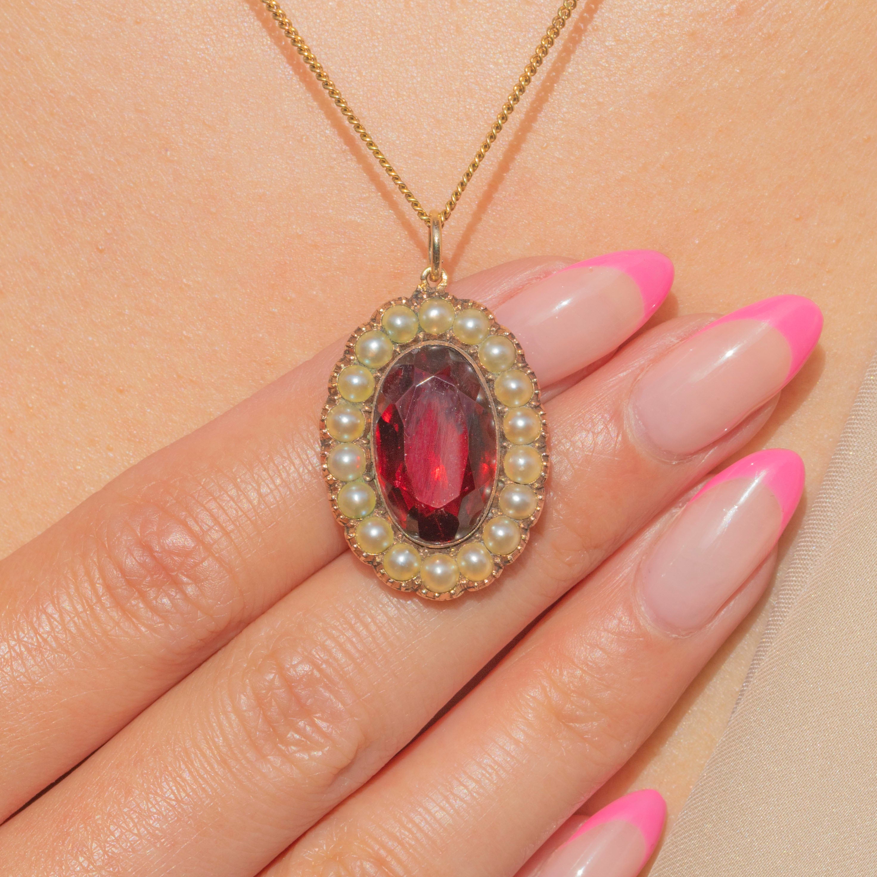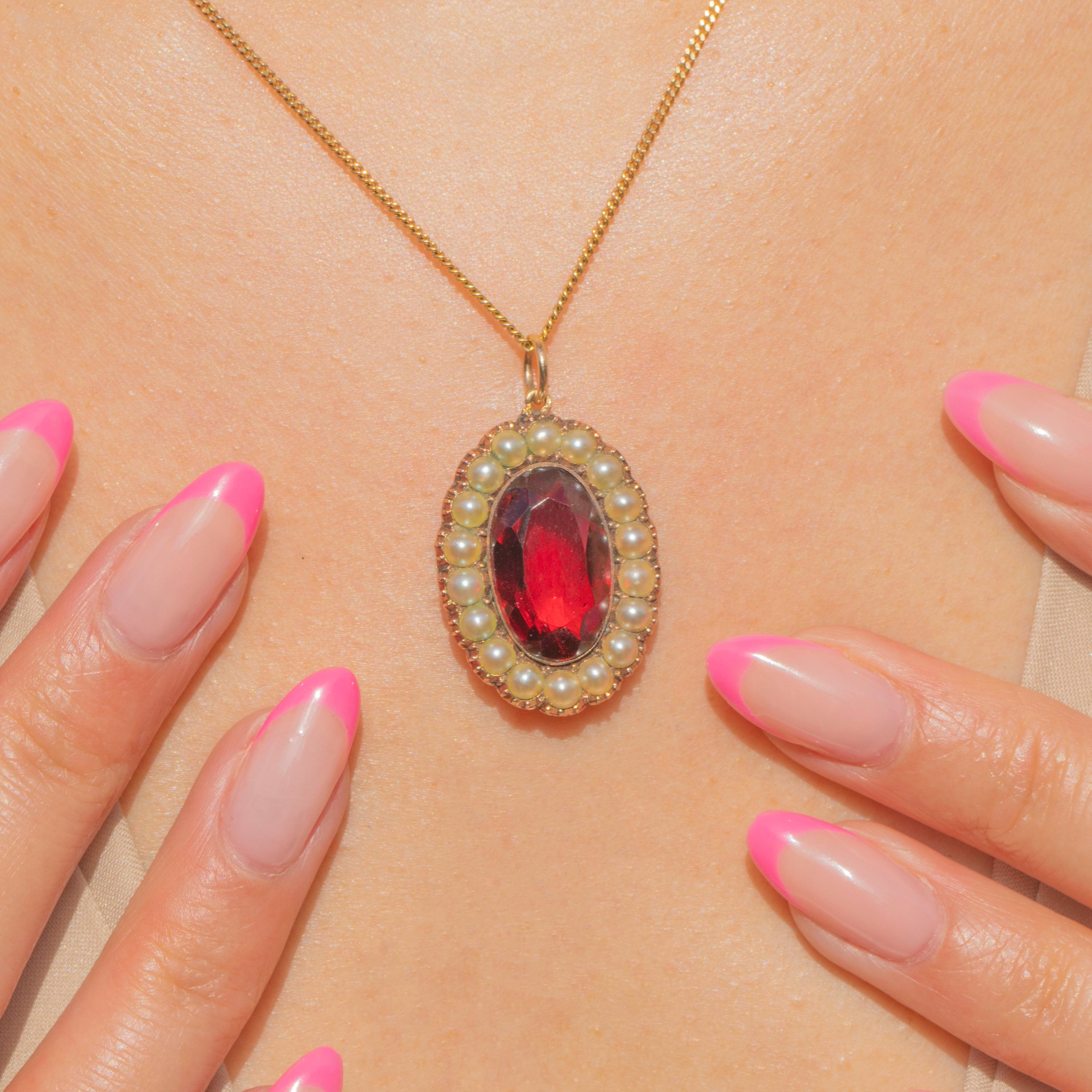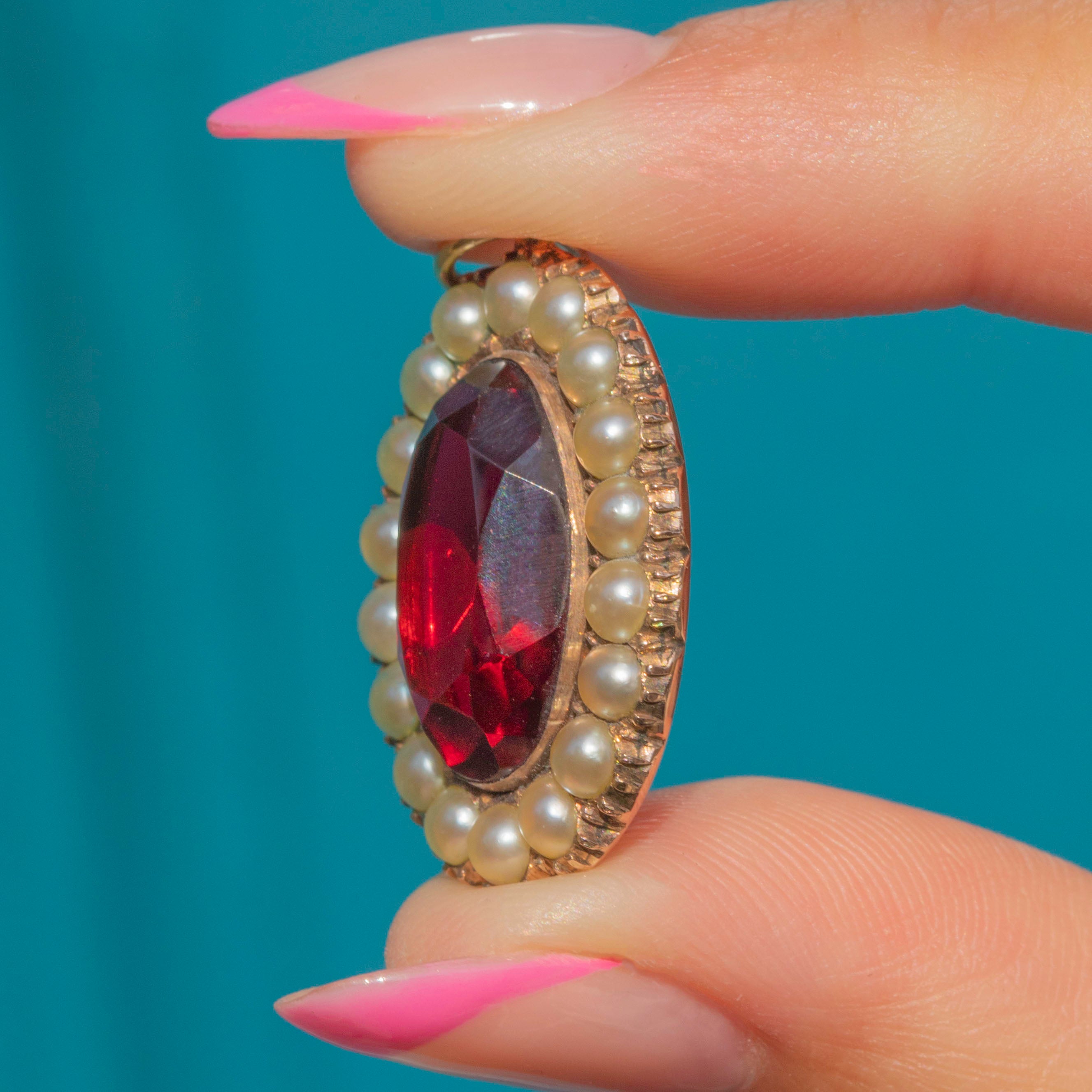Exuding regency-era charm, this Georgian 9ct Gold red Paste & Pearl cluster pendant will make a romantic addition to your collection! Exquisitely faceted, the red Paste bursts with vibrant crimson hues as the light dances across its surface, wonderfully contrasted by the lustrous Pearls that elegantly wrap around its oval form.