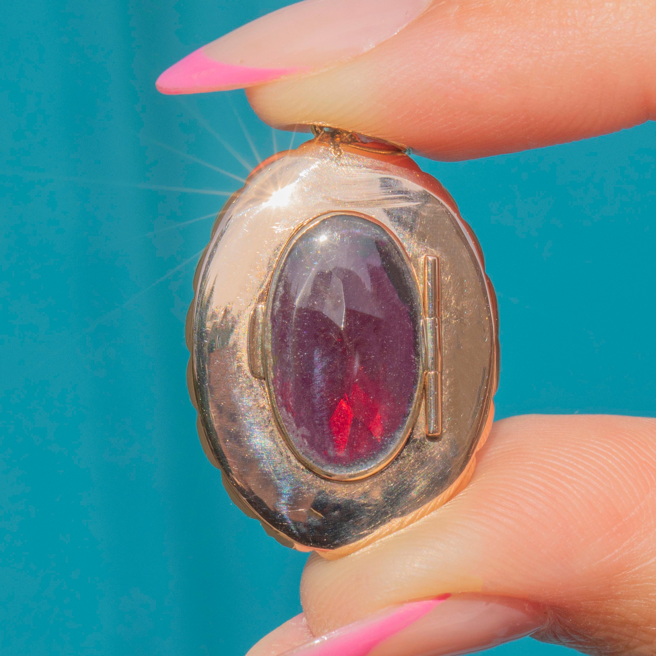 In typical Georgian style, each gemstone is displayed within crimped piecrust settings, crafted from buttery 9ct Gold. Upon turning this antique pendant over, you will discover a secret locket compartment, to which you can place a cherished photograph for a personal touch!