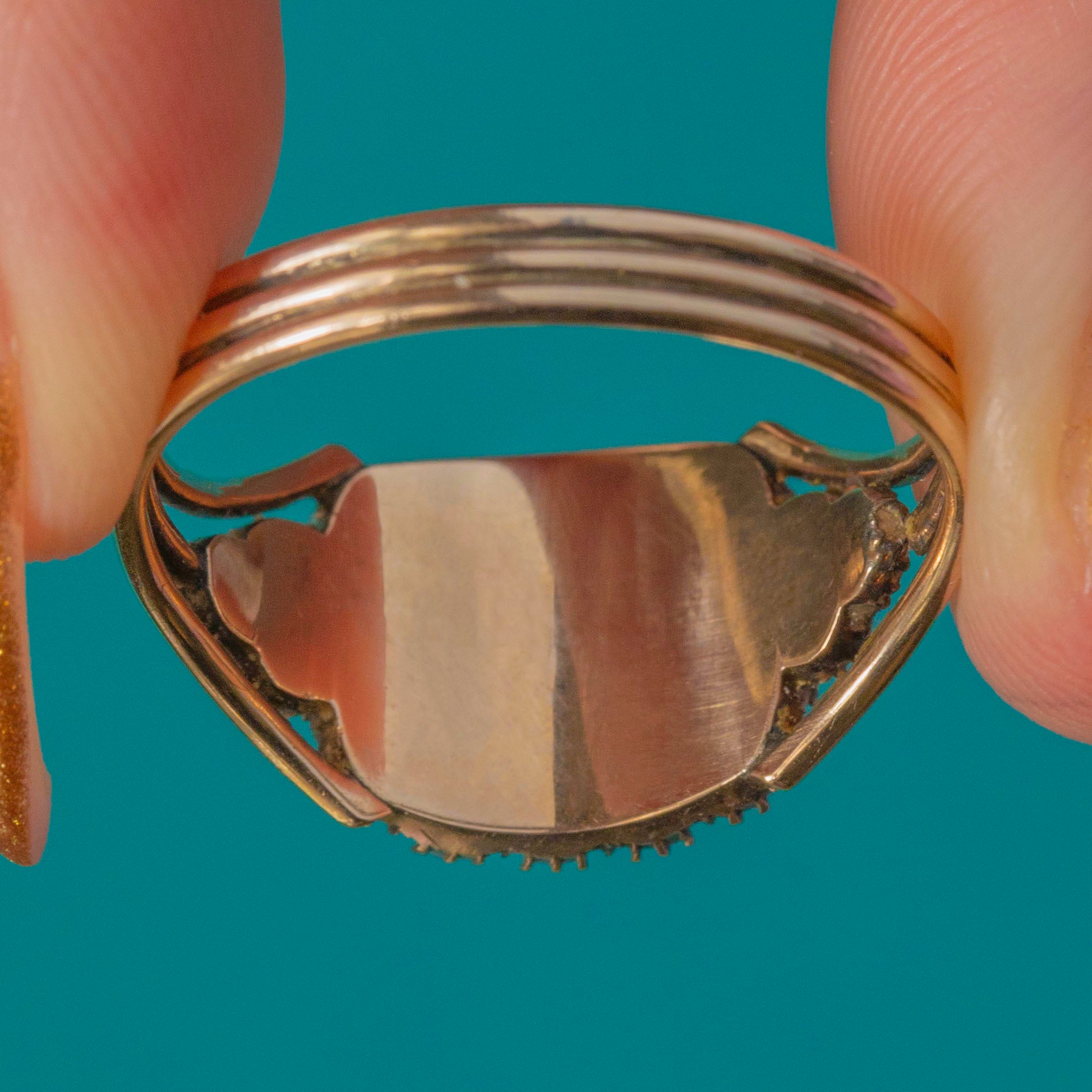The Garnet’s smooth, domed cut radiates warmth and depth, beautifully complemented by the soft lustre of the Pearls in a rich 9ct Gold setting. A fine example of early 19th-century design with typically elegant split-prong shoulders, this ring embodies the undeniable romance and craftsmanship of the Georgian era.