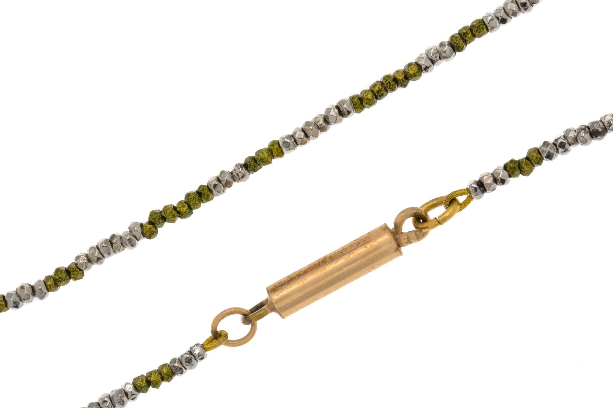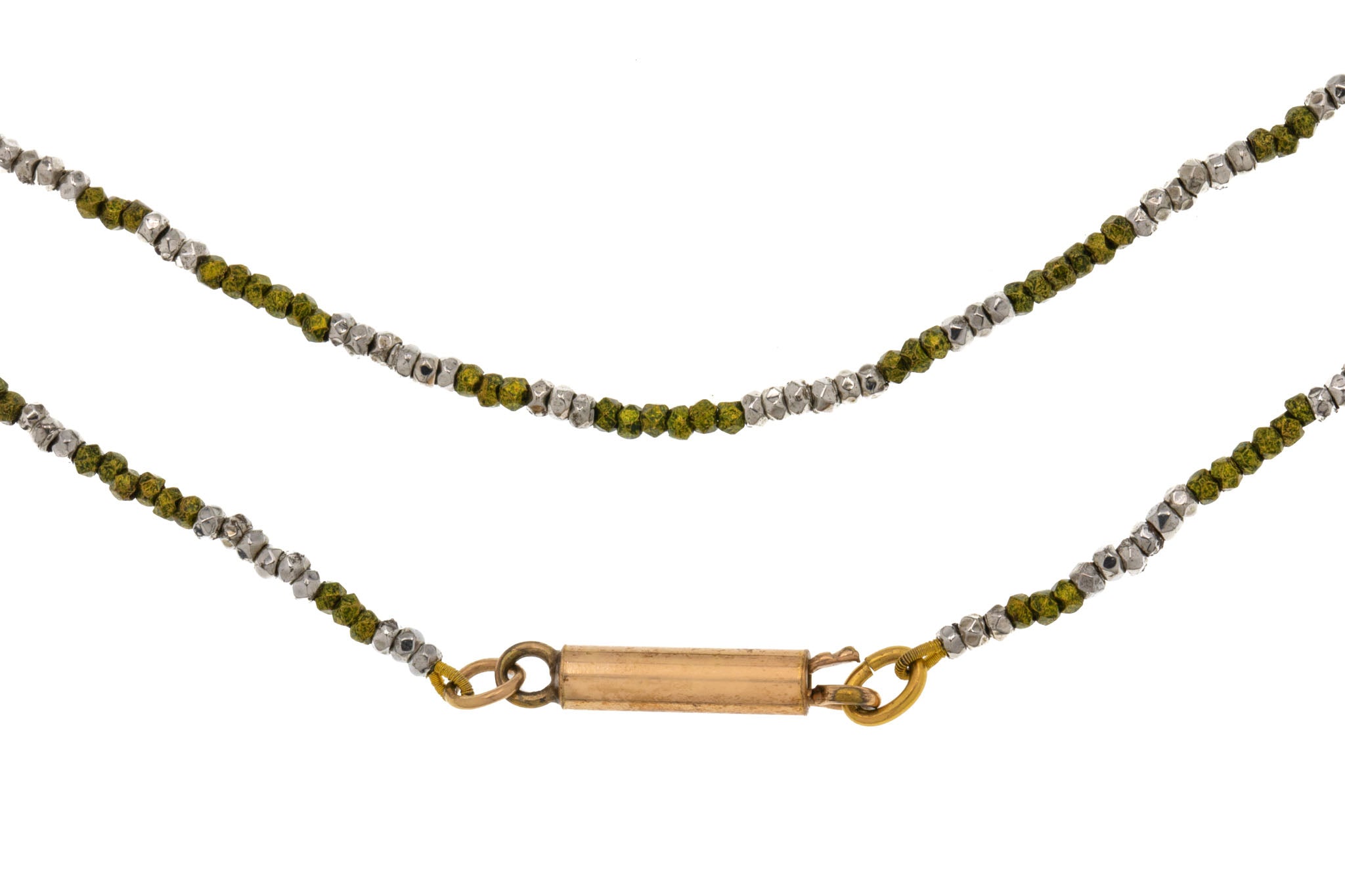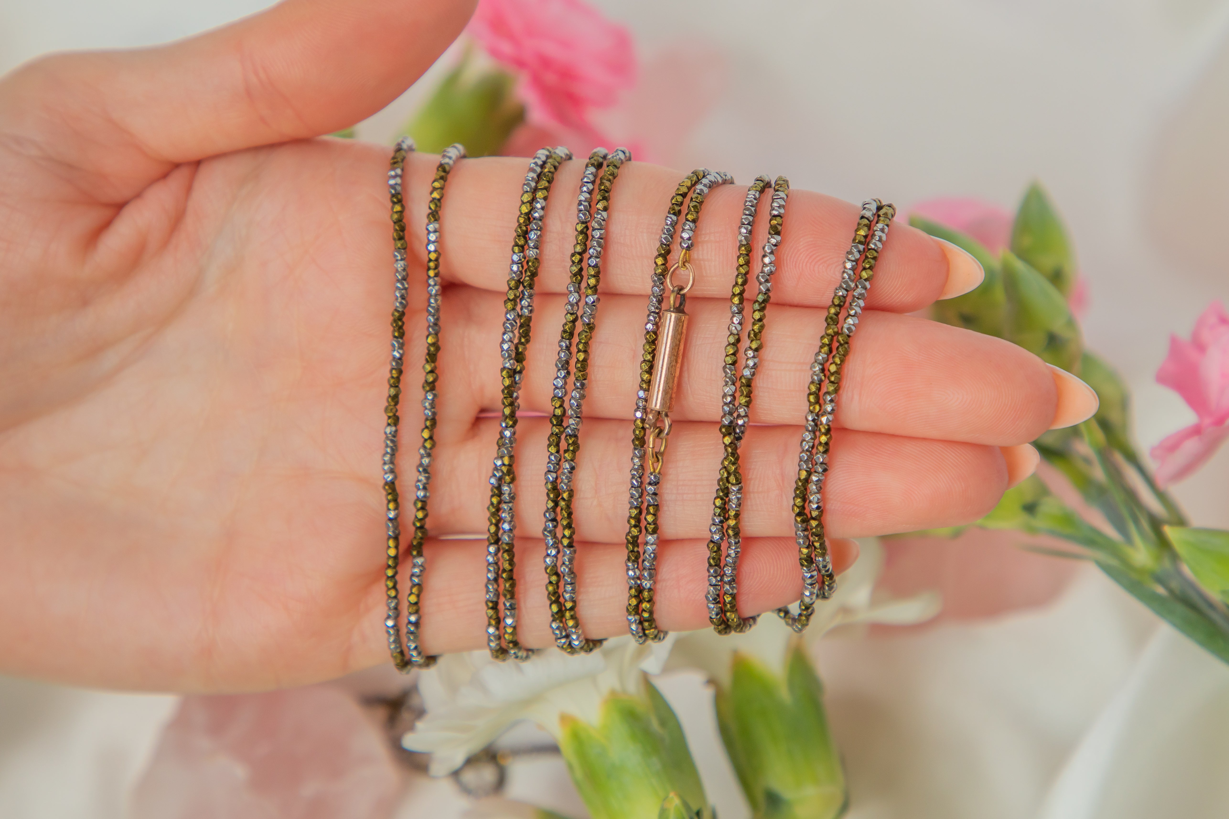 Let this rare, long Georgian Cut Steel beaded necklace do all the talking! With alternating glistening silver and olive-green Cut Steel beads, every inch of this piece exudes Georgian glamour.