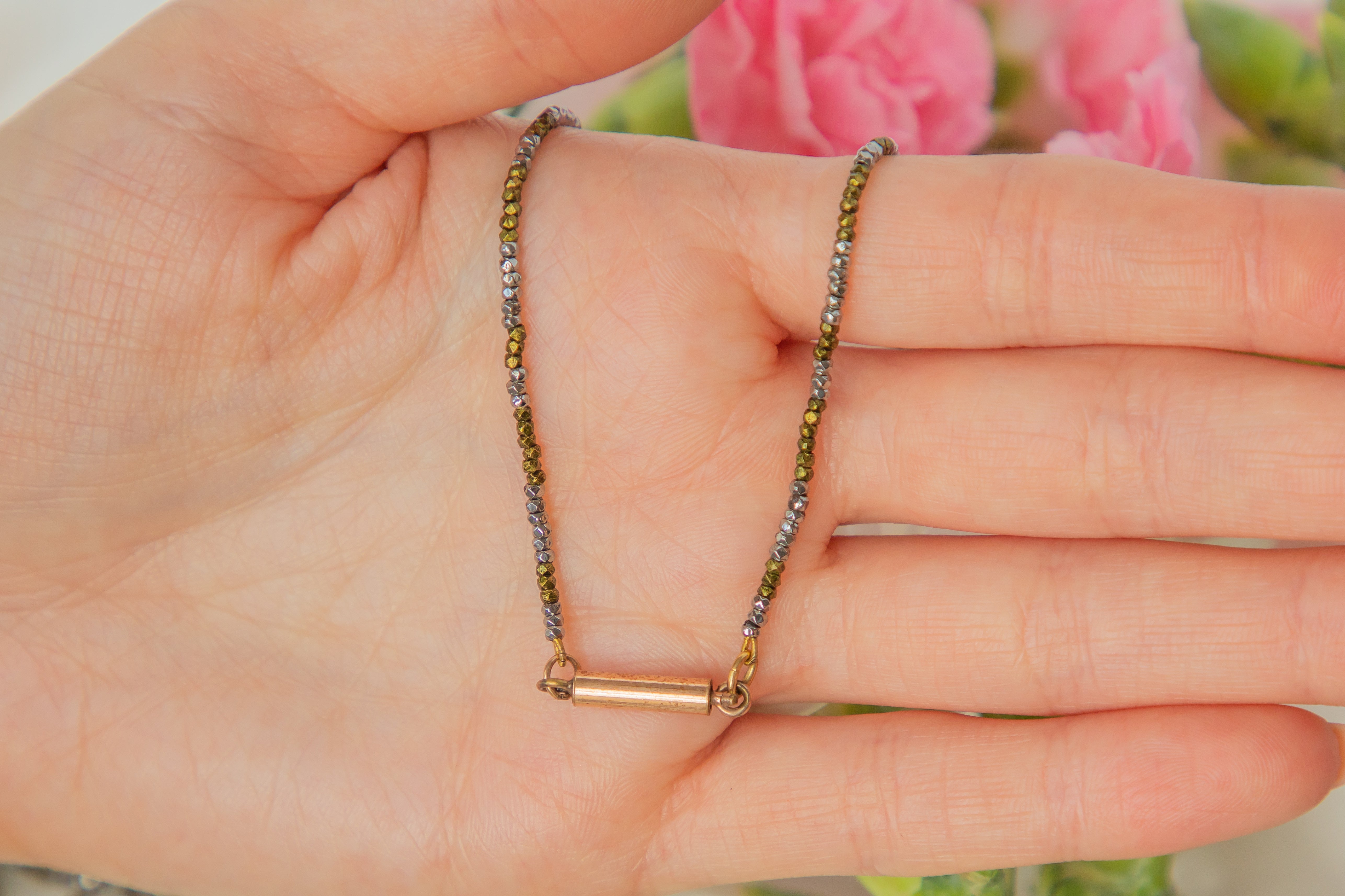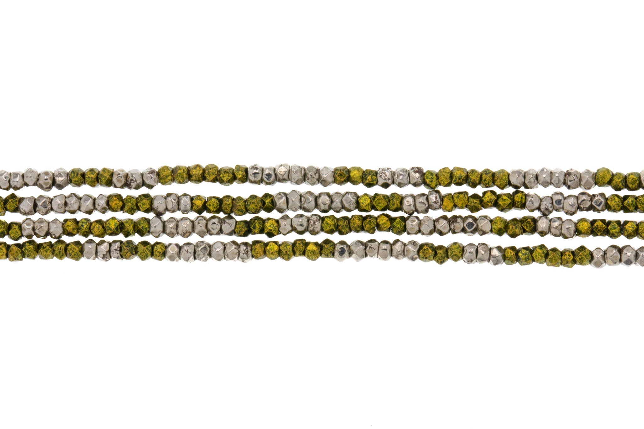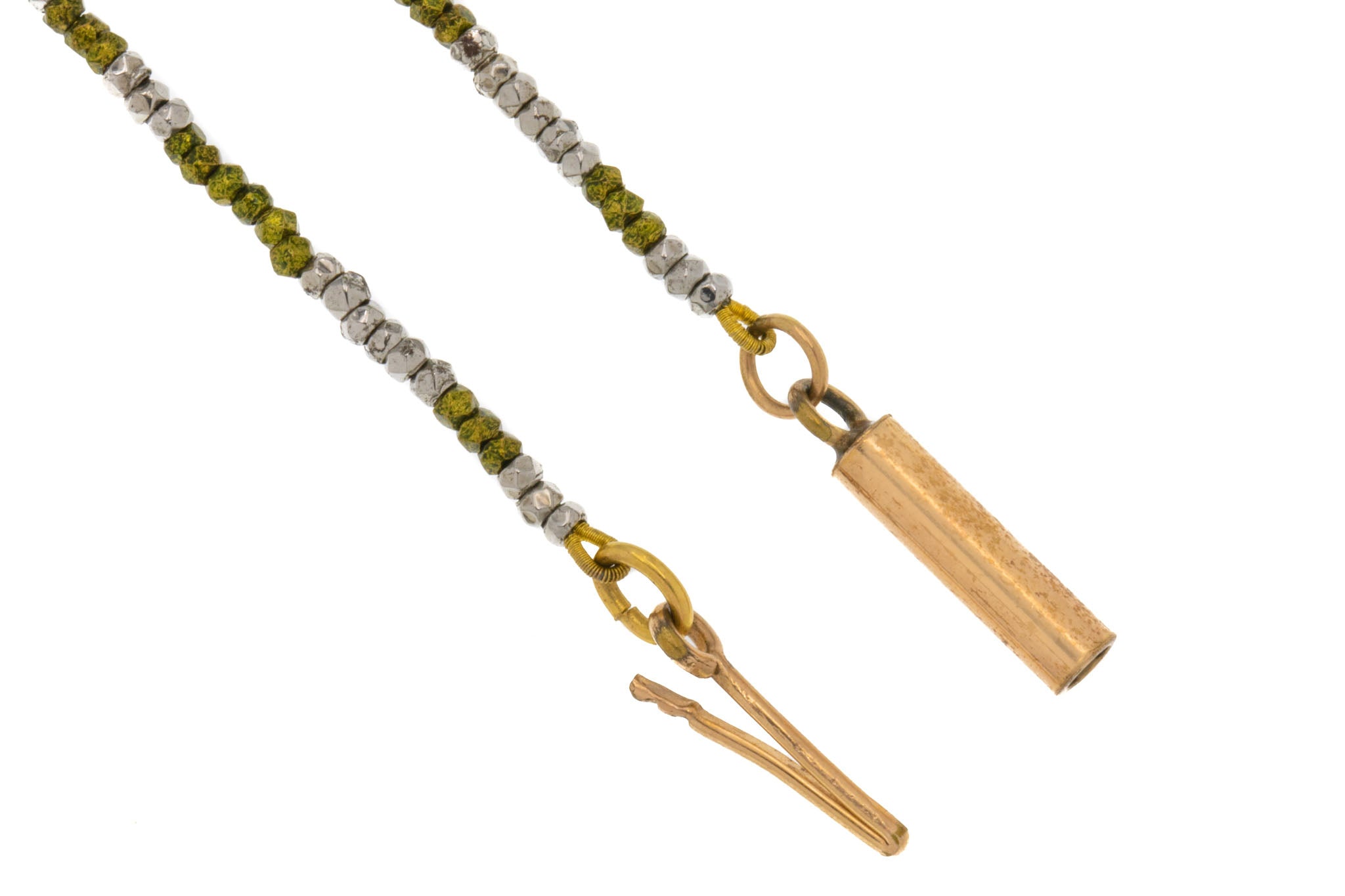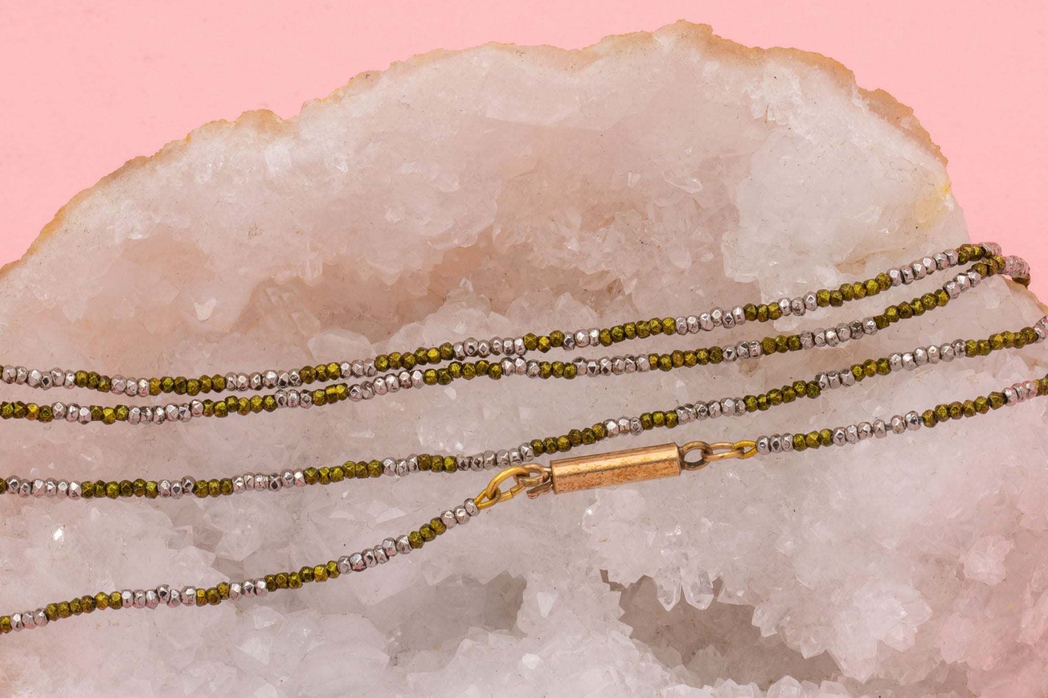 Let this rare, long Georgian Cut Steel beaded necklace do all the talking! With alternating glistening silver and olive-green Cut Steel beads, every inch of this piece exudes Georgian glamour.