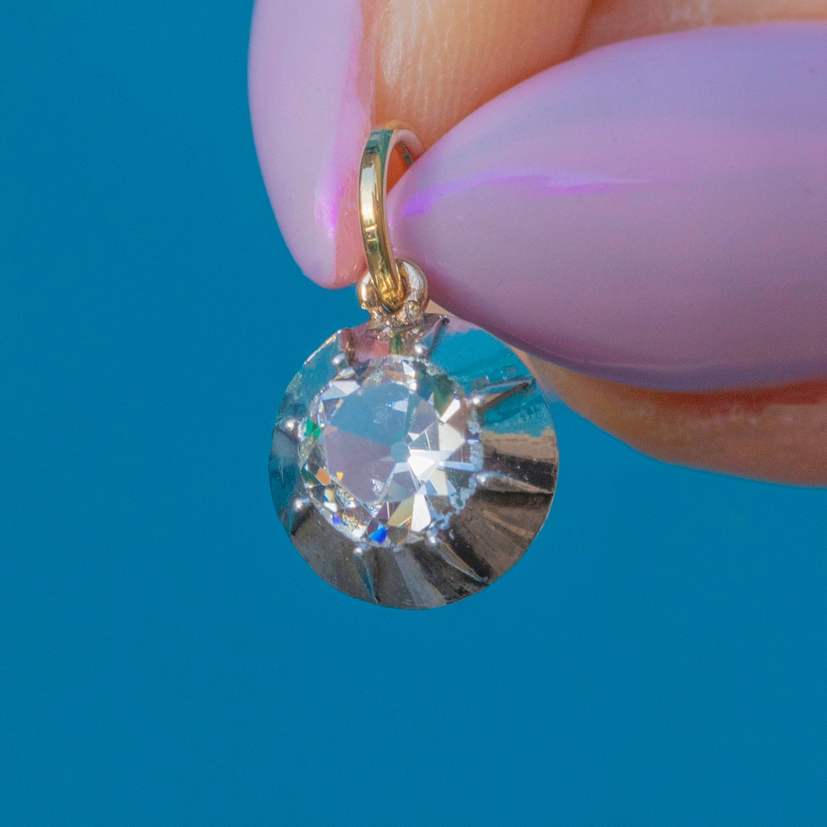 A charming Georgian-era Paste pendant with a bright hand-cut white stone displayed in a radiating piecrust setting. Crafted in Silver with warm 18ct Gold, it delivers that convincing antique “Diamond” sparkle—perfect for a fine chain or a curated charm stack.