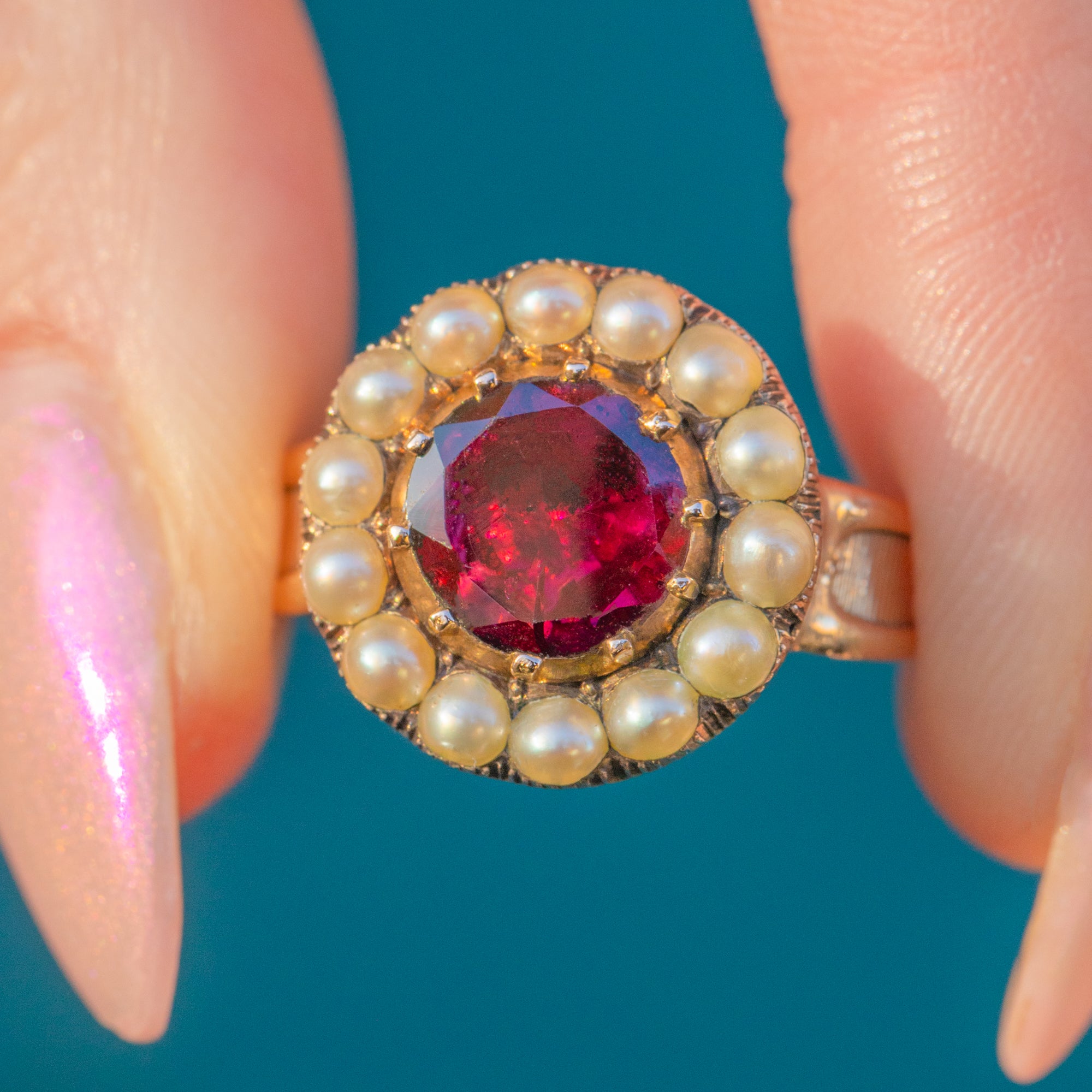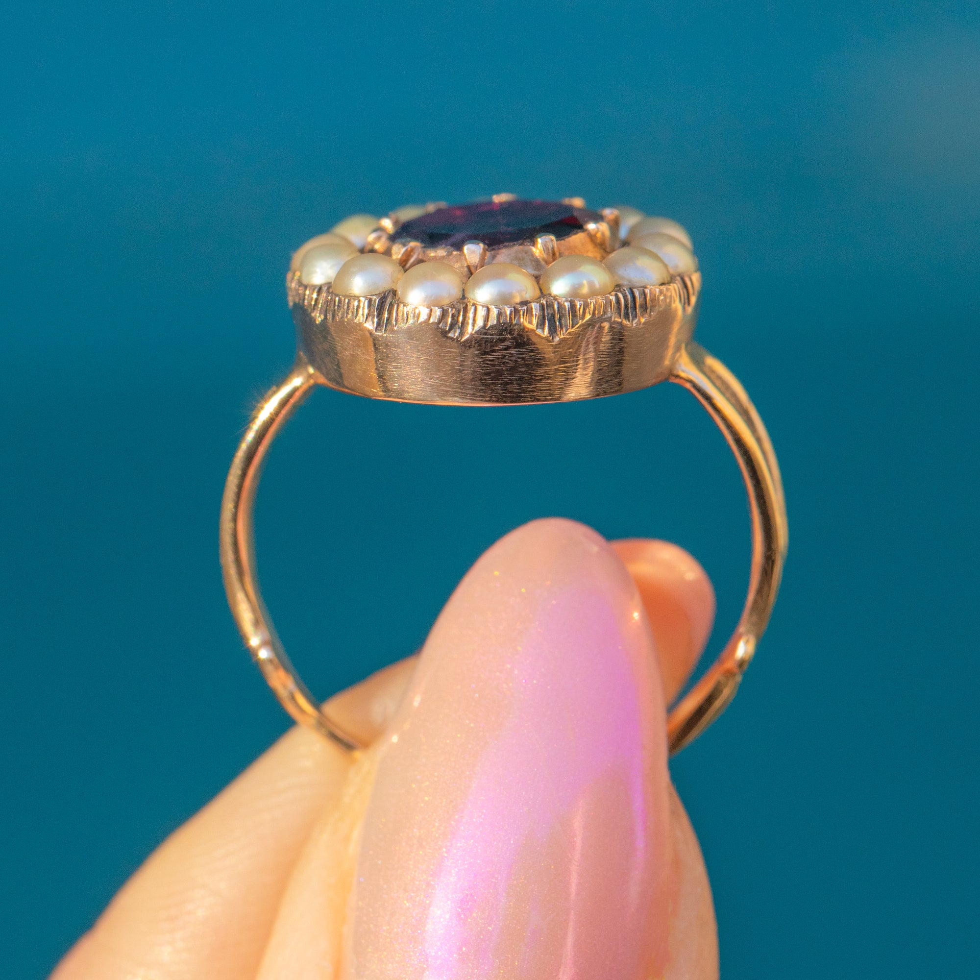 EXCELLENT. This Georgian foiled flat-cut Garnet Pearl cluster ring is in great condition. Her flat-cut Garnet exudes a delicious berry-red hue, perfectly complemented by lustrous Seed Pearls and buttery 15ct Gold band. This Georgian ring is ready for a new home and will make a pivotal addition to your collection!