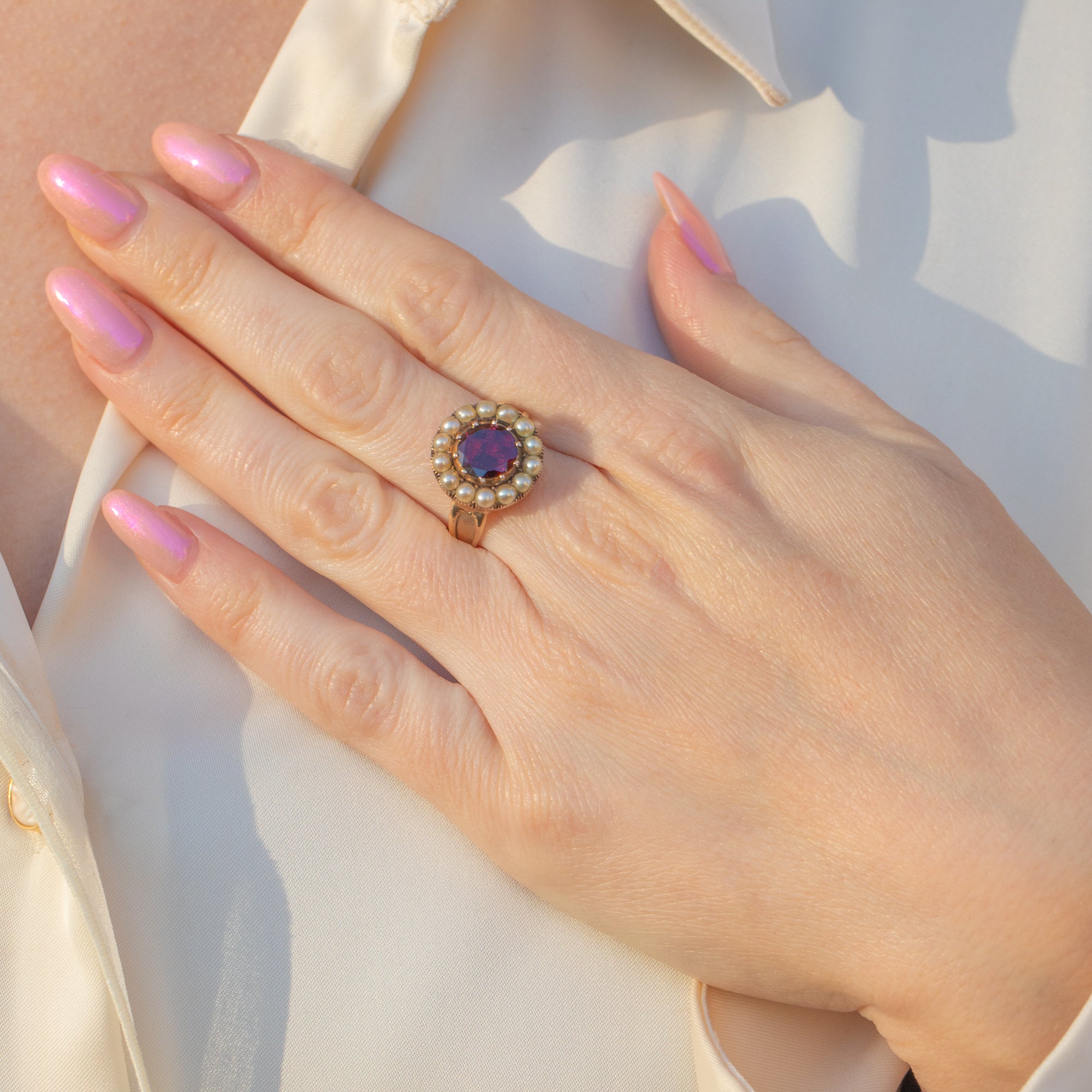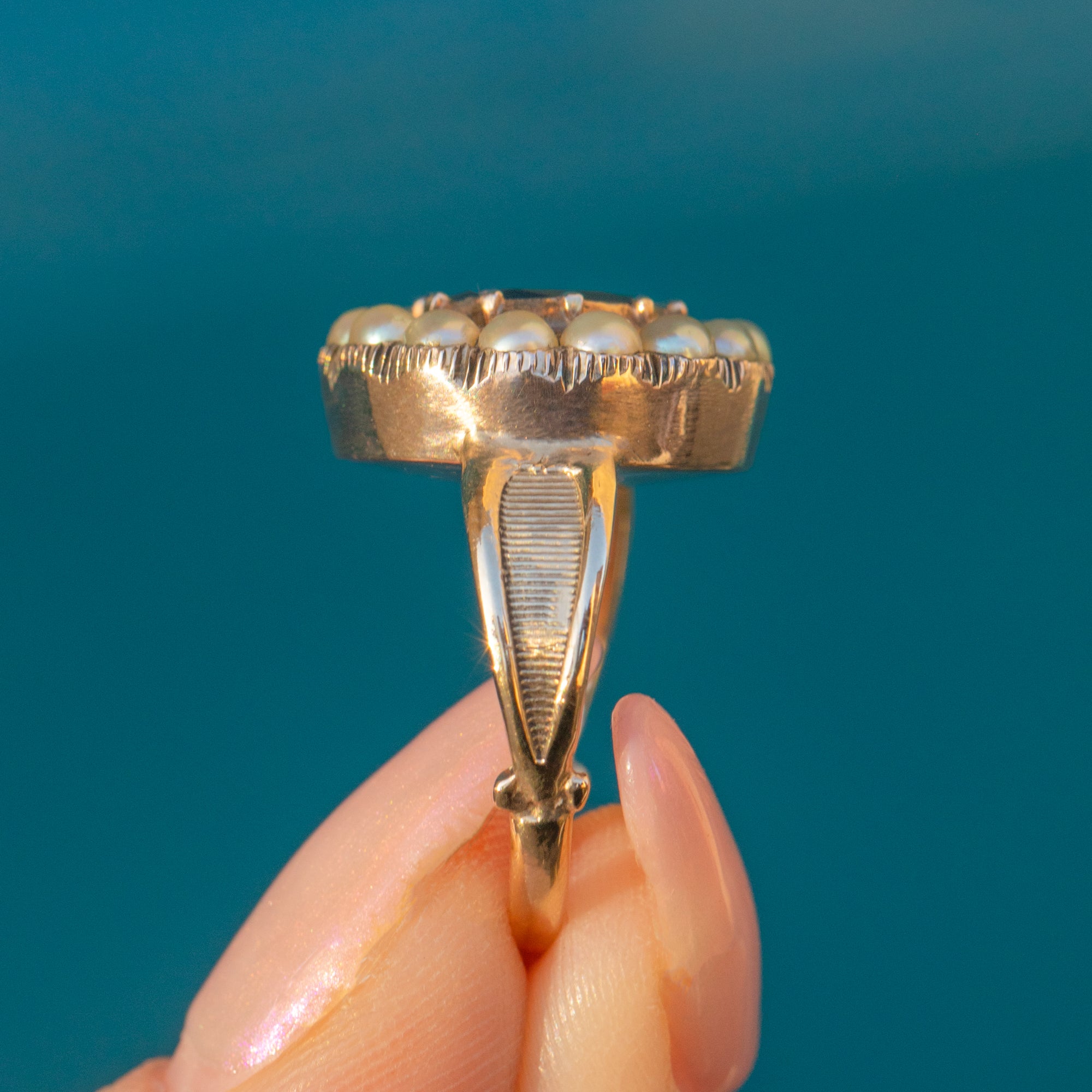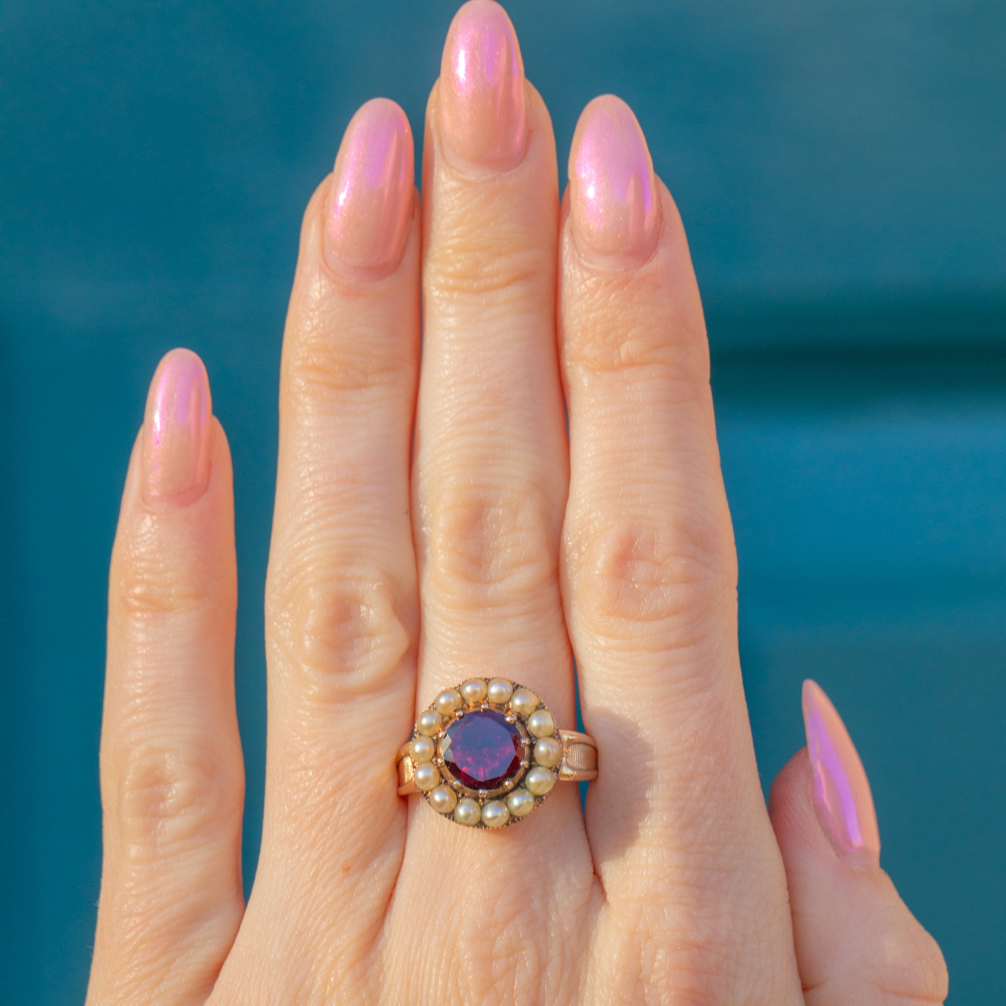 Boasting a fabulous merlot-hued 0.60ct flat-cut Garnet haloed by bright and luminous Pearls displayed in 9ct Gold with a rosy 15ct Gold band, this Georgian ring is an undeniably chic and feminine piece.