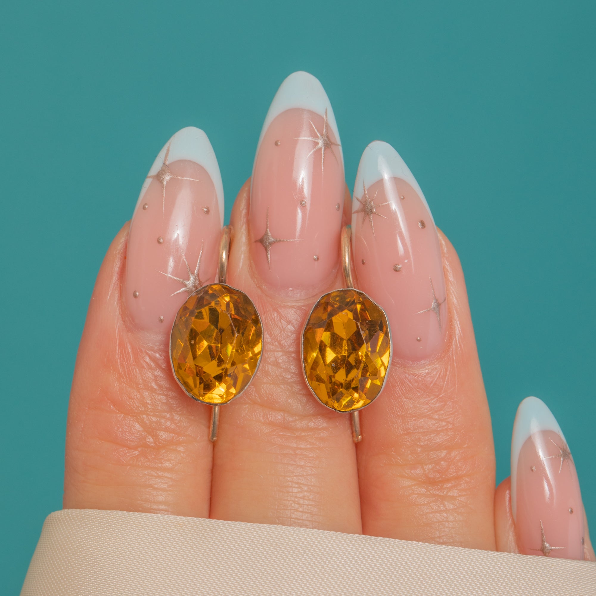 A sweet Georgian treasure, these petite drop earrings glow with foiled Yellow Paste in refined bezel settings. The oval stones radiate warm, Citrine-esque hues, their colour deepened by the traditional foil backing and framed by smooth rubover bezels for a refined, gem-forward look.