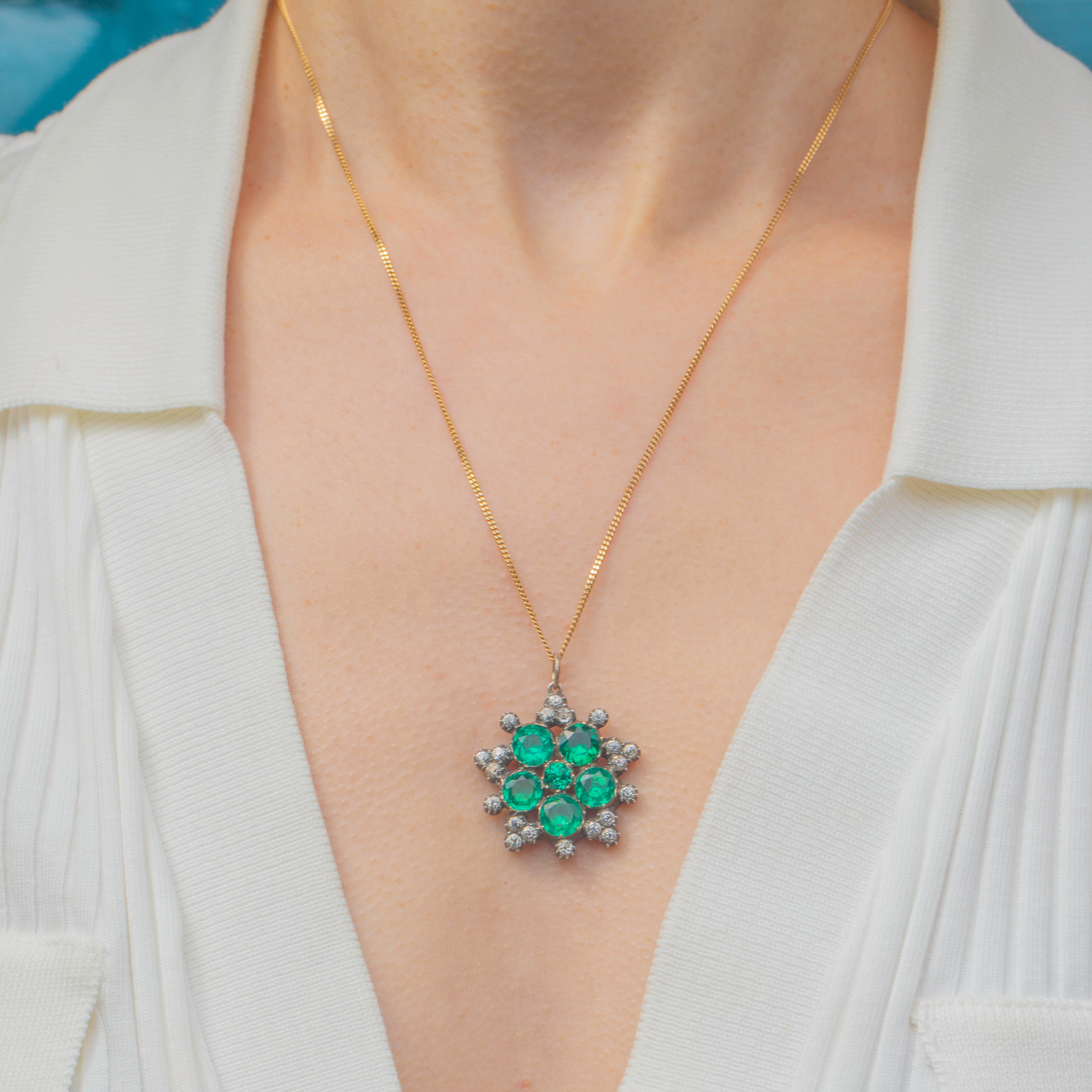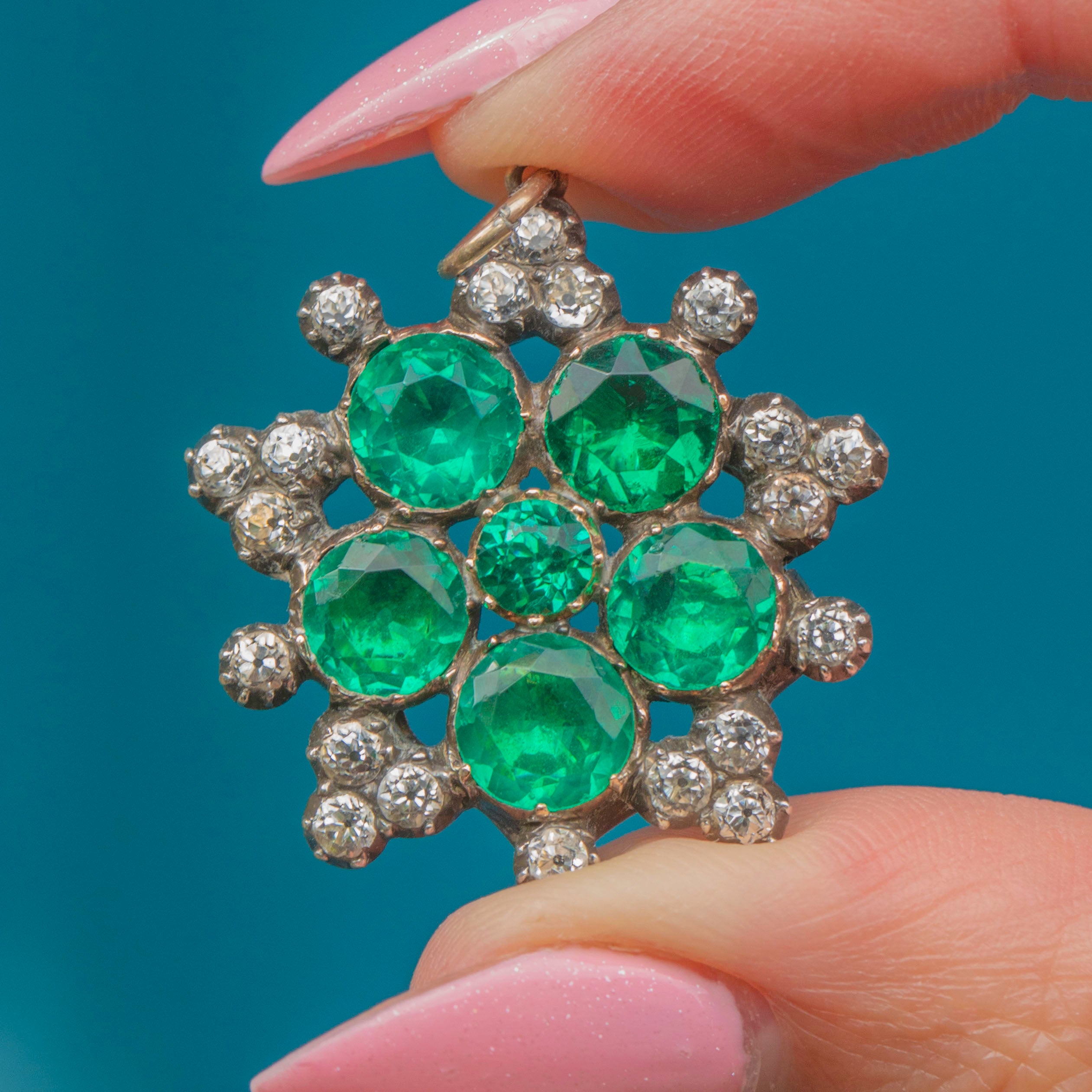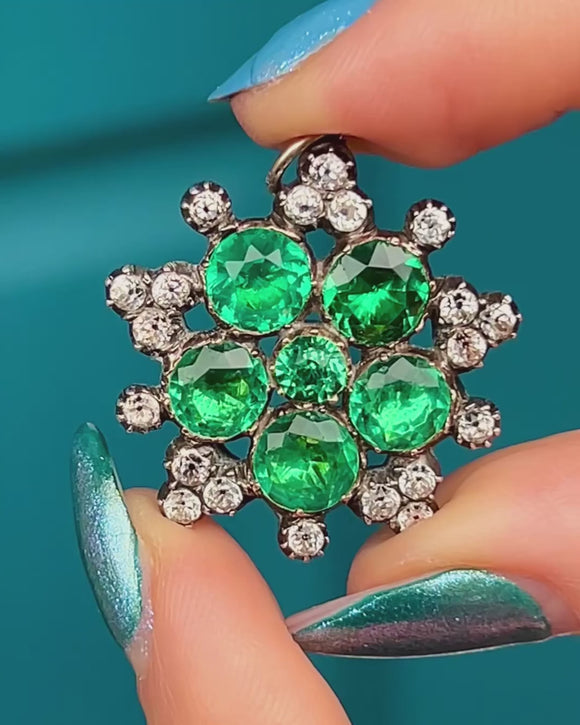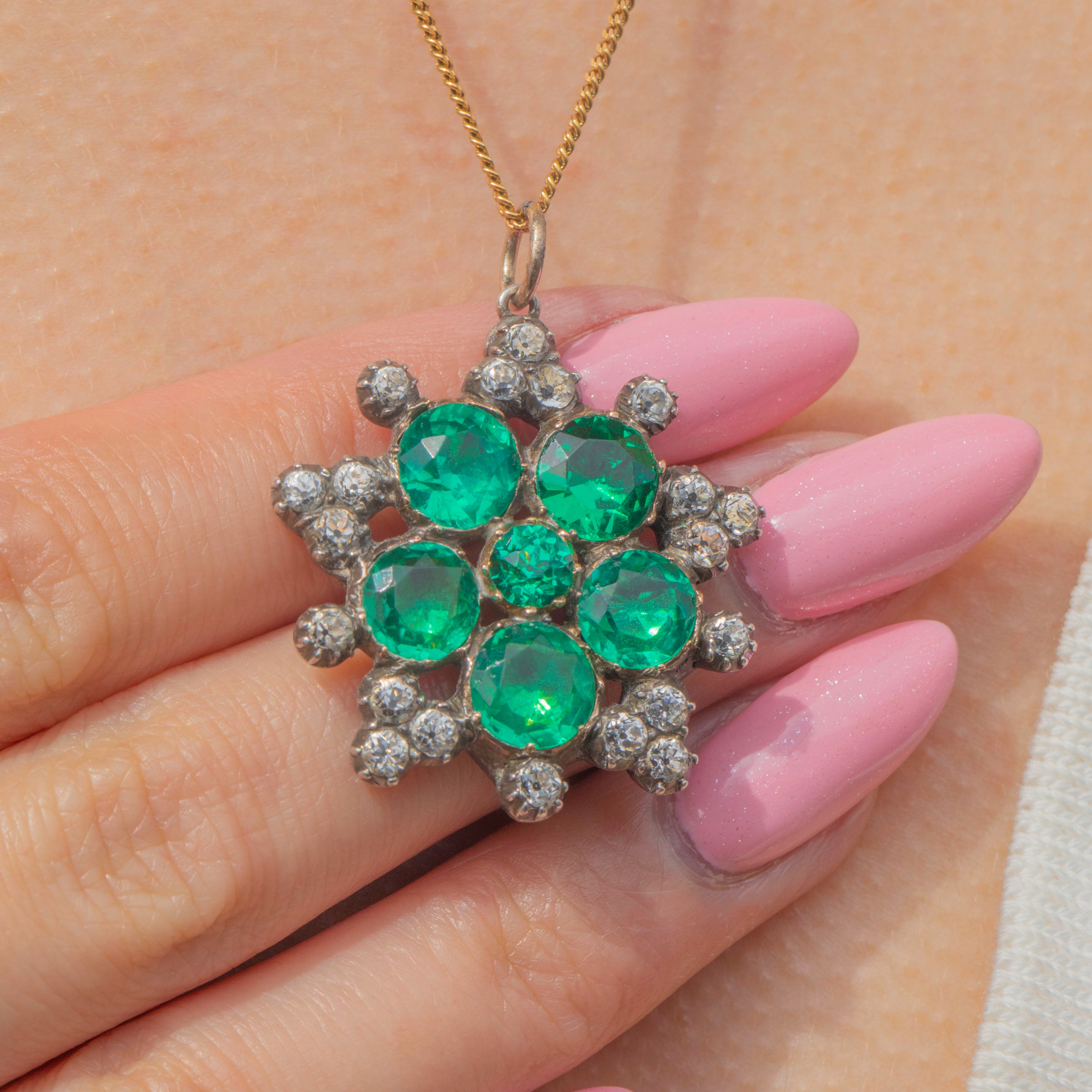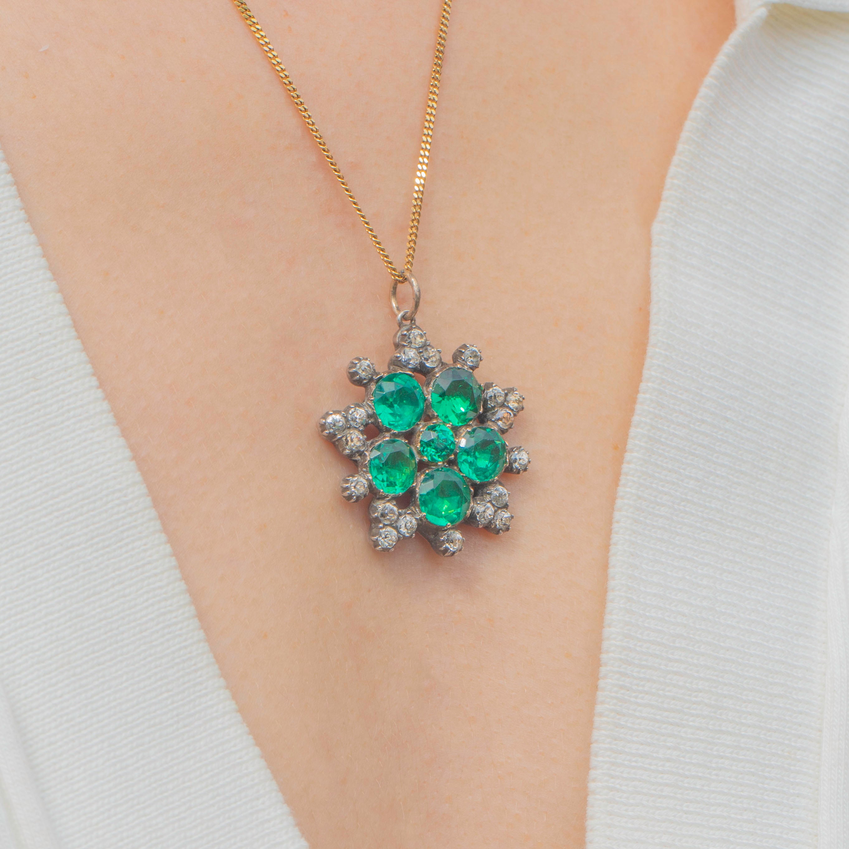 This Georgian green & black dot Paste cluster pendant will add a vibrant flourish to your décolletage! Finely crafted from solid Silver and backed with 9ct Gold, this Georgian pendant boasts a floral cluster of Emerald Paste in the centre bordered by bright Diamond Paste, all foiled crisply faceted to catch the light magnificently.