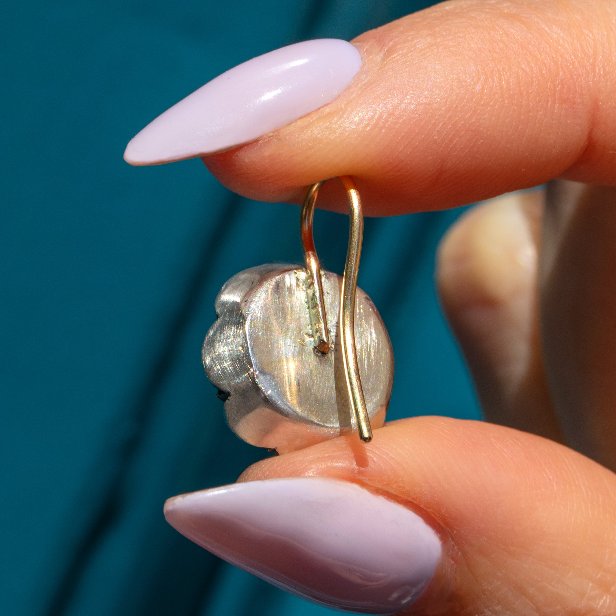 VERY GOOD. These Georgian Paste flower cluster earrings are in very good condition. The Paste are all secure and form well proportioned clusters. There is some wear running along the edge of the facets, but this does not affect their overall beauty. Likewise the Sterling Silver has some wear but as this is to the back it cannot be seen when worn. With secured 15ct Gold hooks, you can wear these Georgian earrings with the utmost confidence!