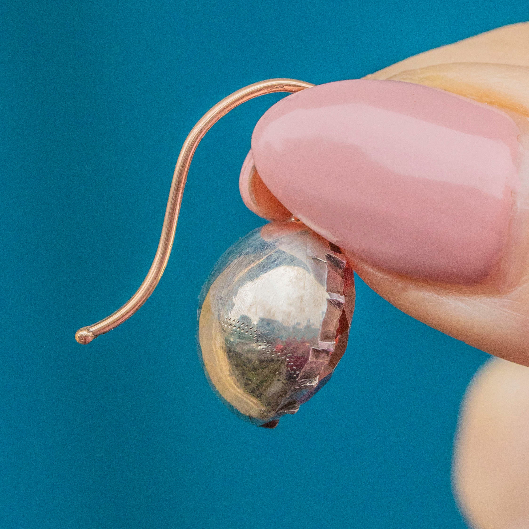 VERY GOOD-EXCELLENT. These Georgian Pink Paste button drop earrings are in wonderful condition, especially when considering their age! The Paste are fabulous with crisp facets, free from any chips or scuffs. The Silver is lustrous and has accrued a light patina adding to their antique charm. There are a few dings on the back of the earrings, but this is merely aesthetic and cannot be seen when the earrings are worn. The 9ct Gold hooks are sturdy, allowing you to wear these eye-catching Georgian Paste earrings with absolute confidence!