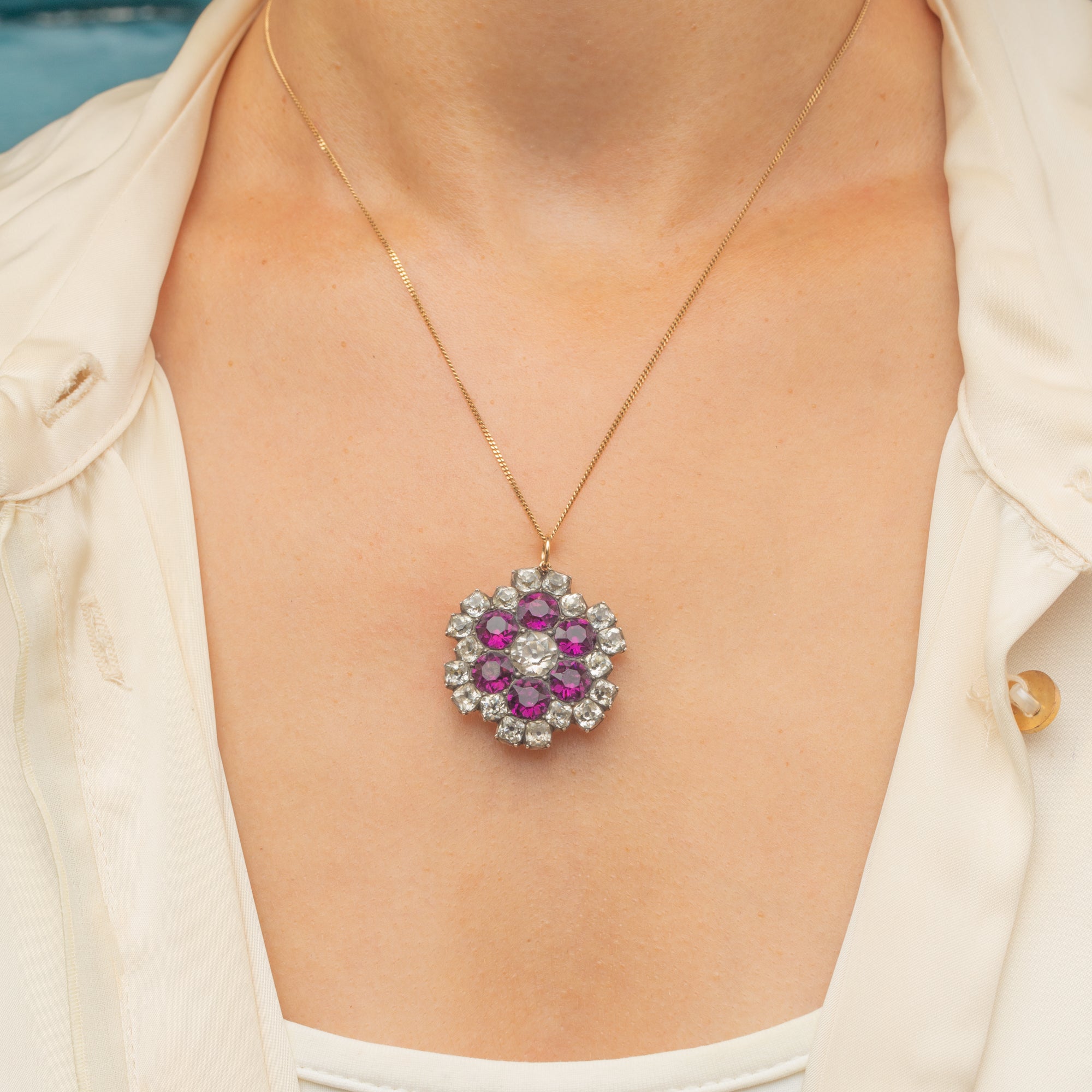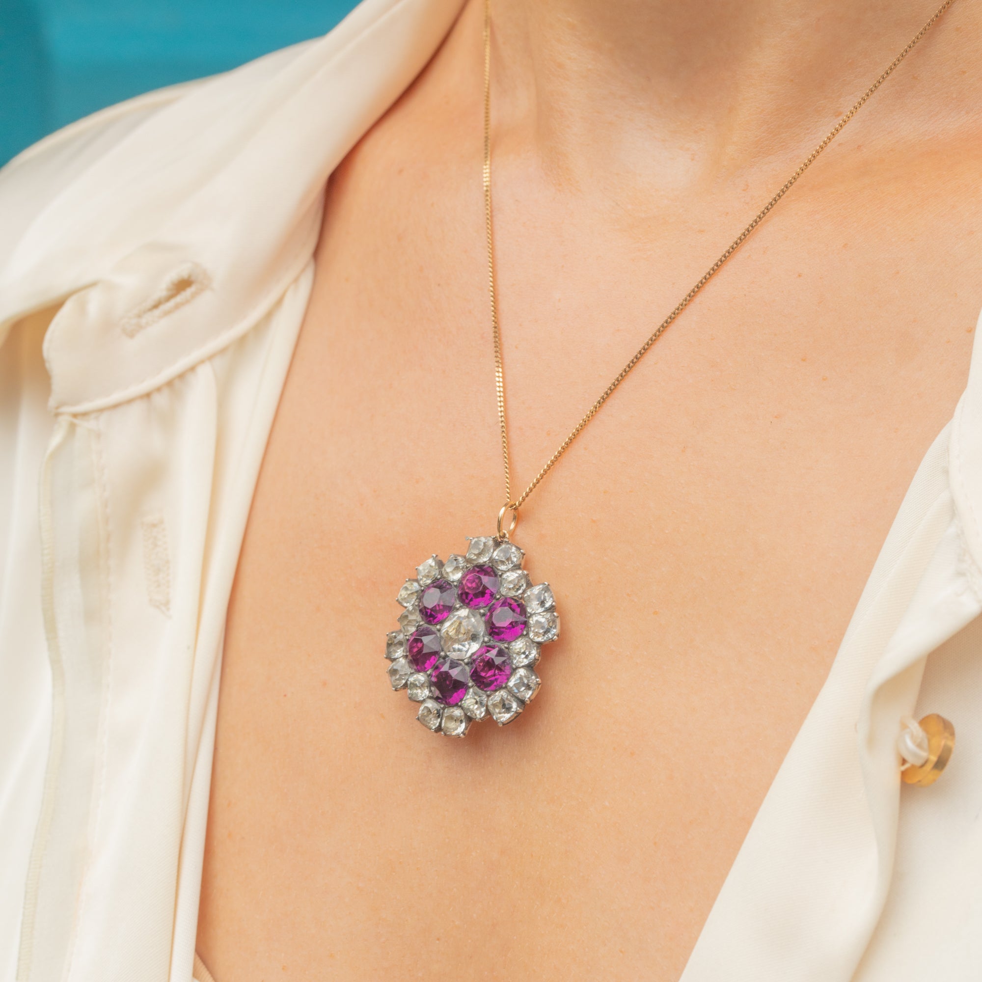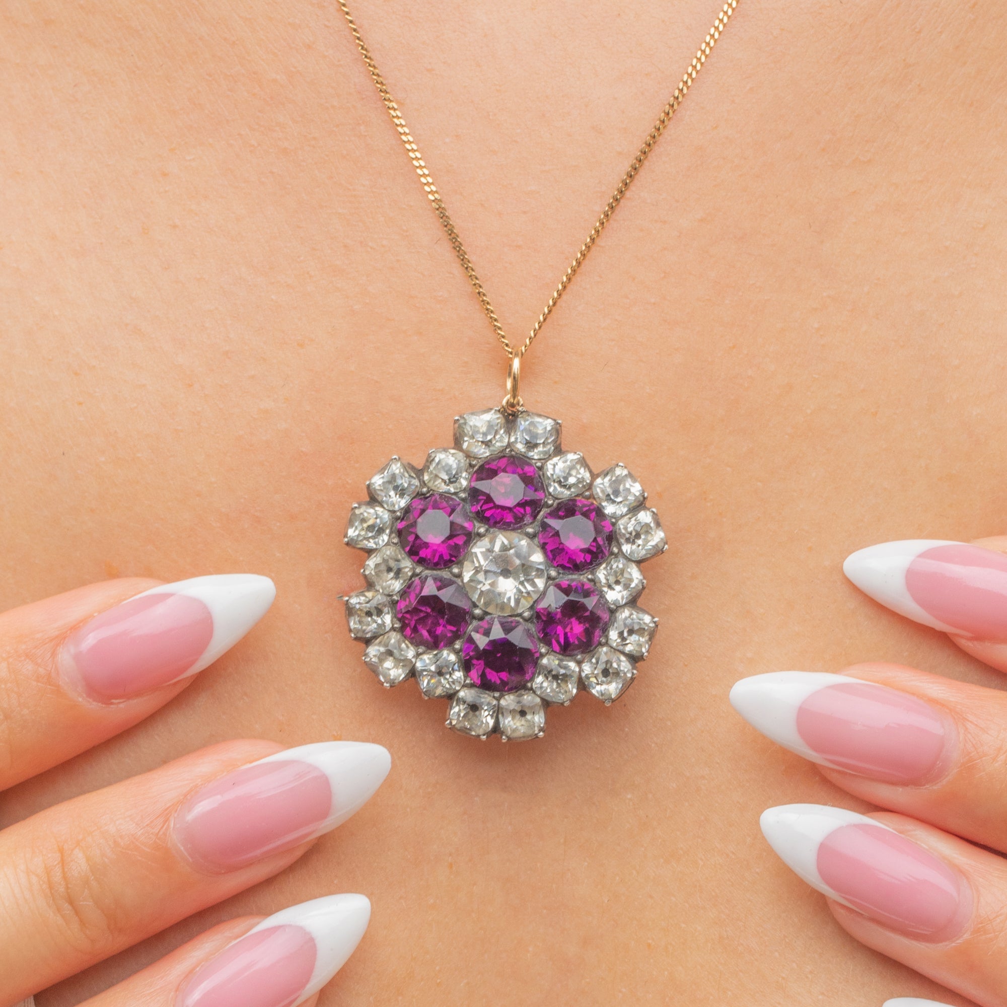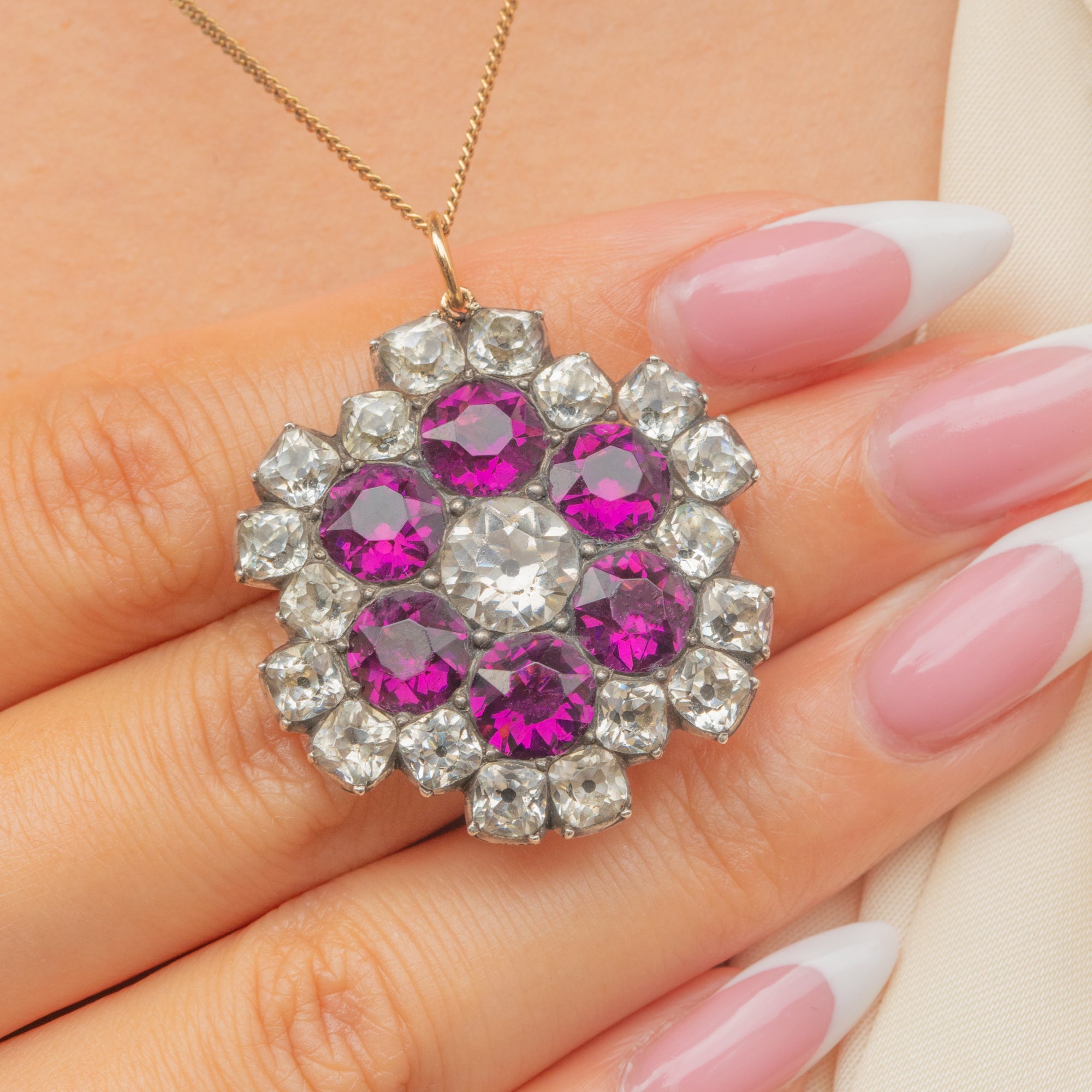 A charming Georgian flower pendant dating circa 1800–1820, set with vibrant Purple and White Paste stones in a delicate floral arrangement.