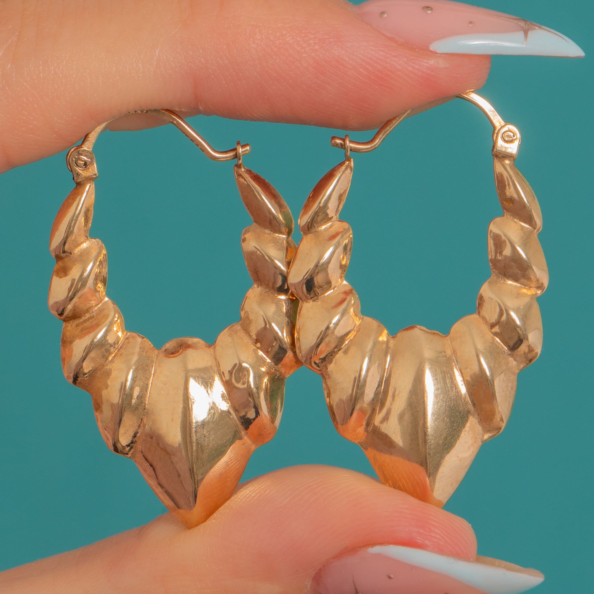 Architectural and effortlessly chic, these Vintage 9ct Gold “Wings” hoop earrings embody the sleek geometry of the 1990s. Their sculptural creole silhouette flares into softly ridged wing-like contours, finished with a mirror-bright polish that catches the light beautifully.