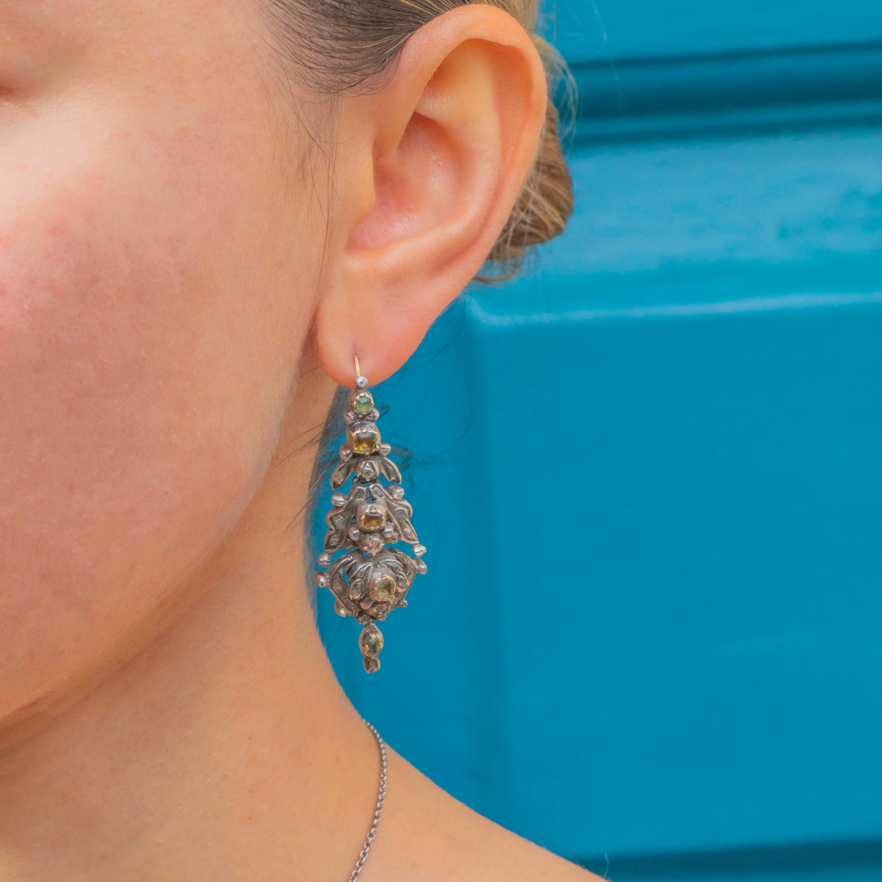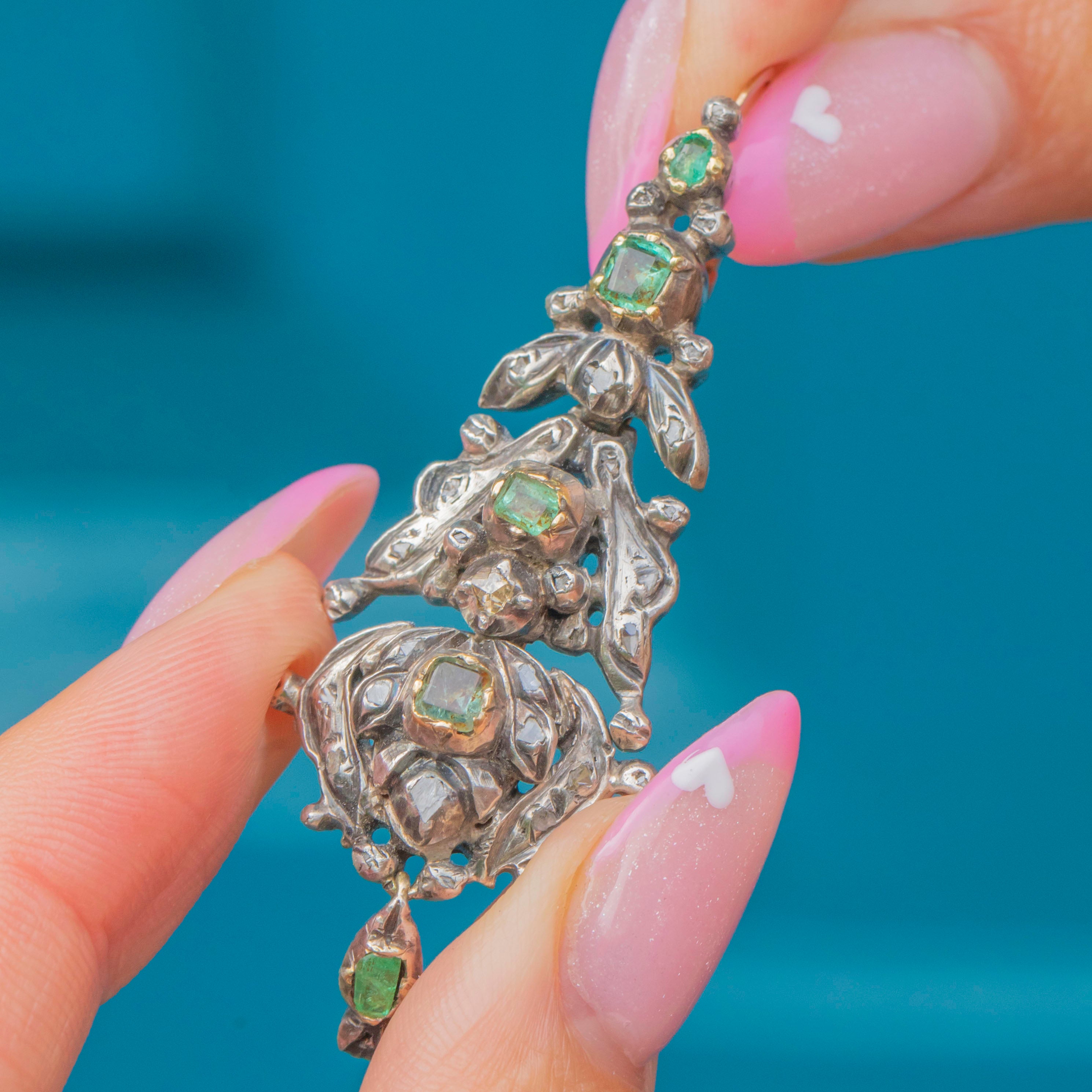 A sumptuous Georgian cascade, these Iberian Emerald and Rose-Cut Diamond drop earrings exude theatre and romance. Crafted in Silver backed with 9ct Gold, each earring is composed of three articulated tiers of openwork foliate motifs, culminating in a delicate pear drop that dances with every movement.