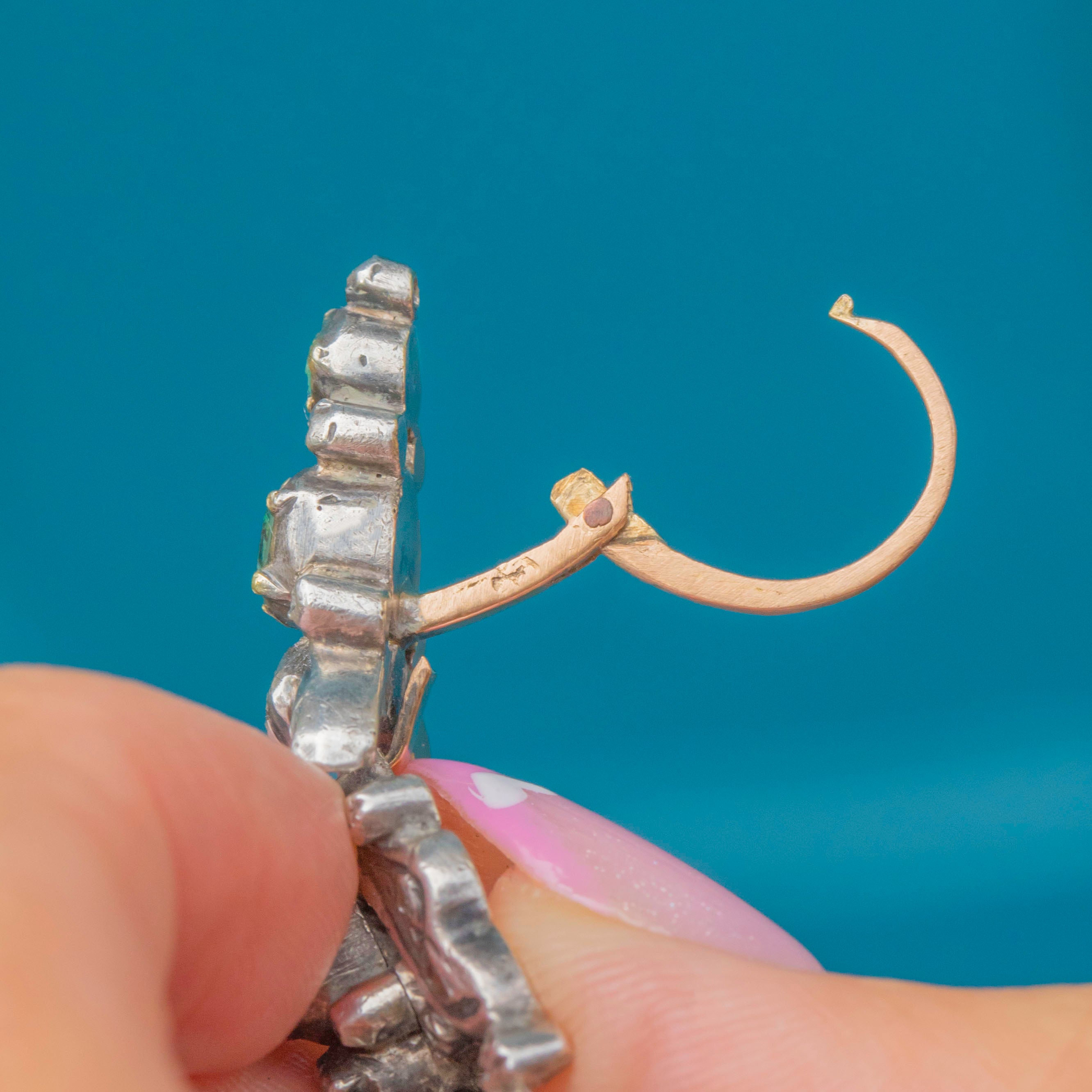Verdant Emeralds glow with lively green tones, accented by the soft scintillation of antique Rose-Cut Diamonds in closed-back collet settings. The intricate repoussé-style detailing and gentle patina speak to Georgian craftsmanship, while 9ct Gold hooks offer an elegant finishing touch.