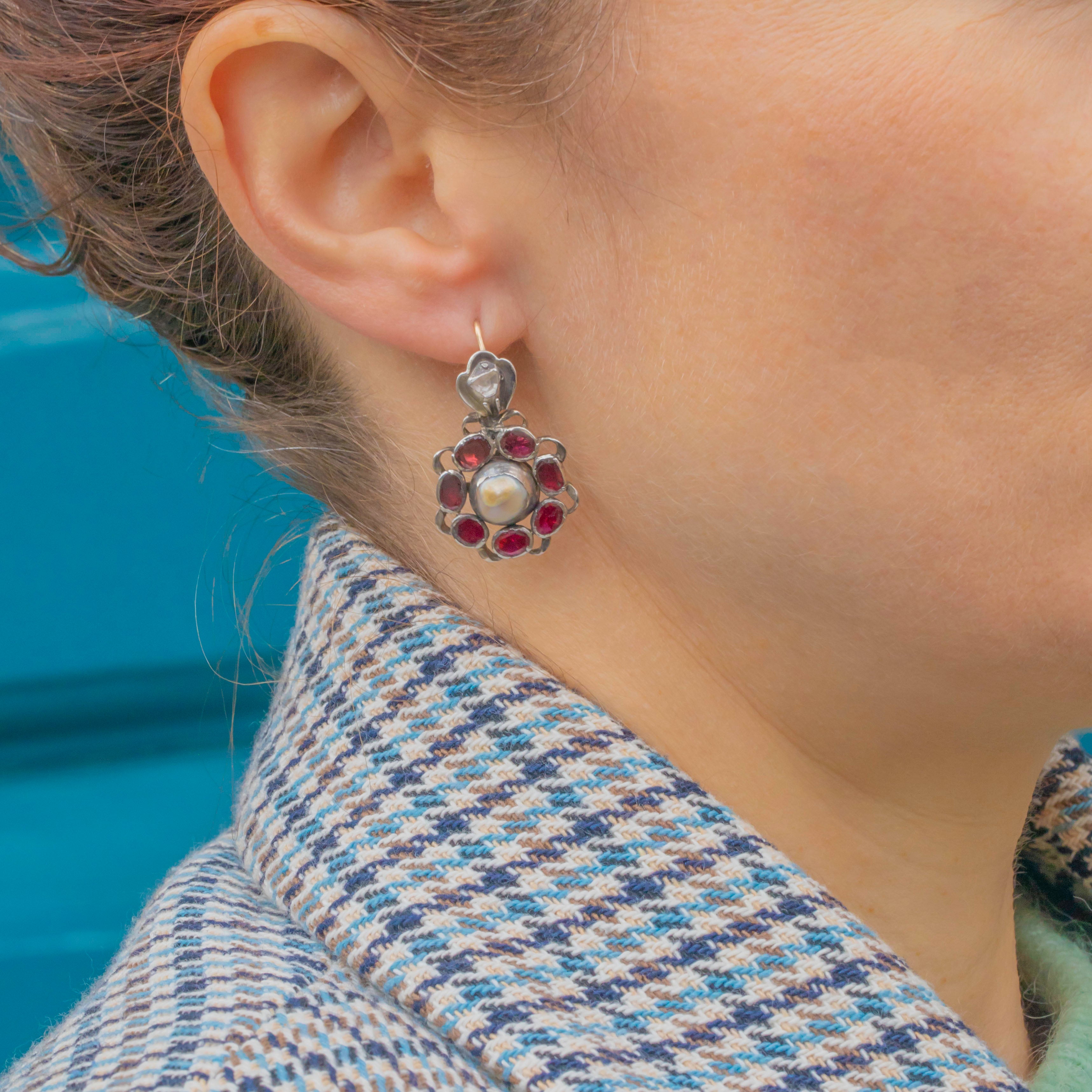 GOOD: The Pearls show visible wear and age, and the Silver displays surface wear consistent with their 18th-century origin. The Garnets and Diamonds are secure and retain strong colour and sparkle. A very rare and characterful pair of Georgian Iberian earrings.