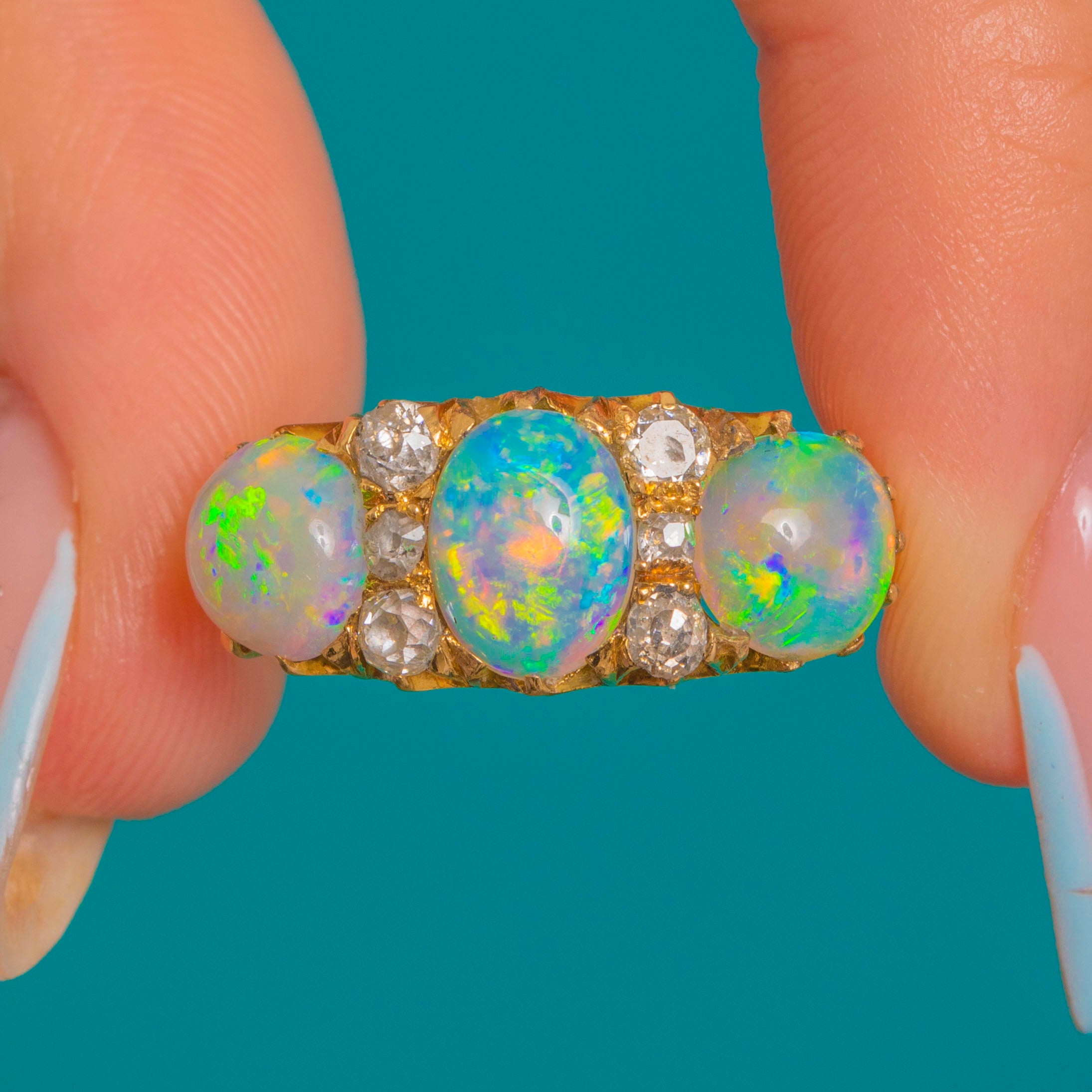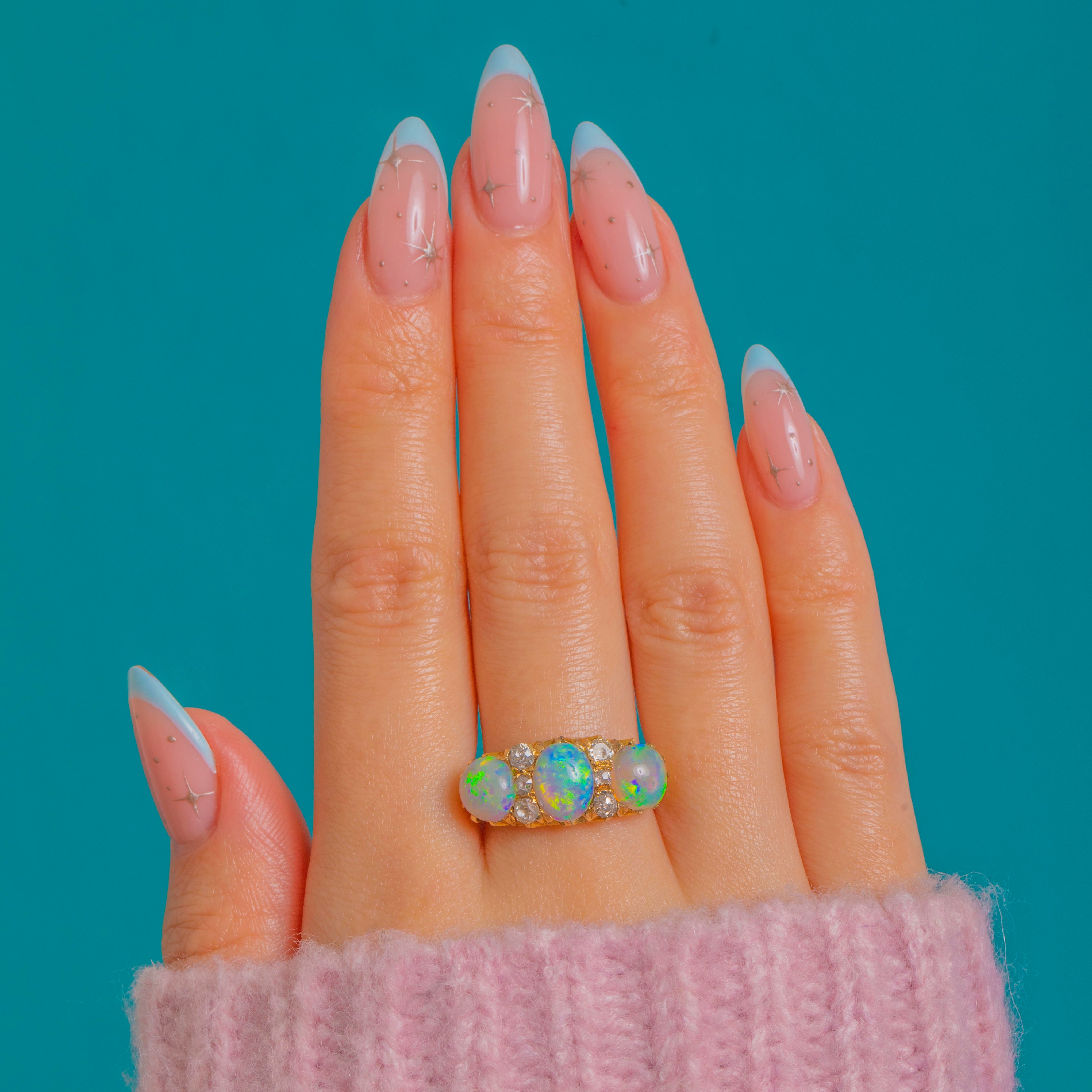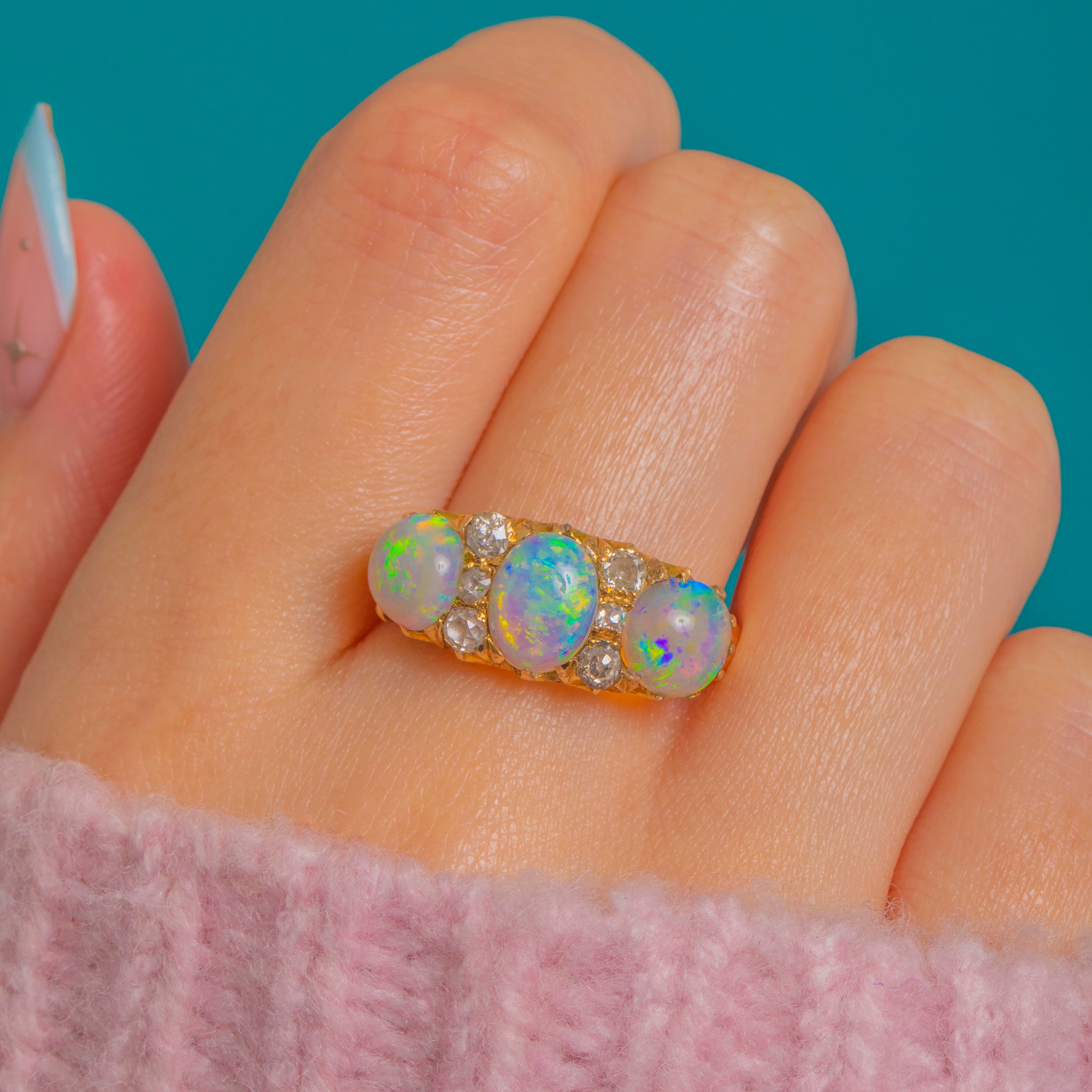 This impressive Victorian Opal and Diamond ring is a breathtaking example of late 19th-century craftsmanship. The three natural, solid Opals display exceptional colour play—flashes of green, blue, yellow and orange shimmer across their surfaces with every movement, creating a vivid, electric glow.