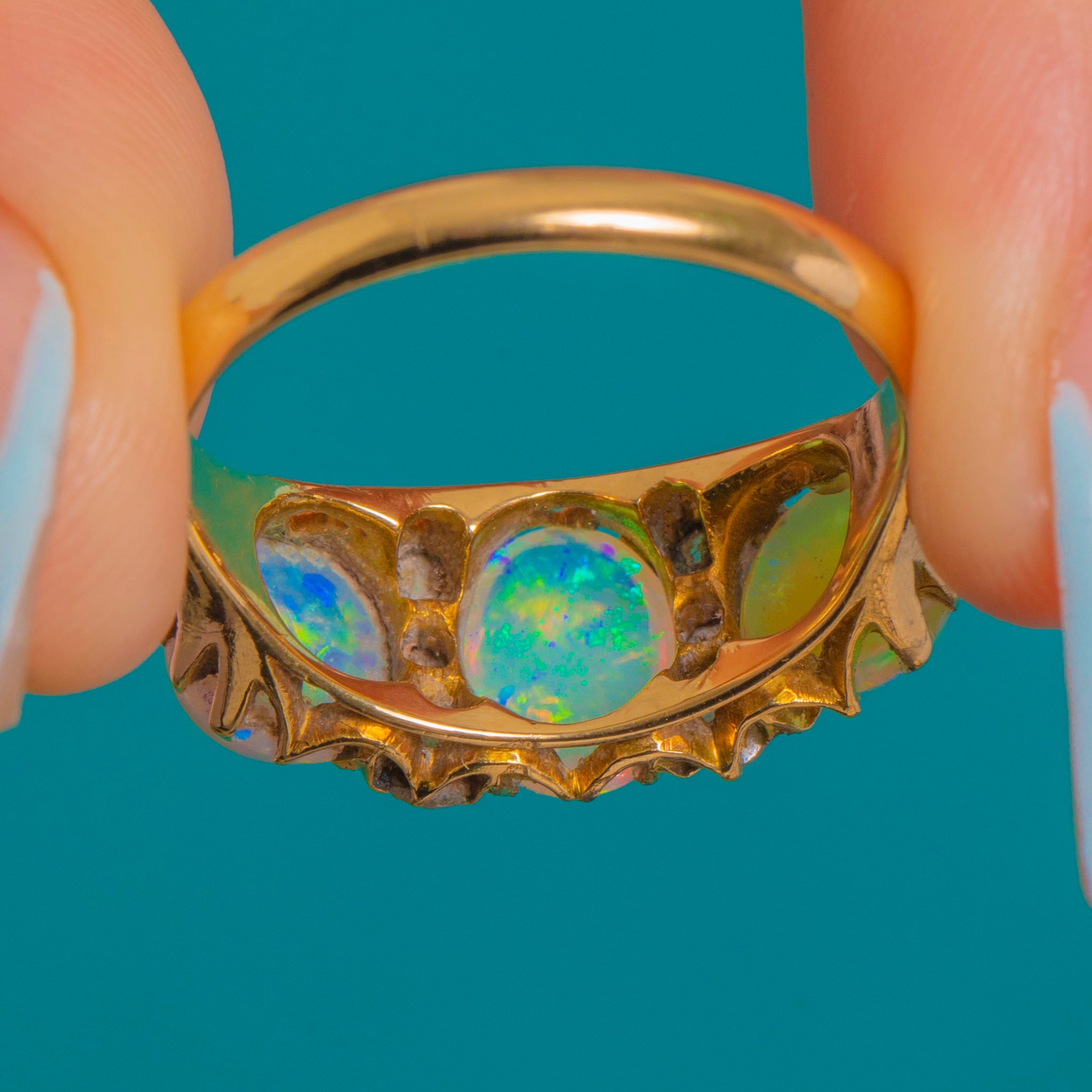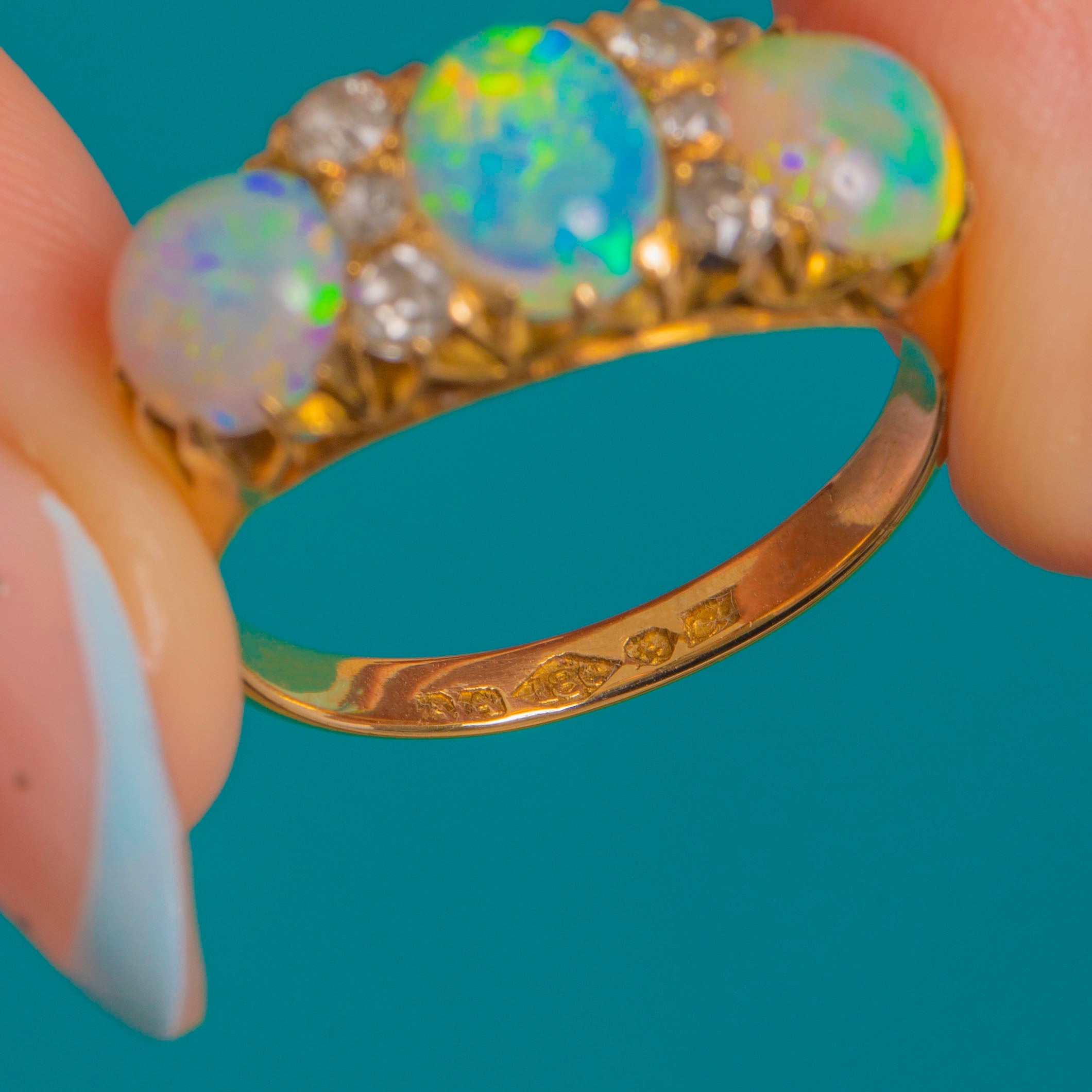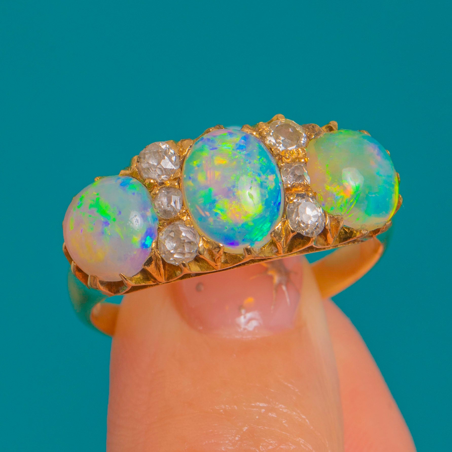This impressive Victorian Opal and Diamond ring is a breathtaking example of late 19th-century craftsmanship. The three natural, solid Opals display exceptional colour play—flashes of green, blue, yellow and orange shimmer across their surfaces with every movement, creating a vivid, electric glow.
