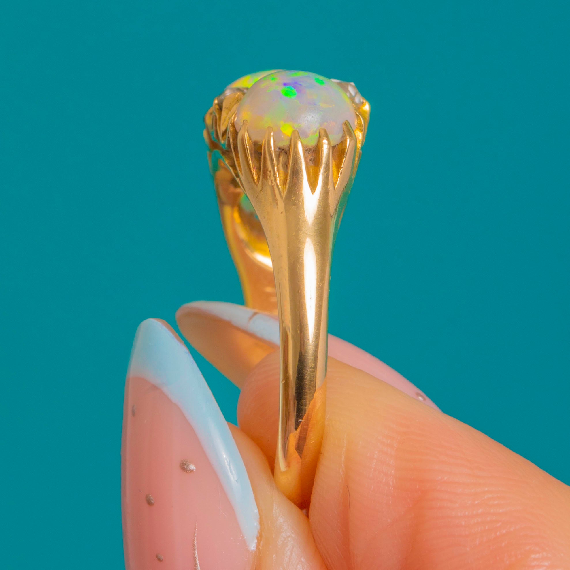 A standout gemstone ring with incredible colour, fire, and form—perfect for collectors of fine antique Opal jewellery.