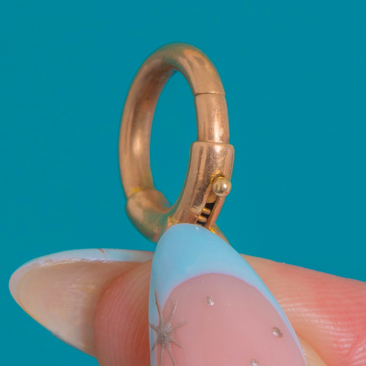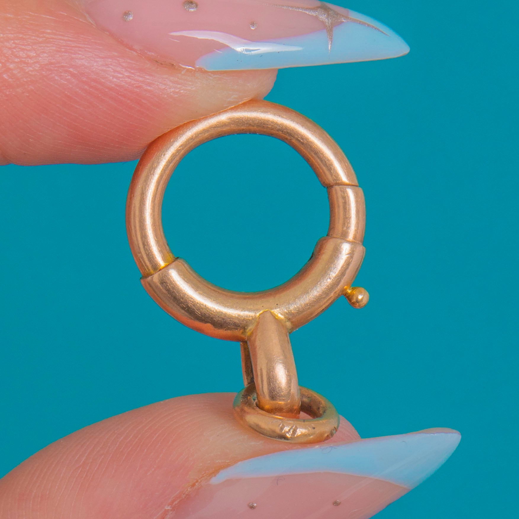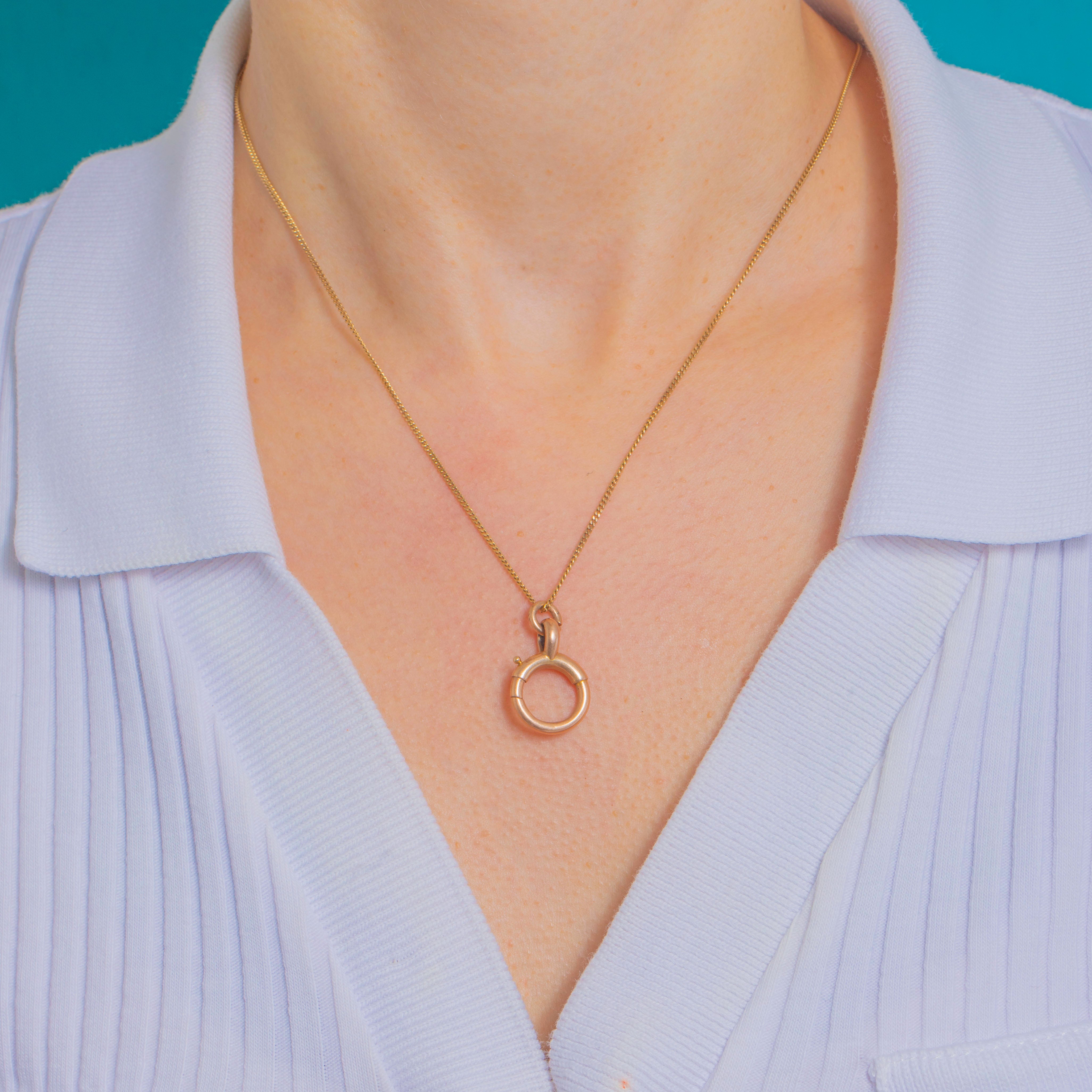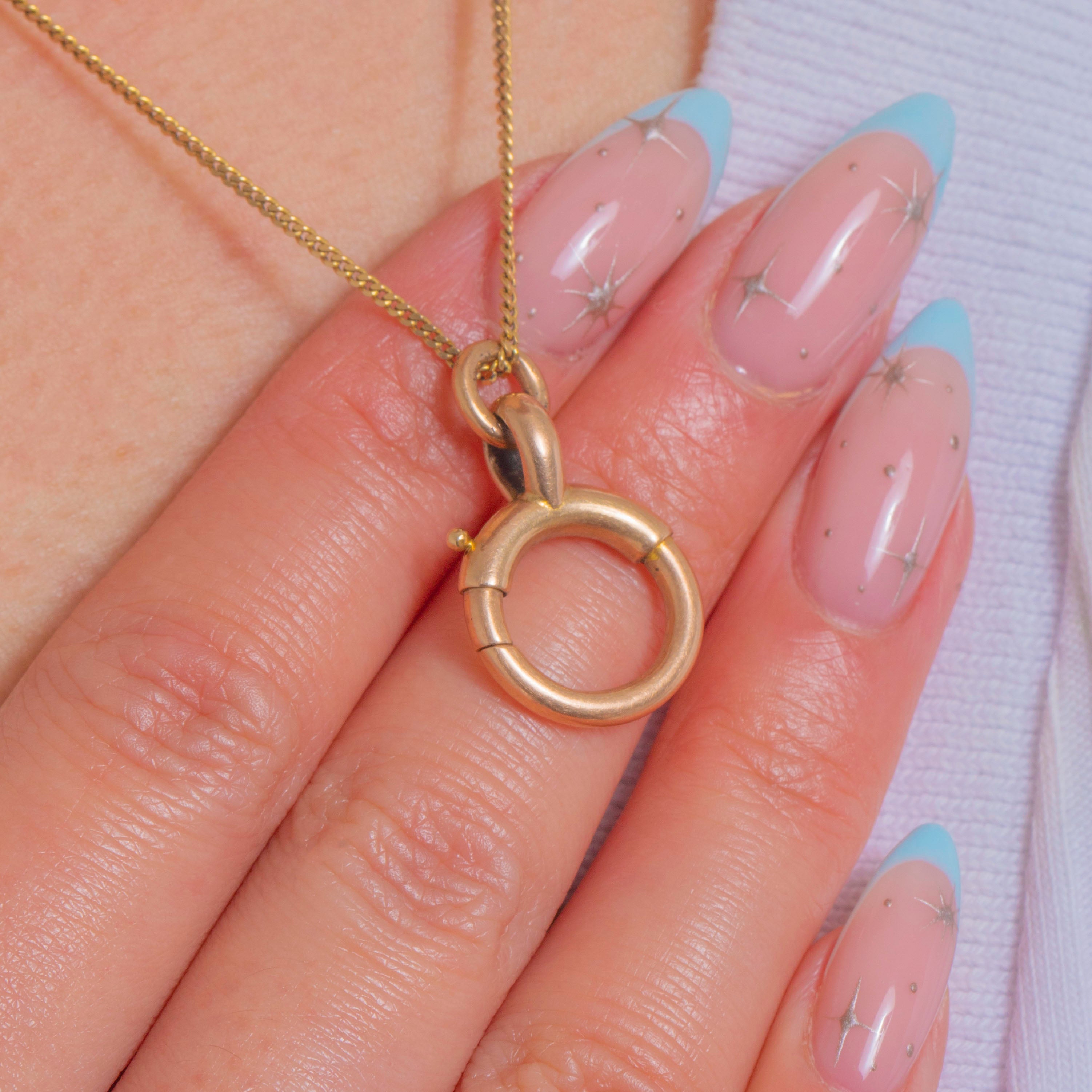 An oversized Victorian 9ct Gold bolt-ring clasp with a satisfyingly chunky tubular profile. Expertly engineered with an external thumb piece and a secure spring-loaded gate, it’s a quintessential antique charm holder—sleek, minimalist and wonderfully versatile in glowing 9ct Gold.