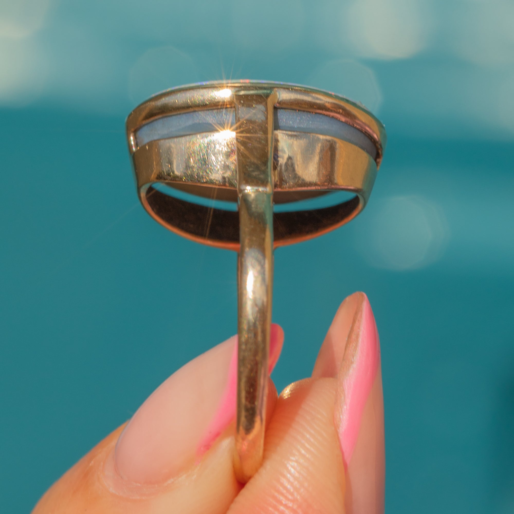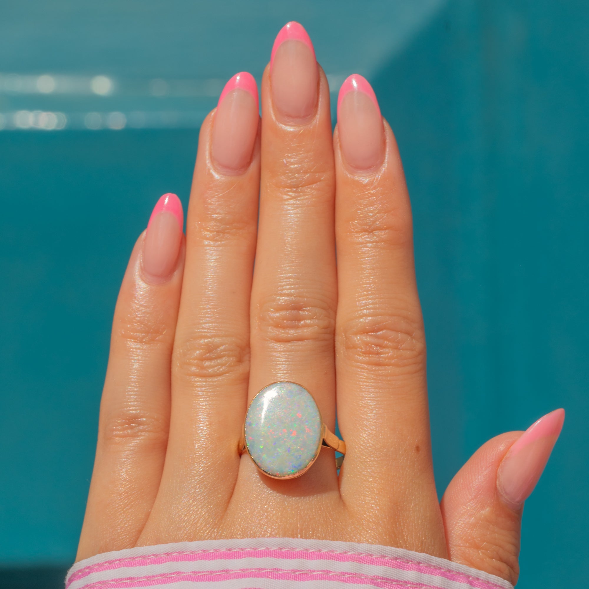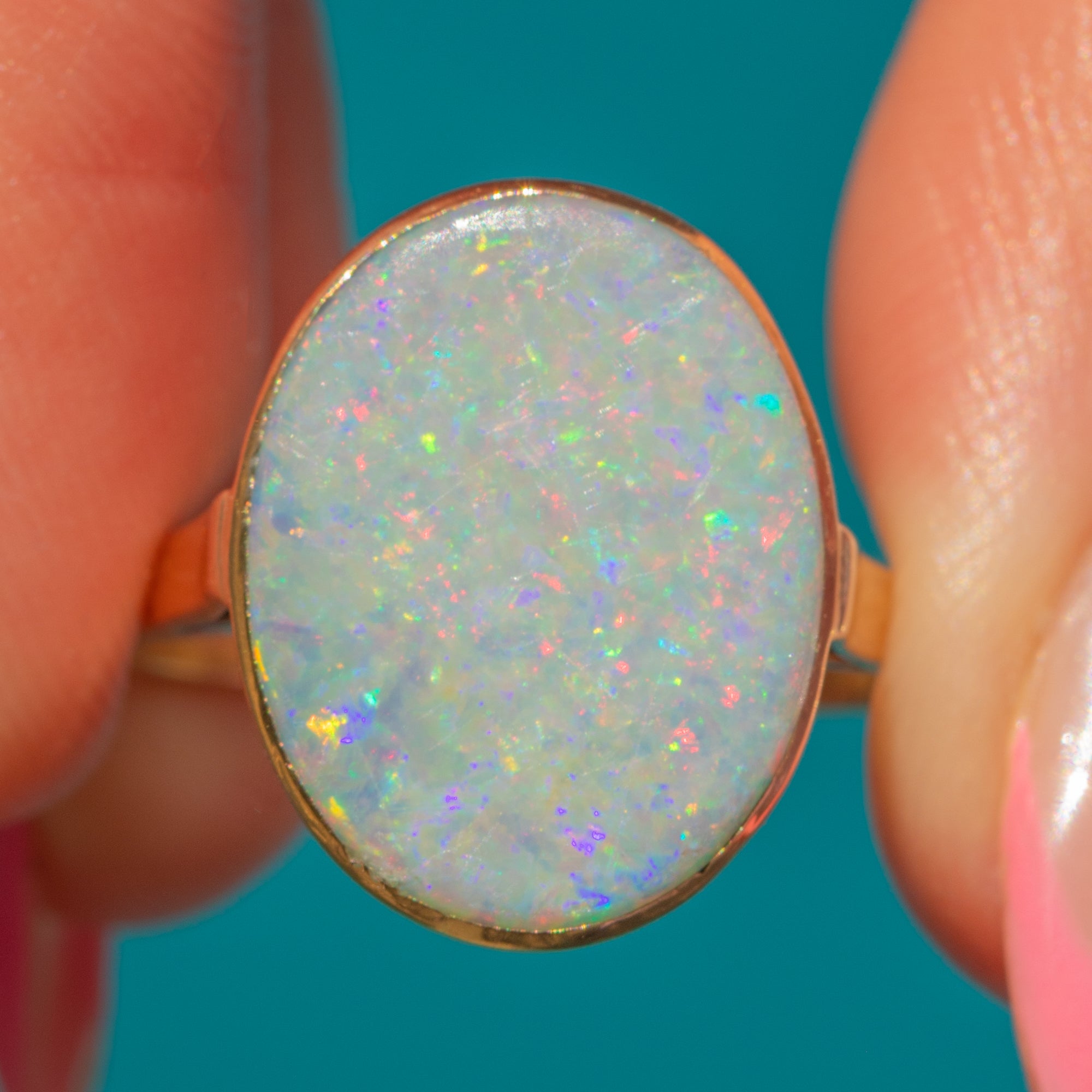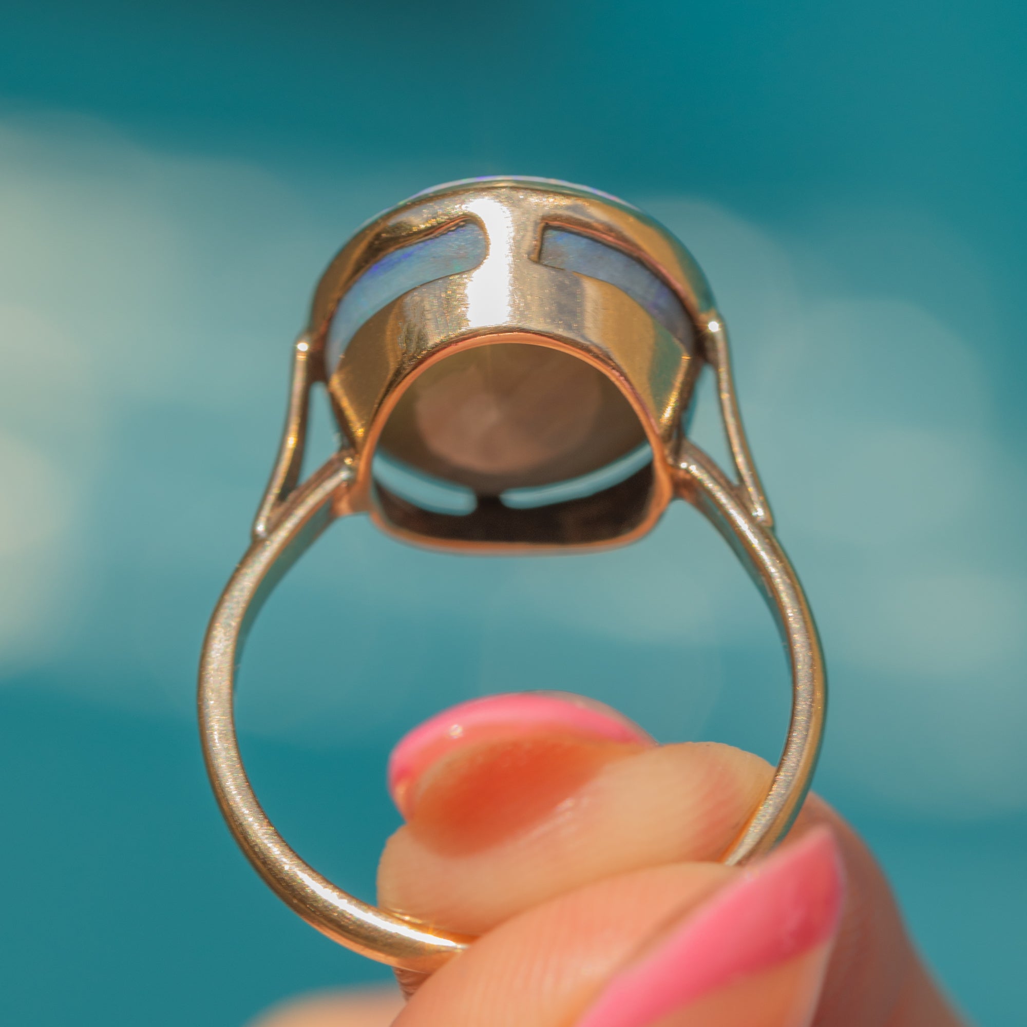Boasting a large 3.00ct pastel Opal, this antique ring is a perfect statement piece. With undertones of lavender and azure blue, this natural solid Opal radiates a contrasting kaleidoscope of vibrant greens and pinks as she catches the light. Her Opal is hugged by a 9ct Gold bezel, the warmth of the Gold adding a refined finish.