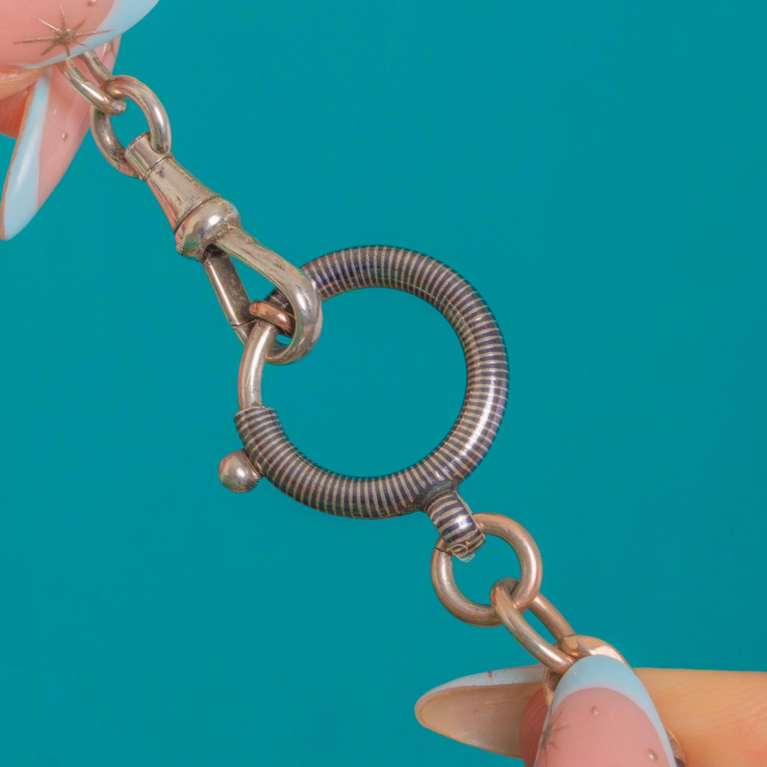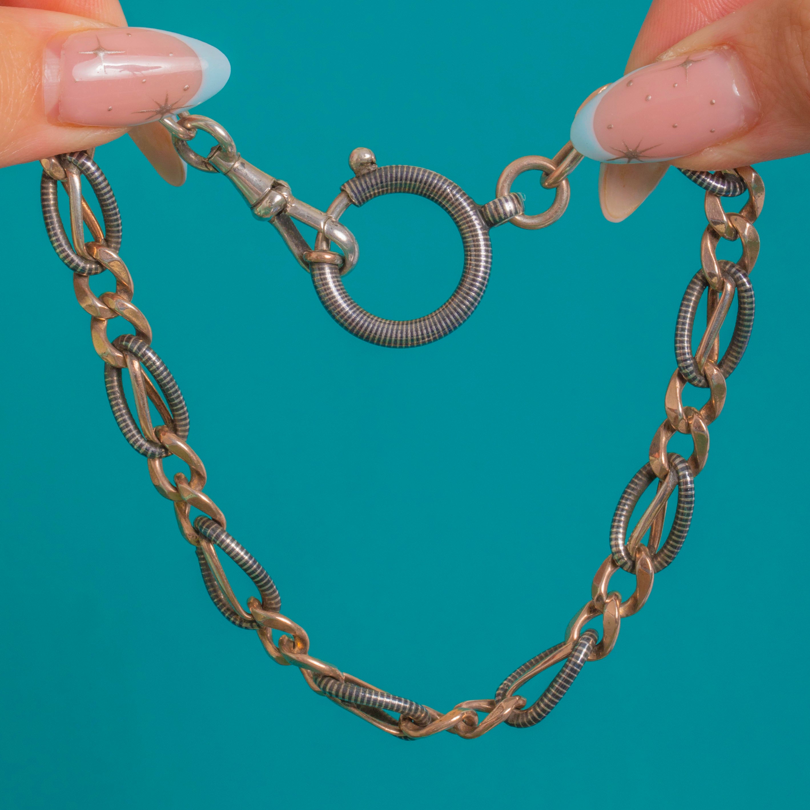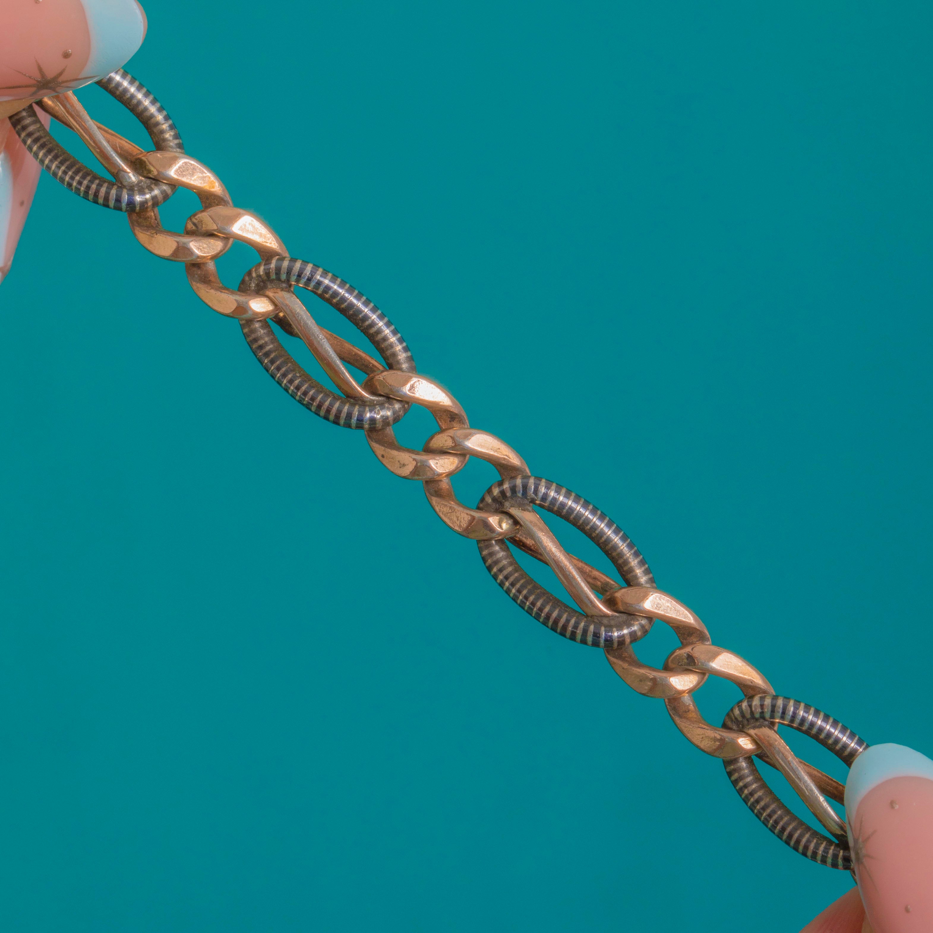 This Victorian chain extender strikes a bold two‑tone contrast, pairing inky Niello ribbed ovals with warm Gold‑gilded connector links. Finely articulated and beautifully engineered, it’s finished with an oversized ribbed bolt ring and a dog clip for that quintessential antique watch‑chain aesthetic.