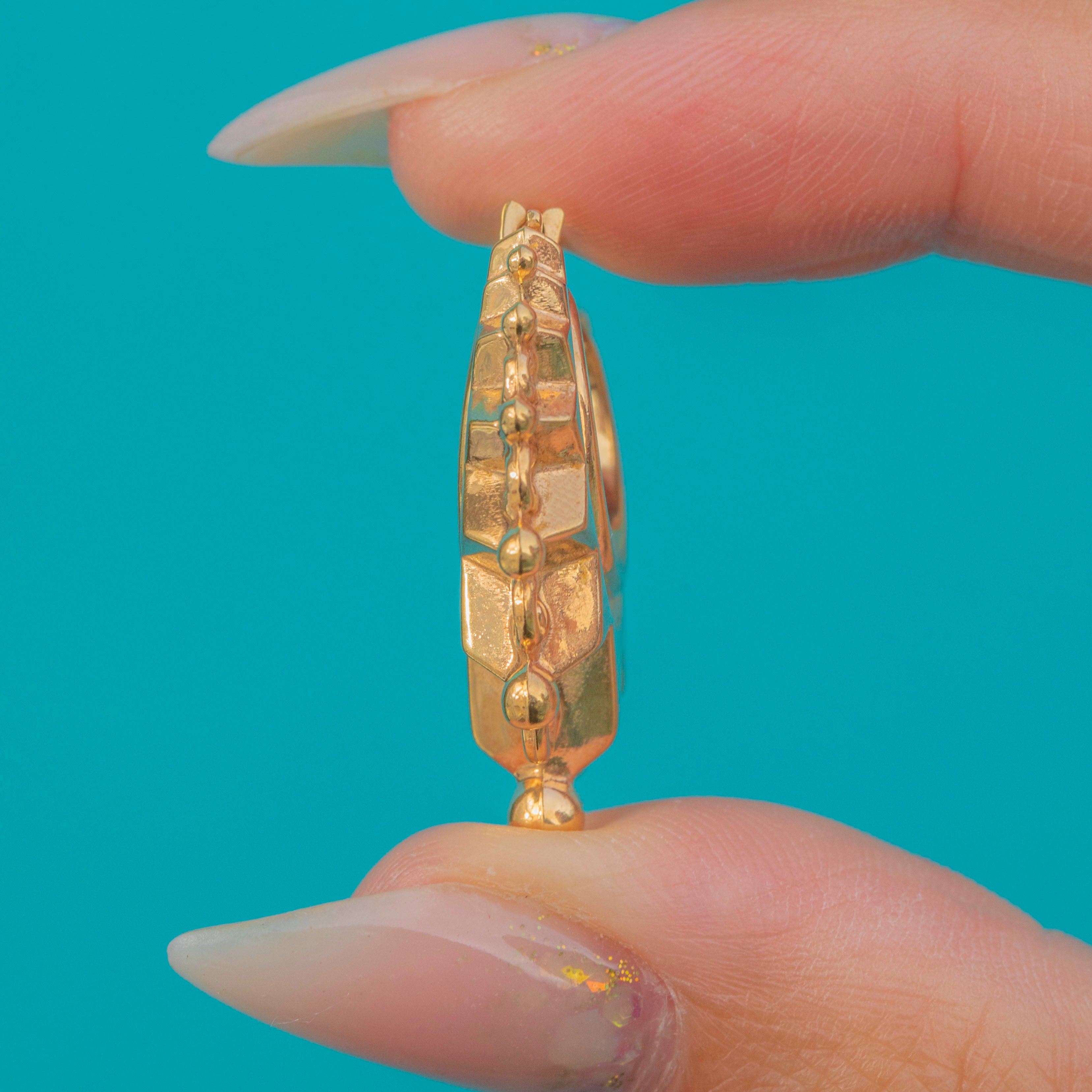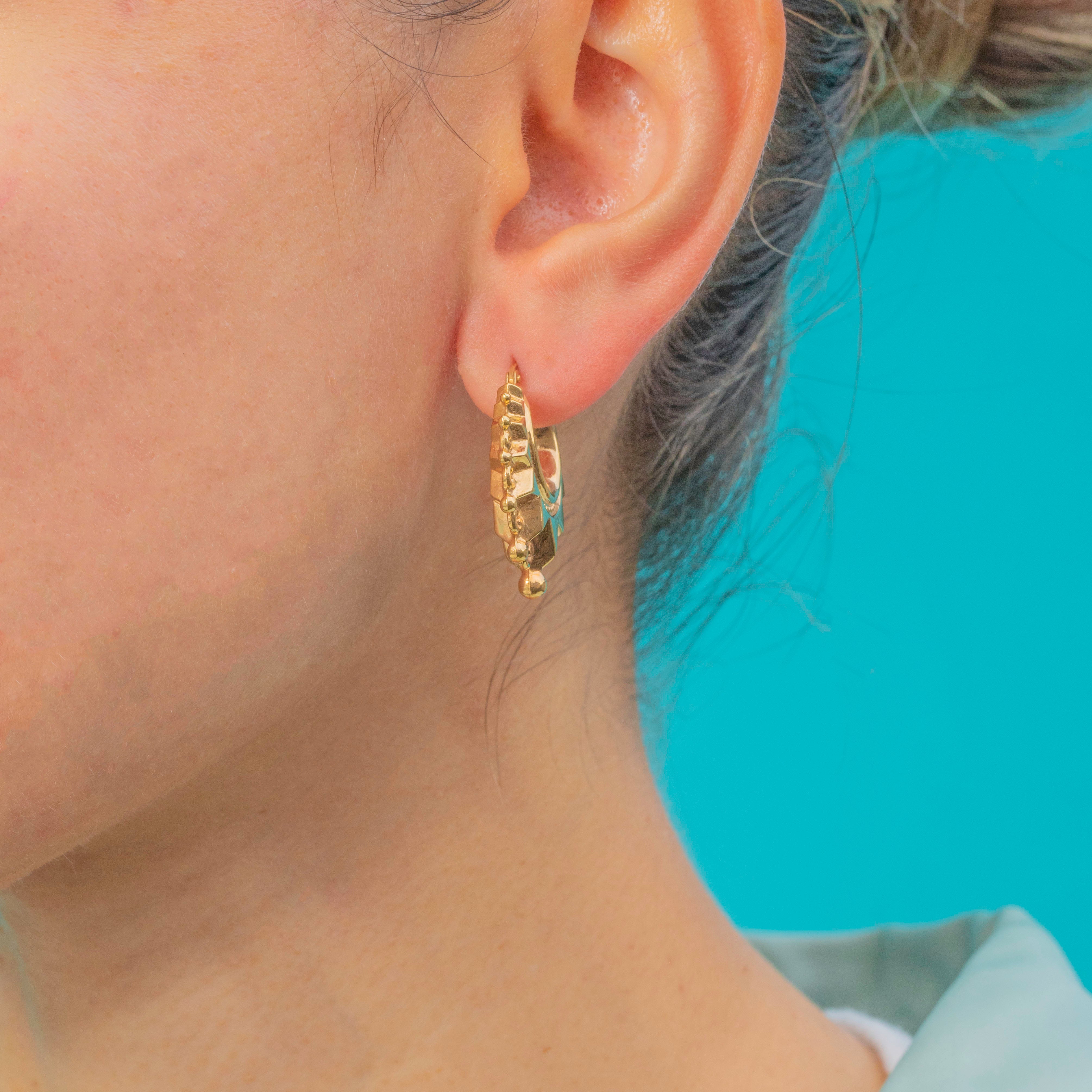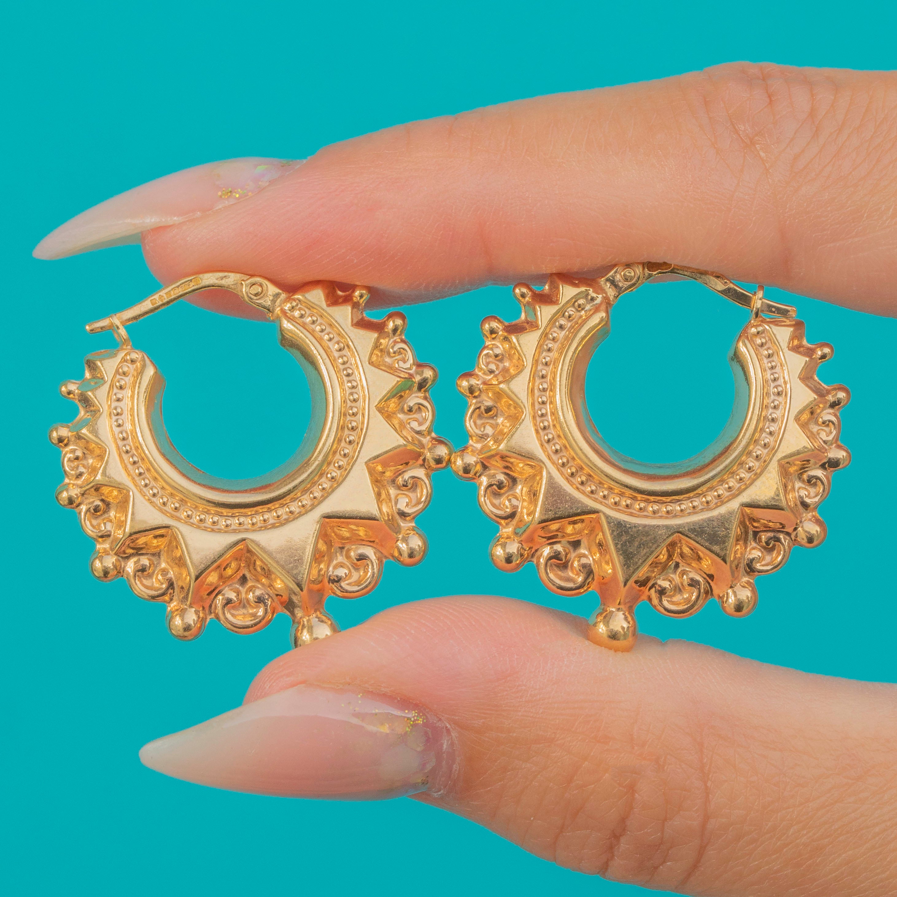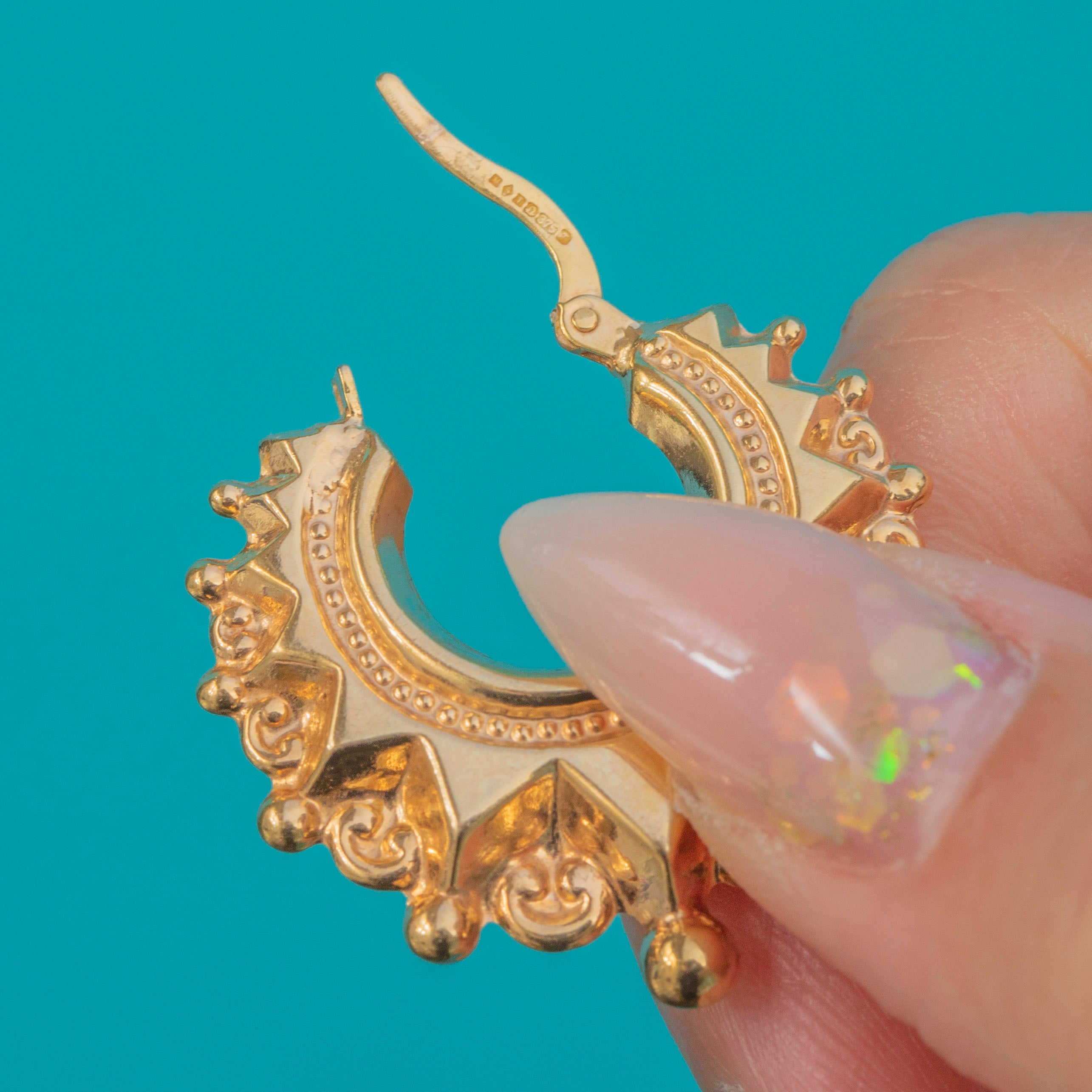 Bold and beautiful creole earrings crafted in warm 9ct Gold with an ornate Etruscan-inspired texture. Their generous, rounded silhouette brings chic Mid-Century drama while remaining light and comfortable for everyday wear.