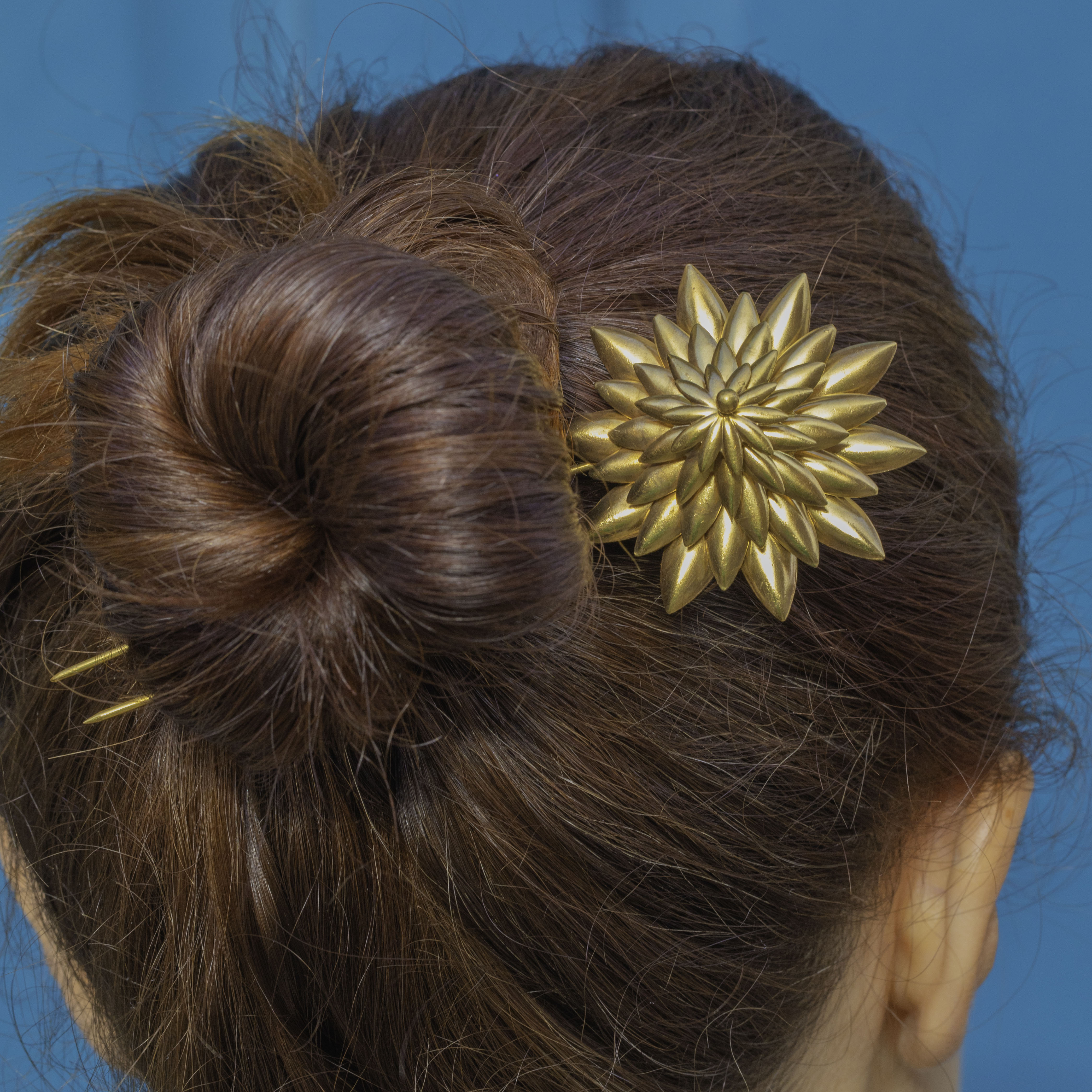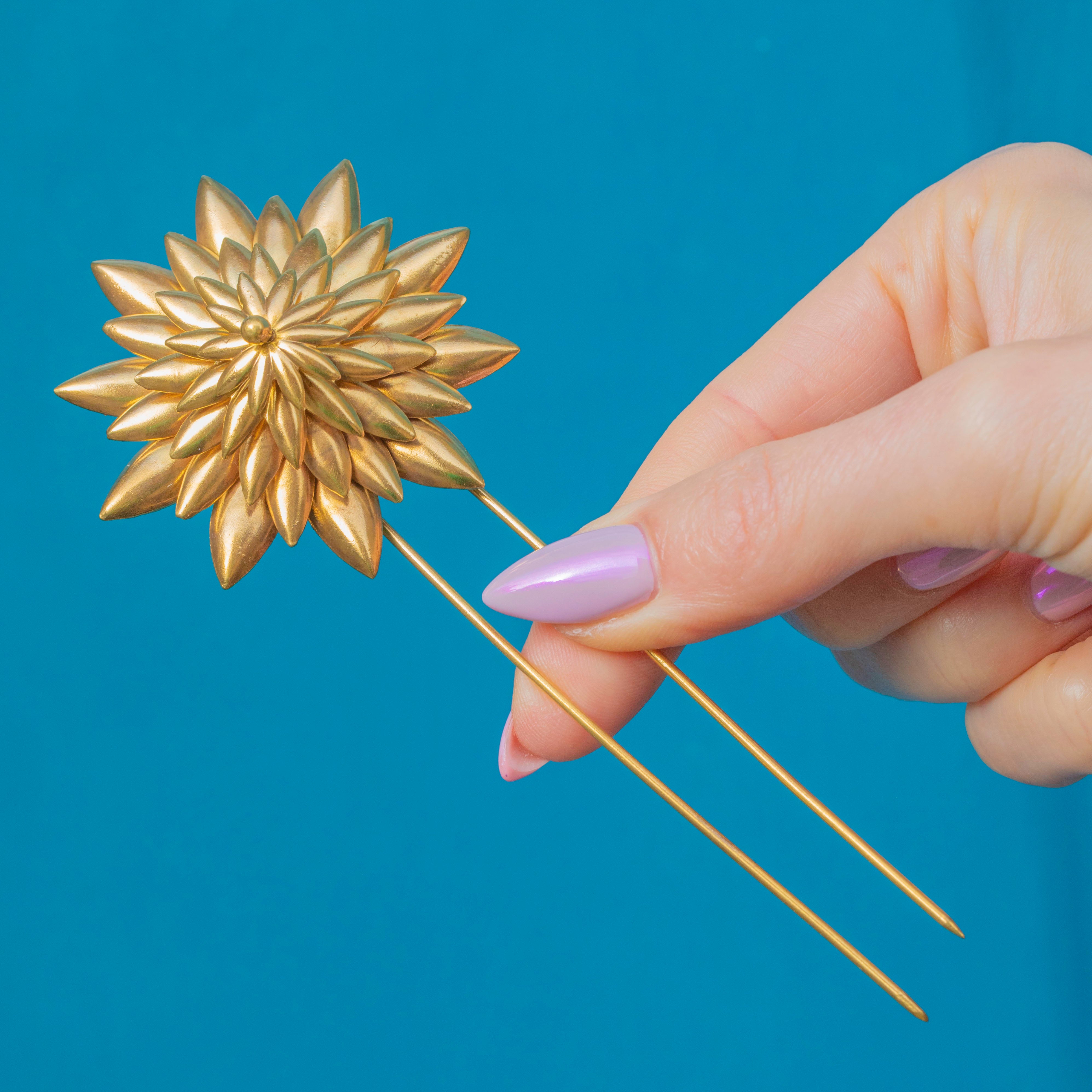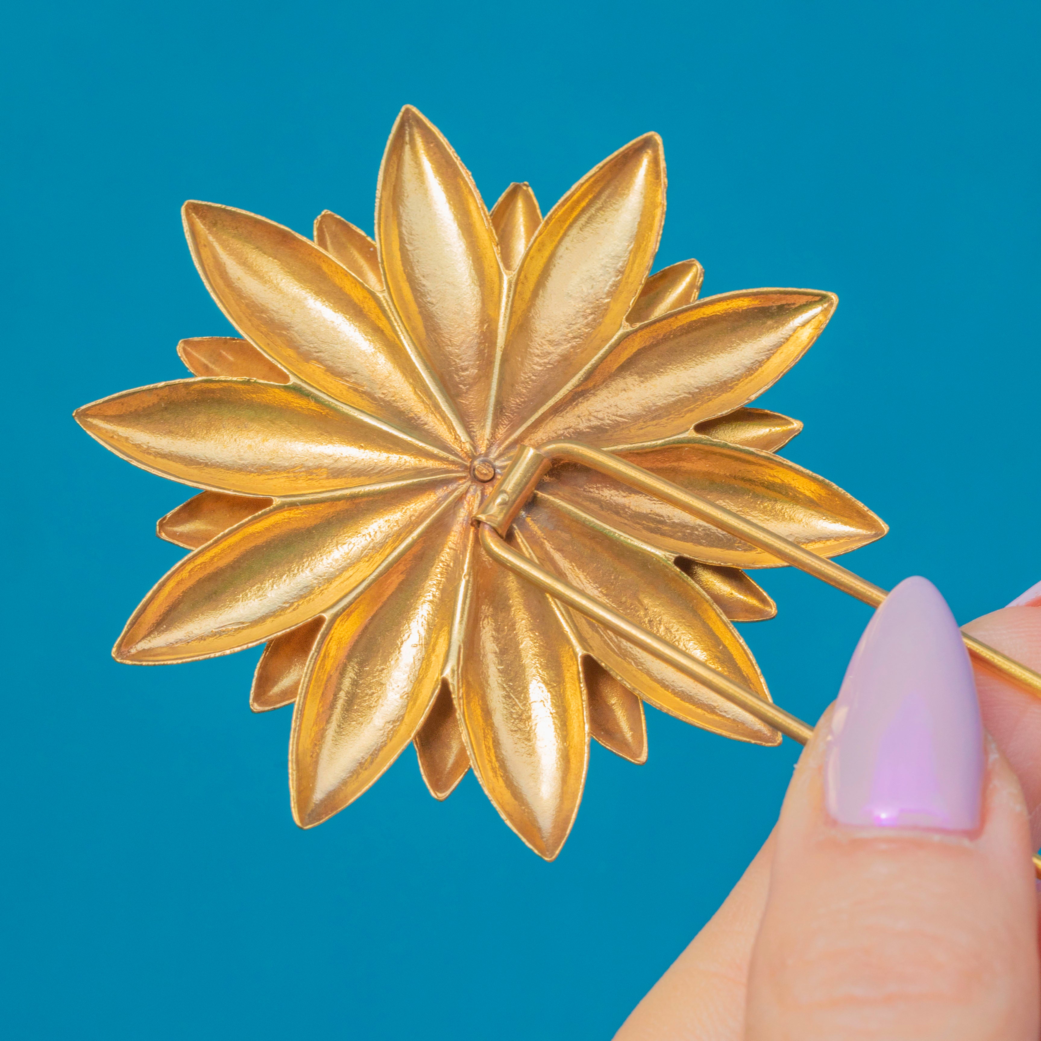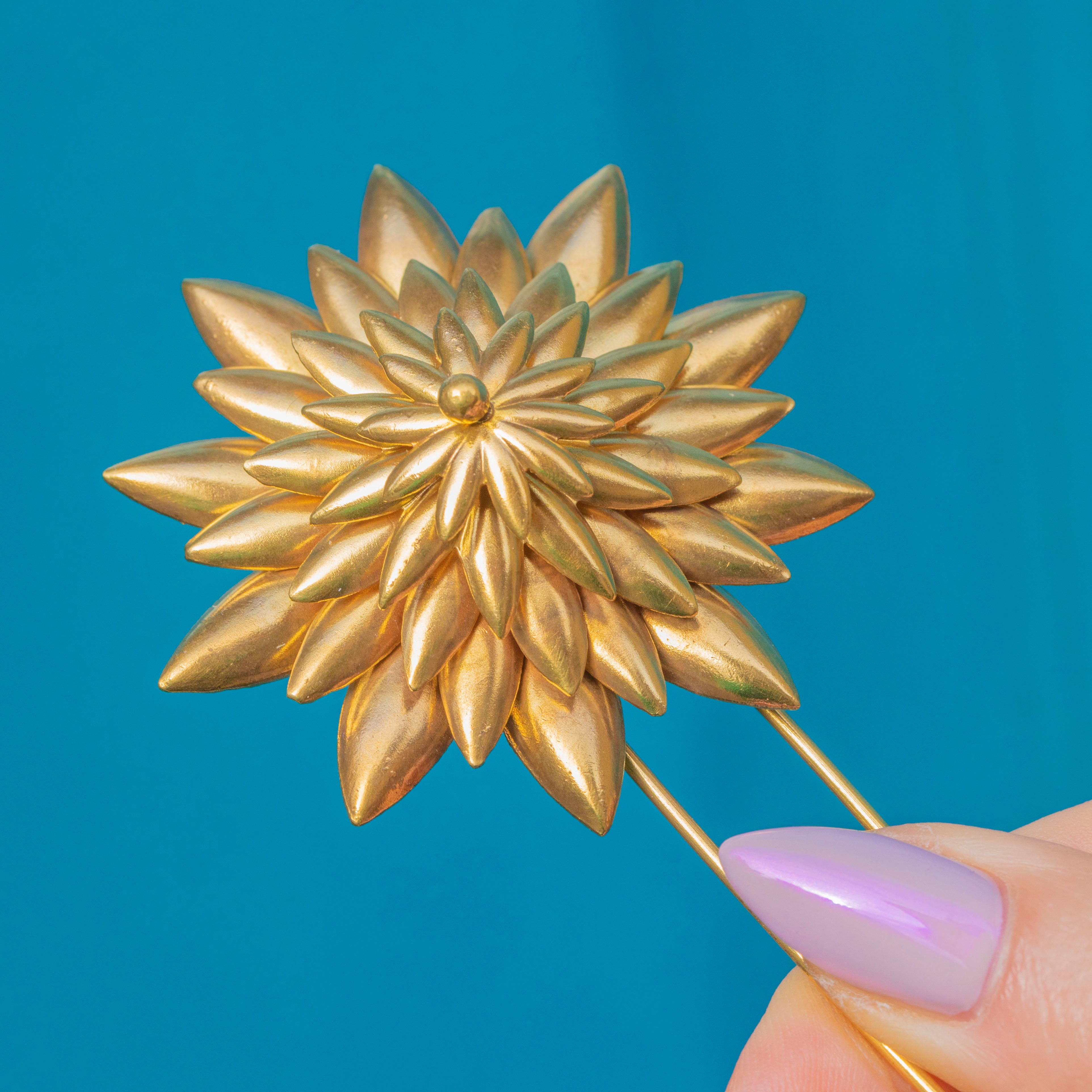 Bring some sun to any up-do with this large Georgian Pinchbeck flower hair pin! Formed of five layers of gleaming, Gold hued Pinchbeck, this flower pin provides depth, texture and radiance to your hair.