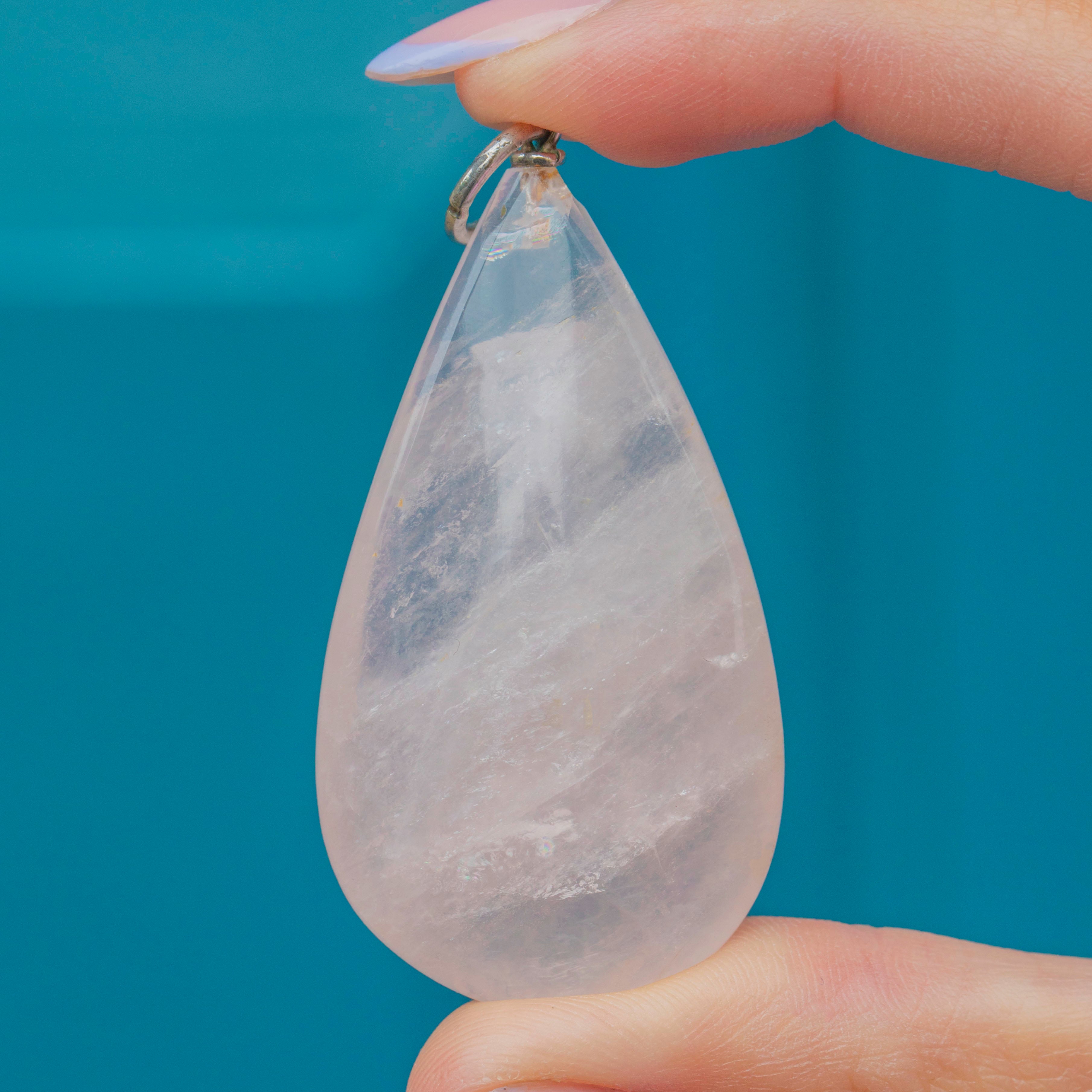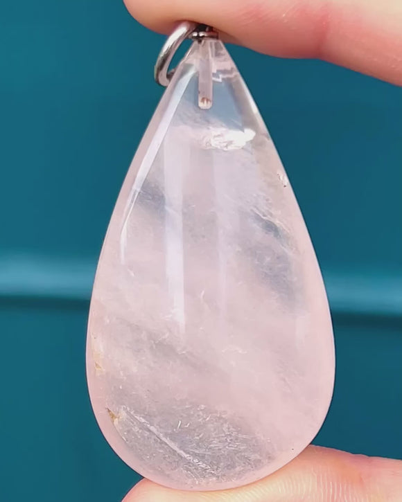 This large Rose Quartz pear drop pendant will make a standout addition to your collection! The 79.84ct Rose Quartz will make a statement wherever she goes, with her dreamy blush inclusions creating a wonderful depth within the smoothly cut form.