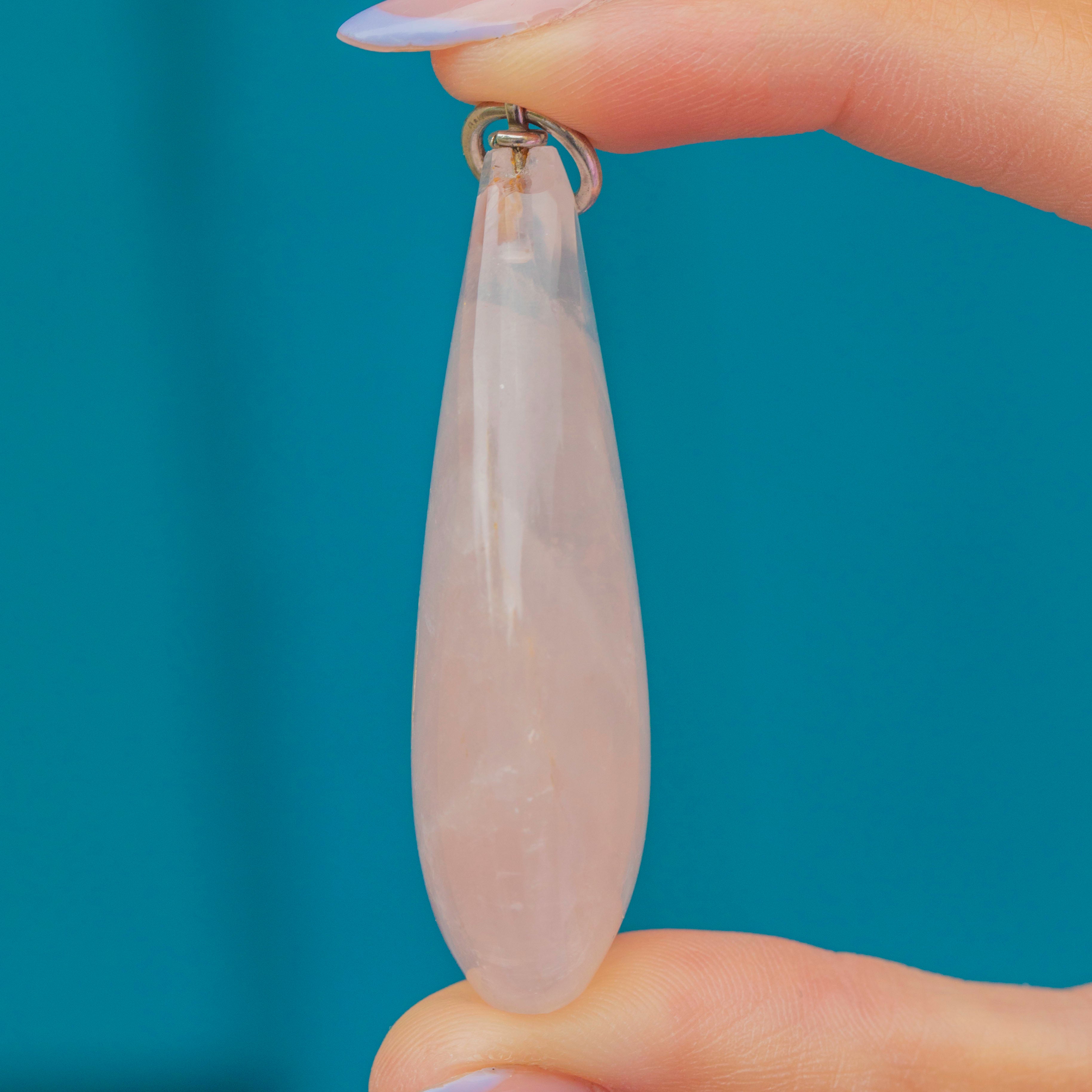 Rose Quartz is believed to open the heart chakra, promoting peace and strengthening relationships, making this Art Deco pendant a wonderful choice to wear close to your heart!