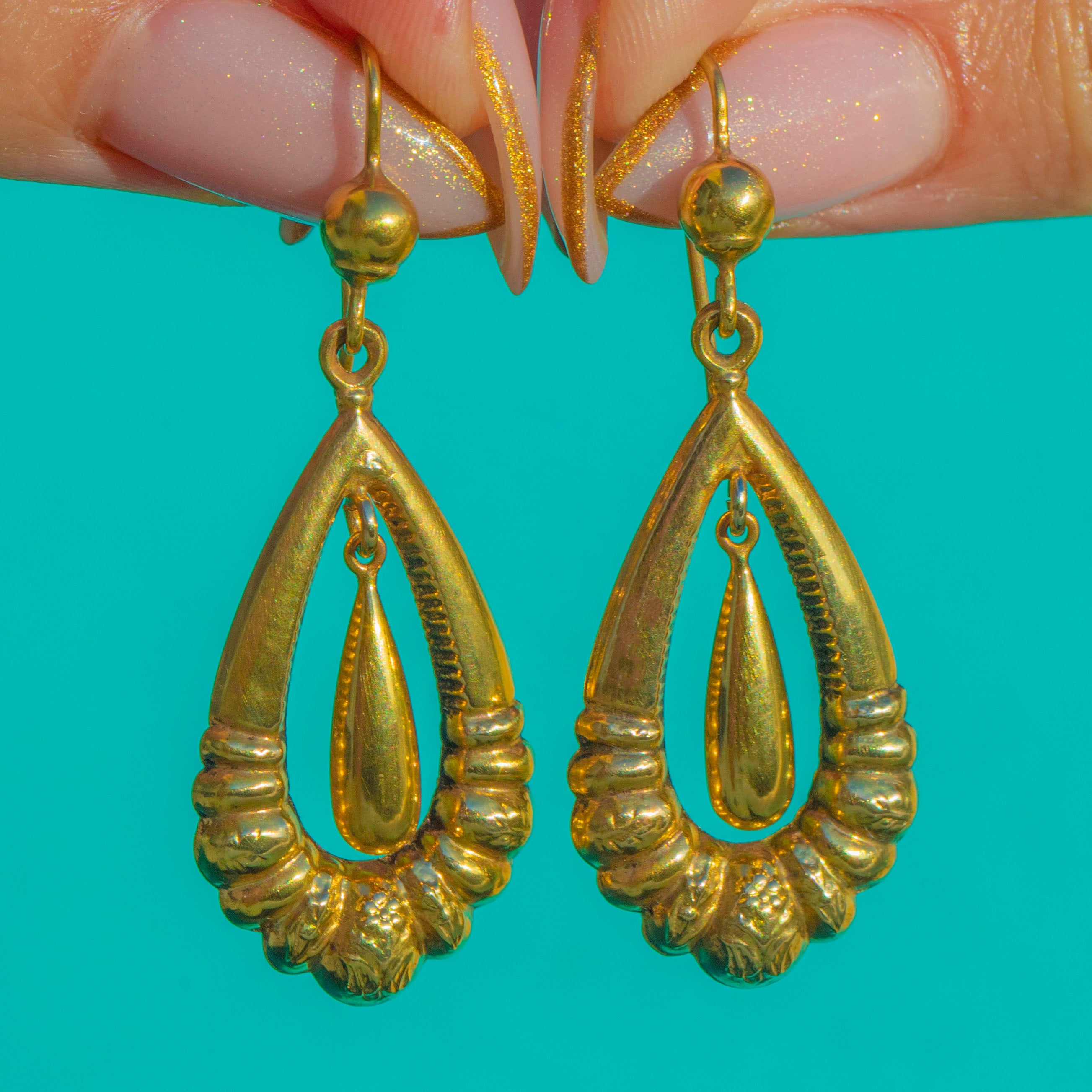 These large Victorian Gold pear drop earrings have all the drama of the era with a wonderfully wearable lightness of touch. Crafted in rich 9ct Gold with 12ct Gold French hooks, each earring is formed as an open pear-shaped drop framing a smooth inner teardrop that swings freely as you move.