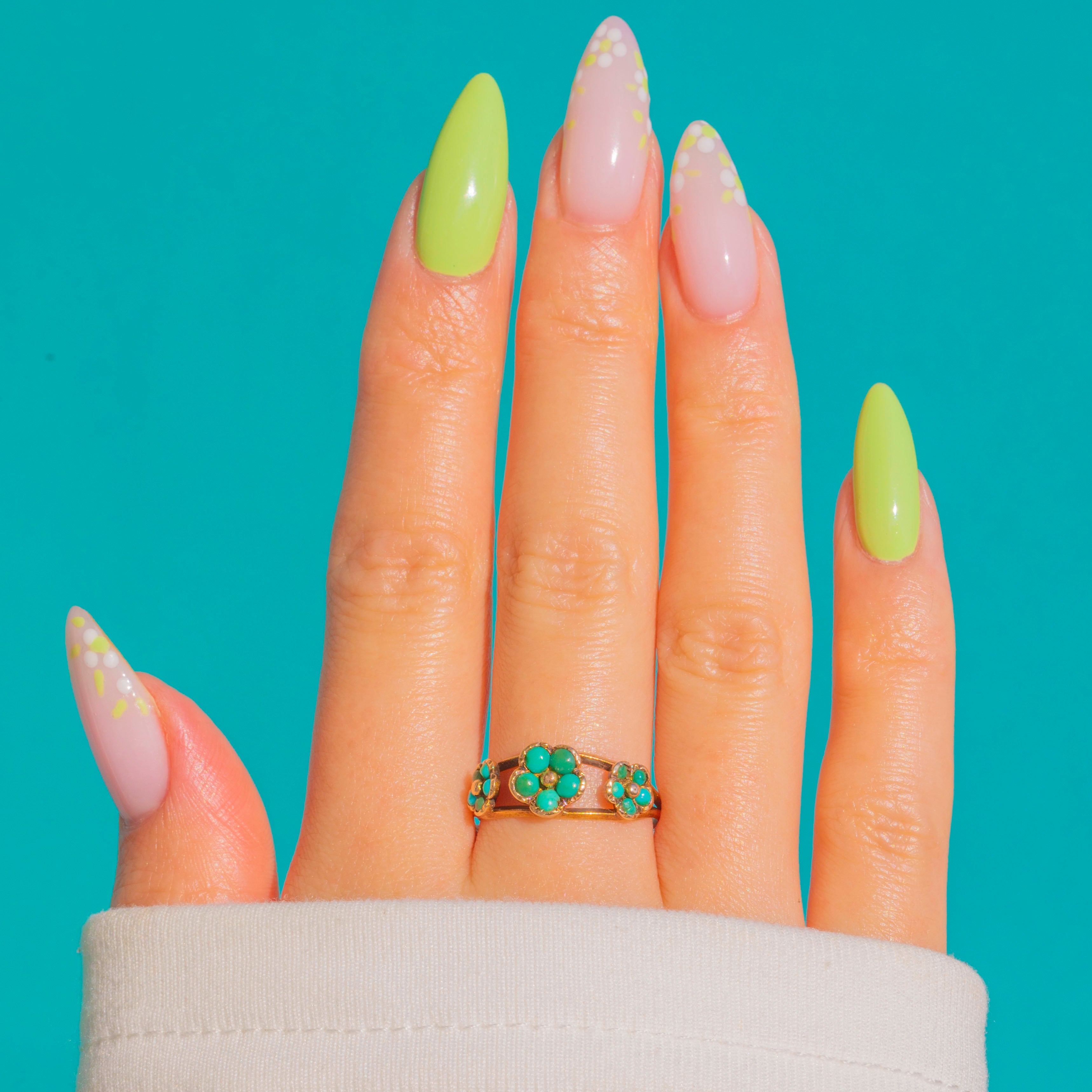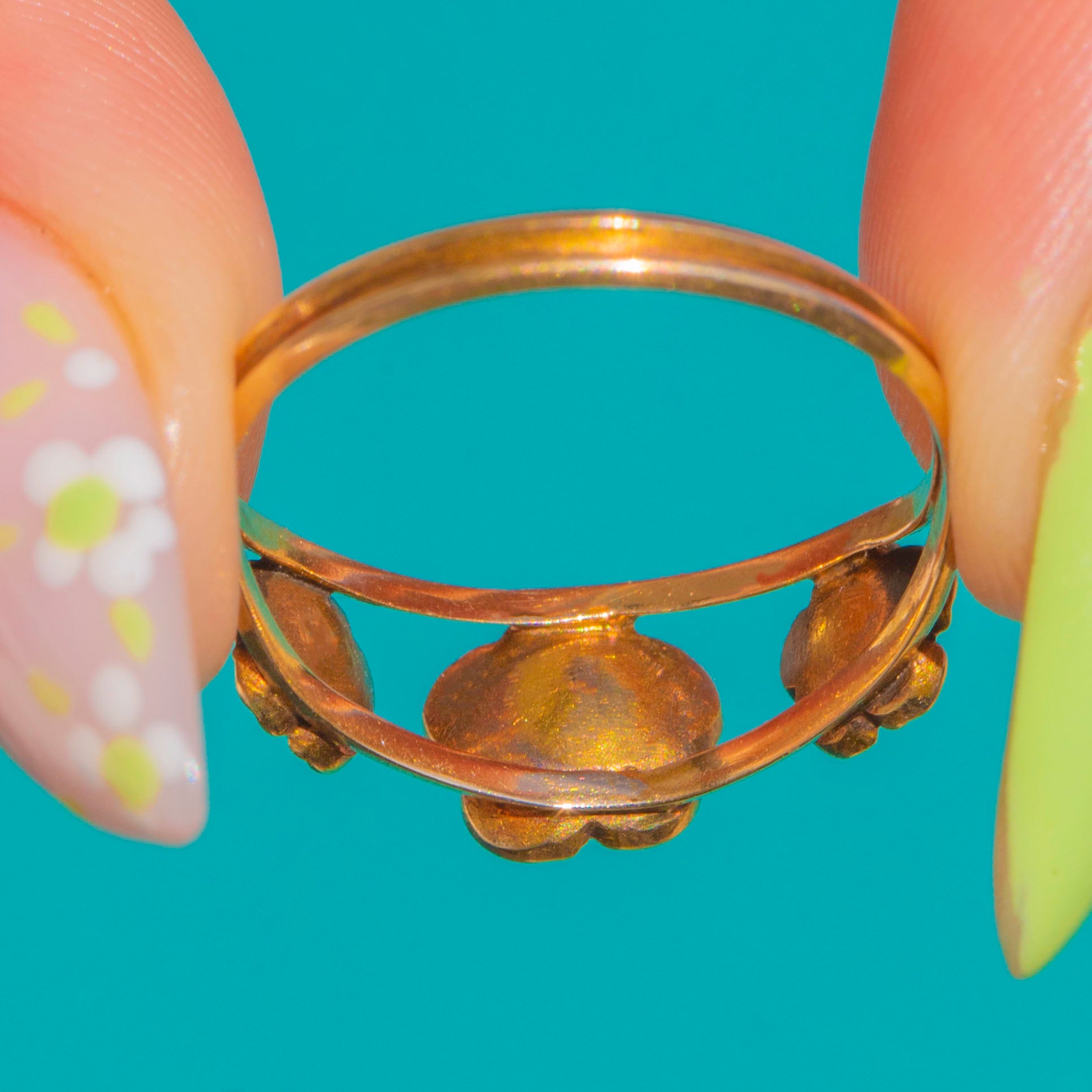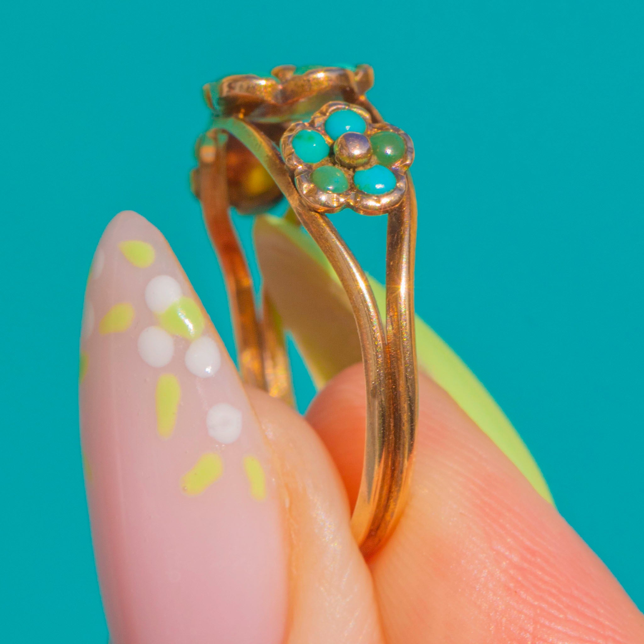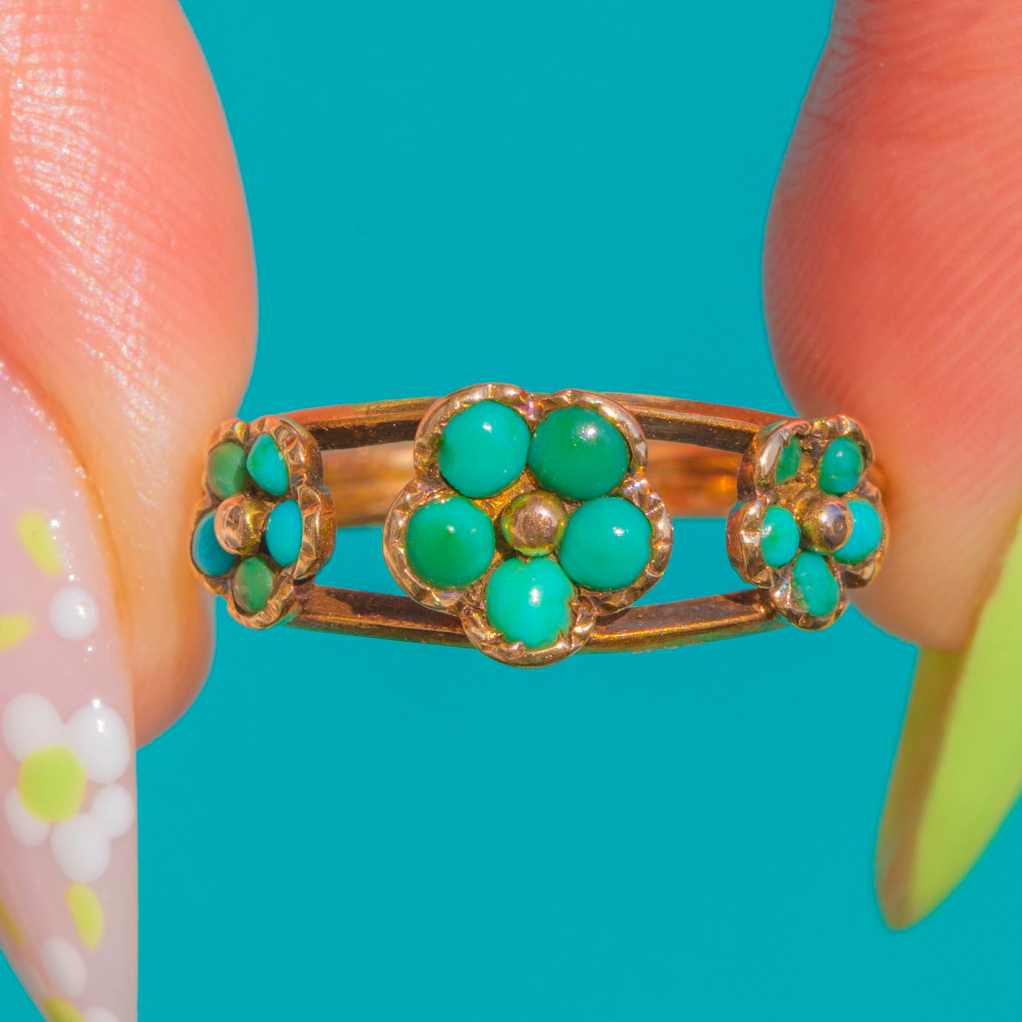 A sweet Late Georgian treasure, this 15ct Gold ring is fashioned as a trio of forget‑me‑not blooms set with glossy Turquoise cabochons. The central flower is slightly larger, flanked by two petite companions, each detailed with a tiny Gold bead to the heart for a charming, lifelike finish. Textured bezel settings and closed backs lend that distinctive early 19th‑century character, their gentle patina enhancing the serene turquoise‑blue tones.