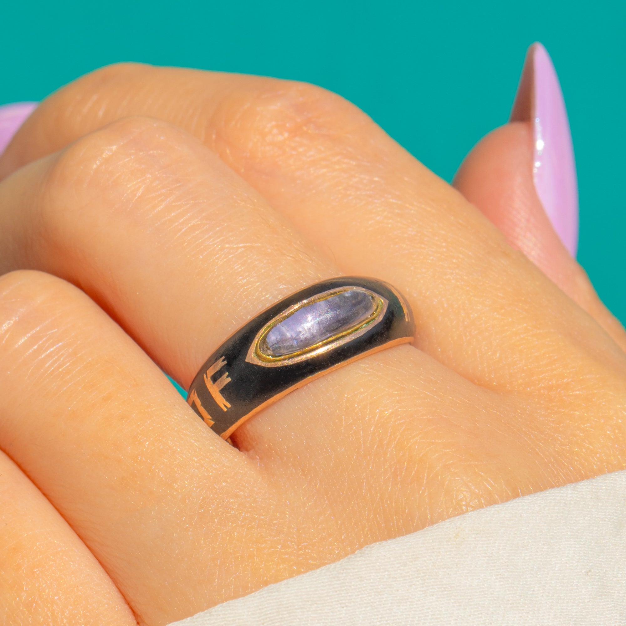 EXCELLENT: Well cared for with minimal wear commensurate with age. The foiled Amethyst and black Enamel present beautifully, and the setting and band are secure. A superb example of a Victorian mourning ring with clear hallmarks and a graceful finish.