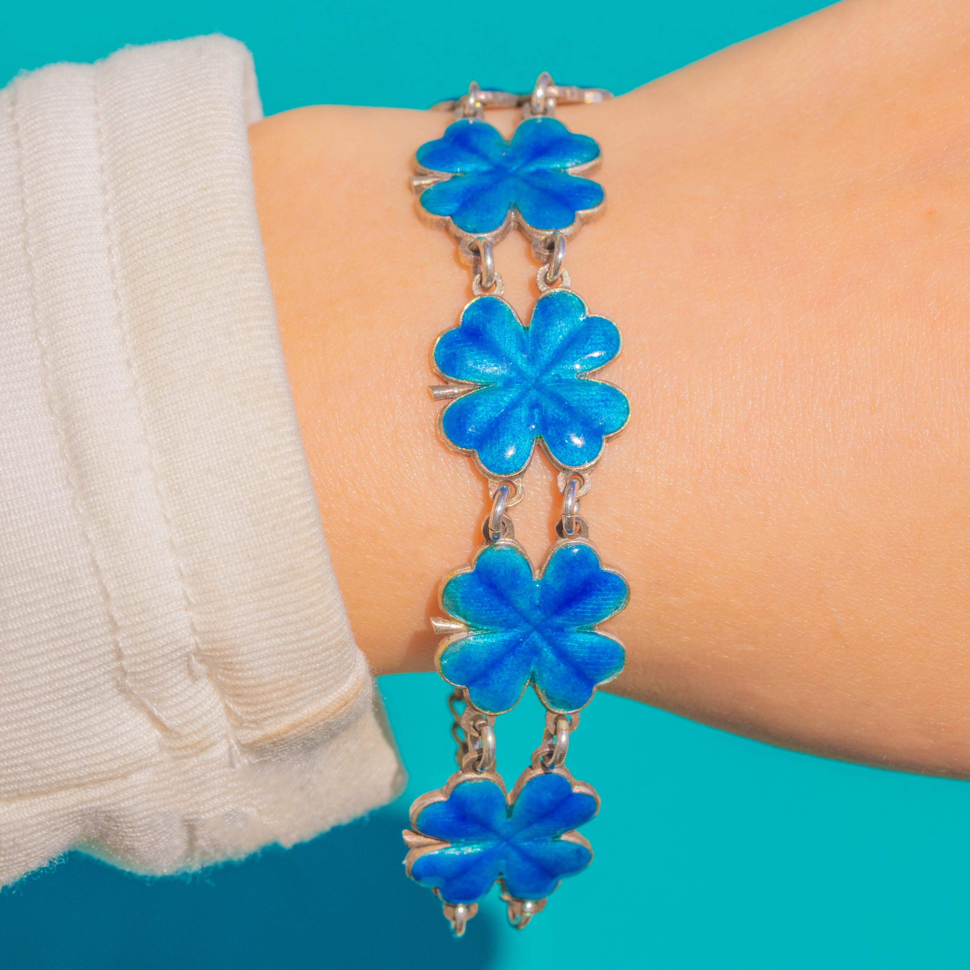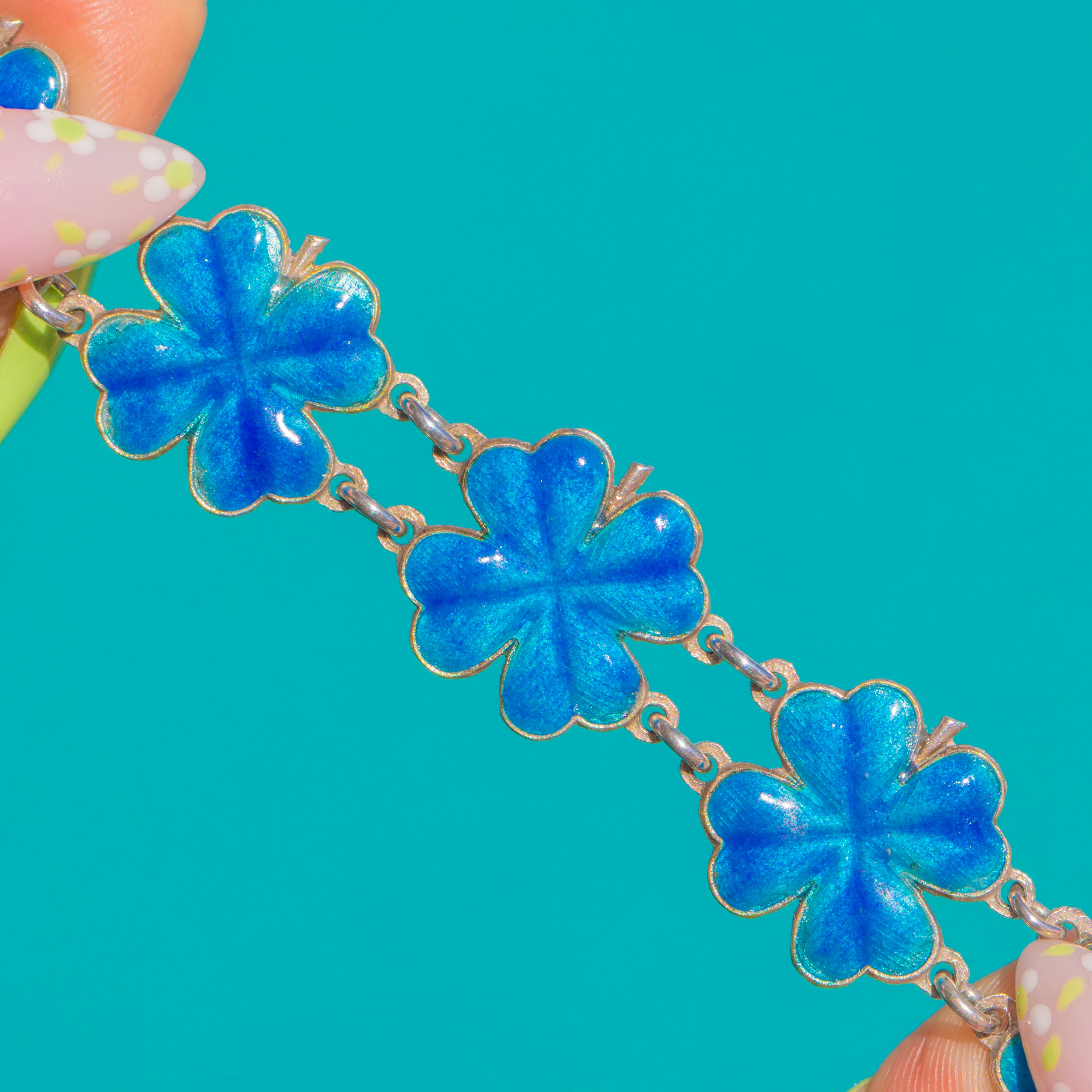 A luminous splash of blue, this Art Deco bracelet is composed of repeating four-leaf clover panels in translucent Enamel, framed by sleek Sterling Silver. The Enamel glows from within, revealing a refined, radiating texture beneath that catches the light beautifully as the bracelet moves.