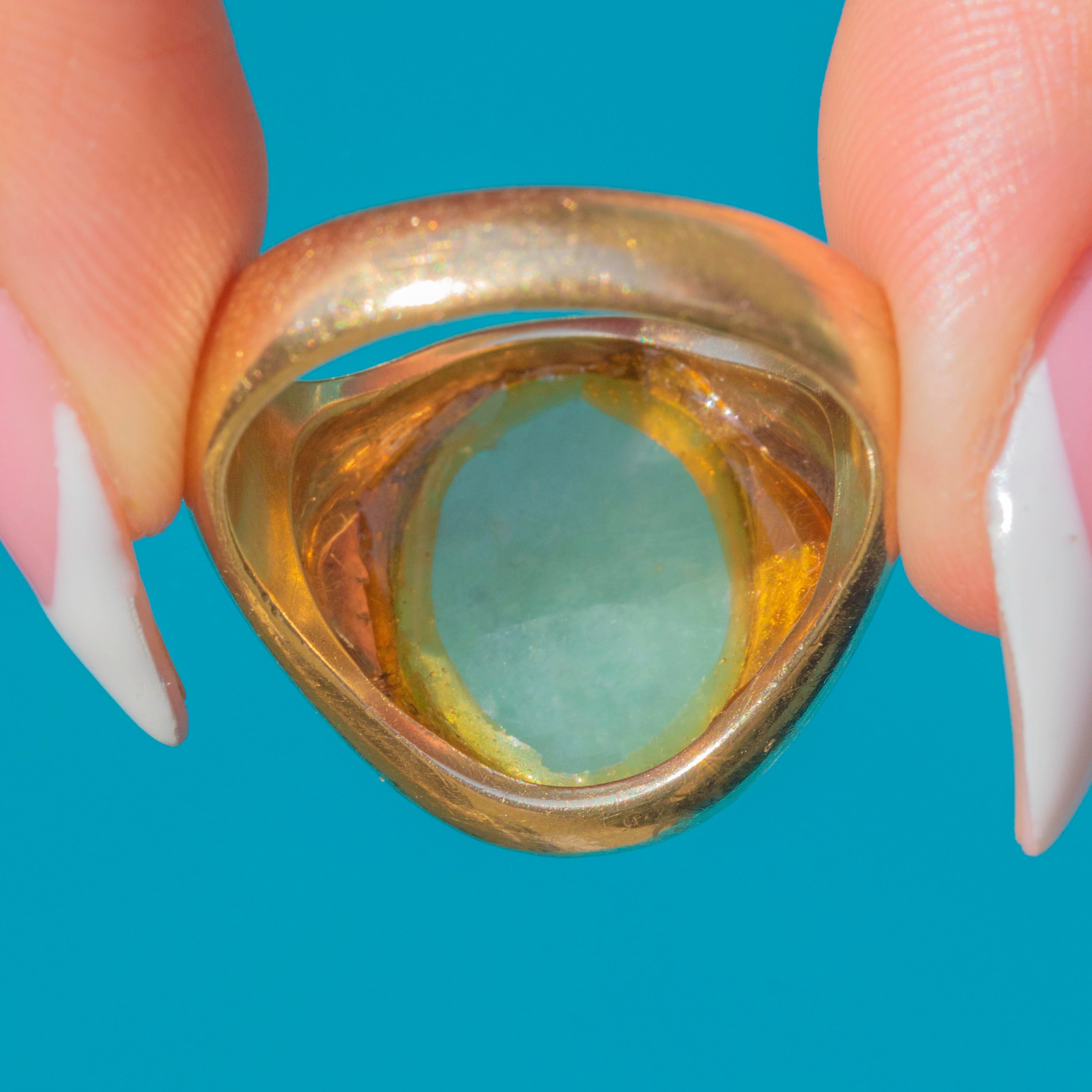 EXCELLENT: The Jade is free from chips, scratches, or abrasions, retaining a beautiful smooth polish. The Gold band is in pristine condition with no thinning or distortion. There is a worn inscription inside the band that is too faint to read, adding a touch of mystery to this well-preserved vintage piece.