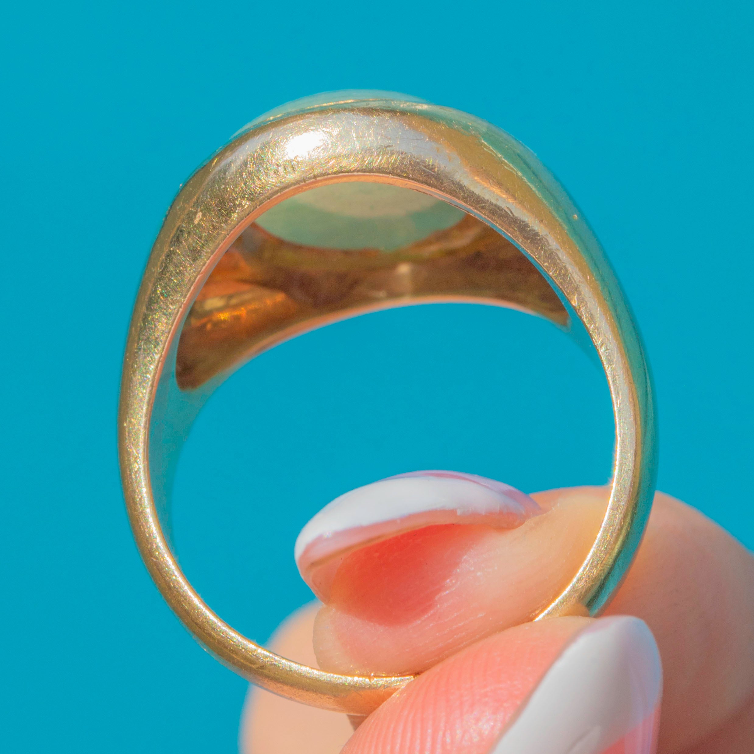 This Mid-Century Vintage ring is crafted in rich 14ct Gold and set with a striking oval Jade cabochon.