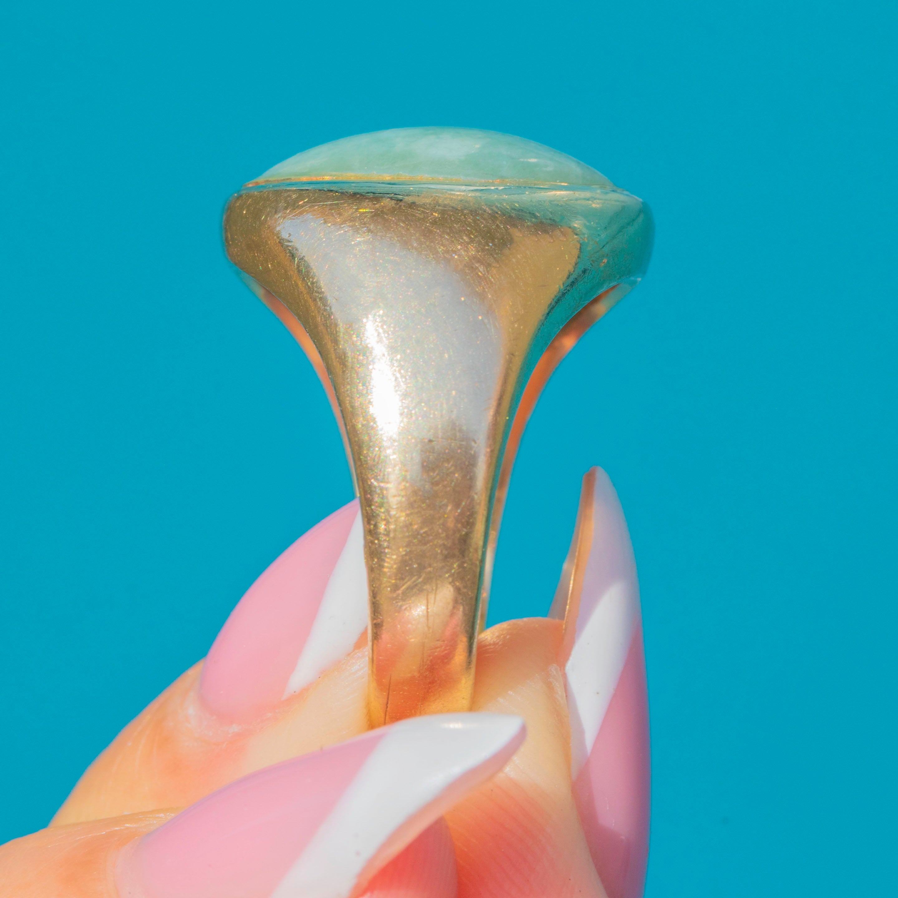 The Jade has a soft, even green hue with a subtle translucency, creating a beautiful contrast with the warm Gold.