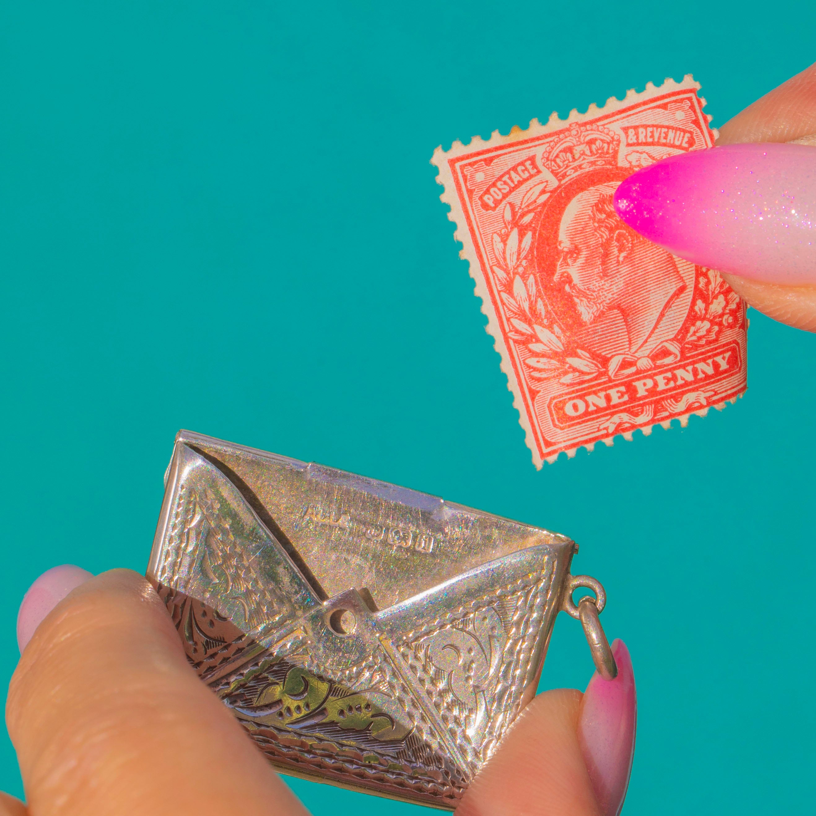 Both delightful and practical, the hinged case opens to reveal a tidy compartment for stamps and closes securely with a smooth push-fit. It even comes with an antique One Penny stamp for a touch of period romance. Fully hallmarked in Birmingham and dating to 1908, this petite treasure captures the elegance of the Edwardian era in wearable form.