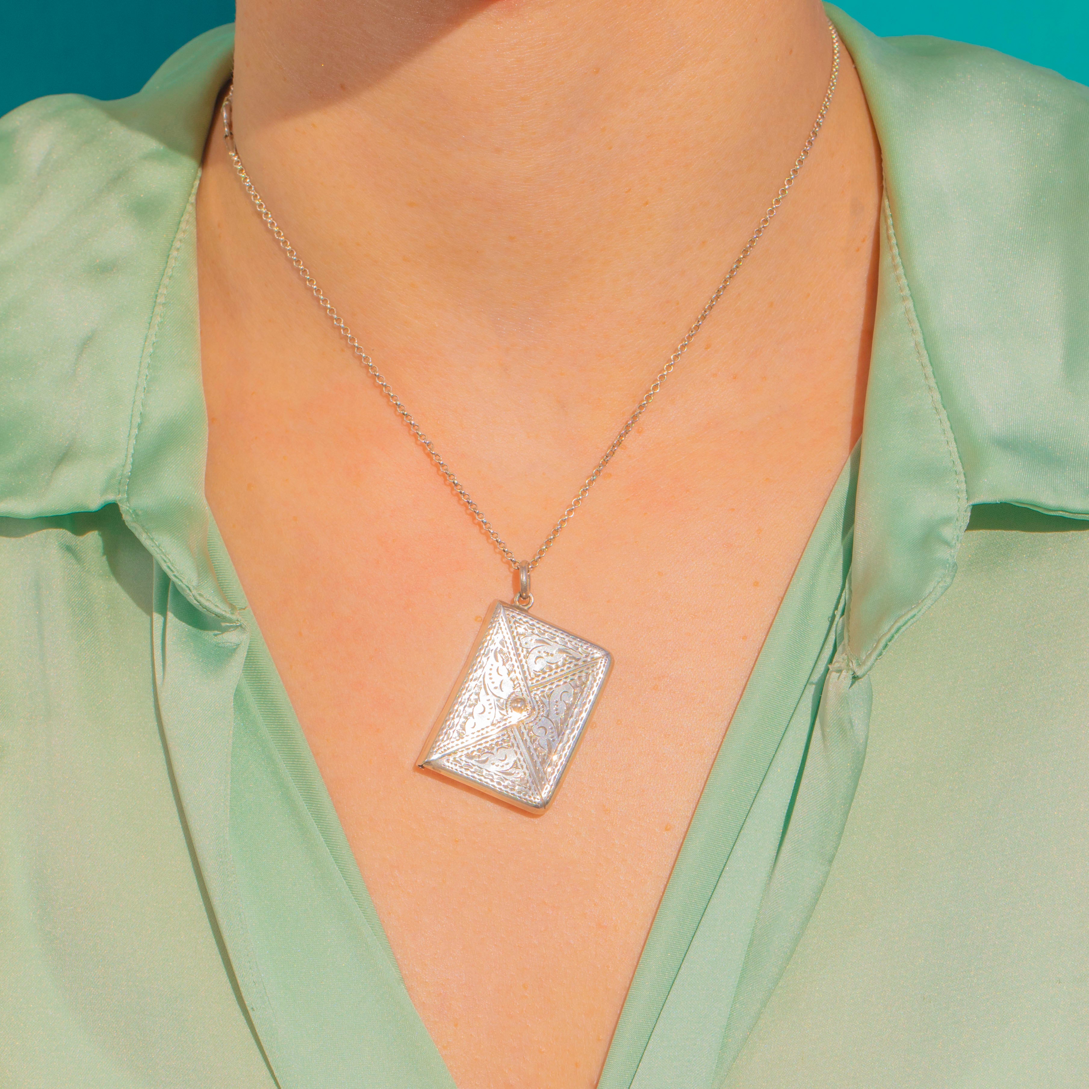 A charming Edwardian Sterling Silver stamp-holder pendant modelled as a dainty envelope, richly engraved with flowing foliate scrolls and finished with a neat beaded border. Its raised “flap” motif and central stud lend lovely dimension, while the gentle patina in the recesses beautifully accentuates the design.