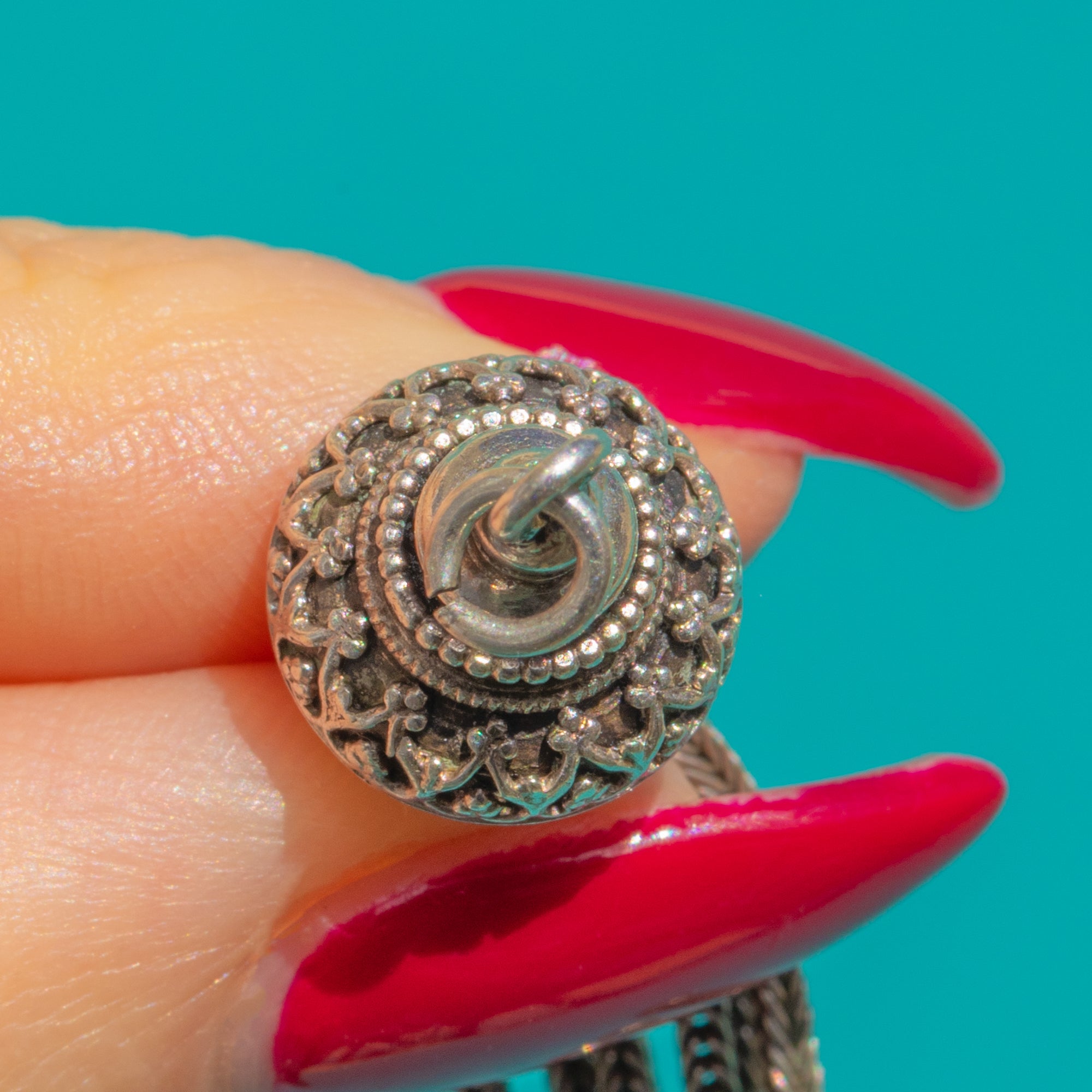 Ornate and beautifully proportioned, this Victorian Silver tassel pendant is a delight of movement and texture. A domed openwork cap with foliate and beaded motifs crowns a cascade of fine foxtail chains, each finished with a tiny spherical terminal for a softly shimmering swish.