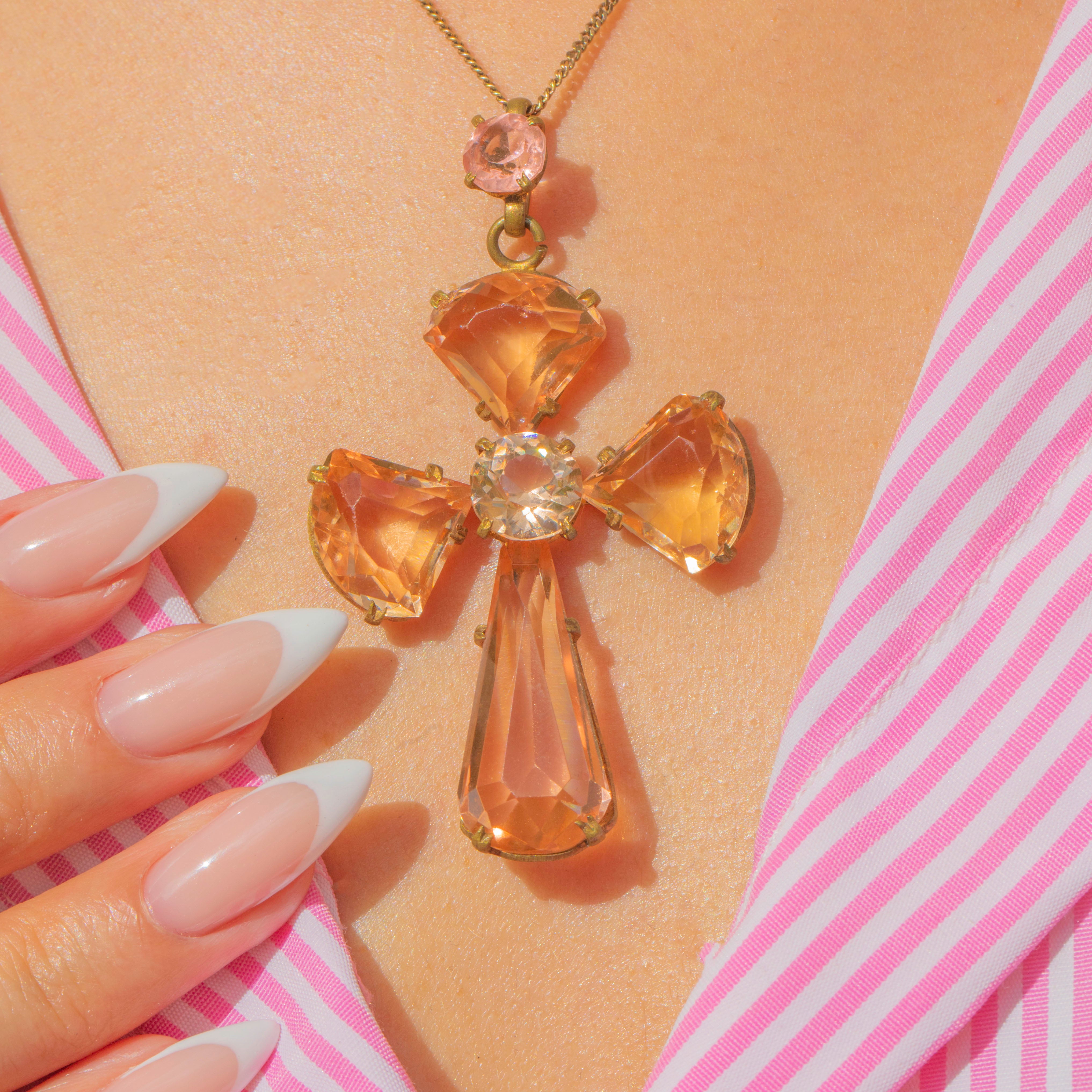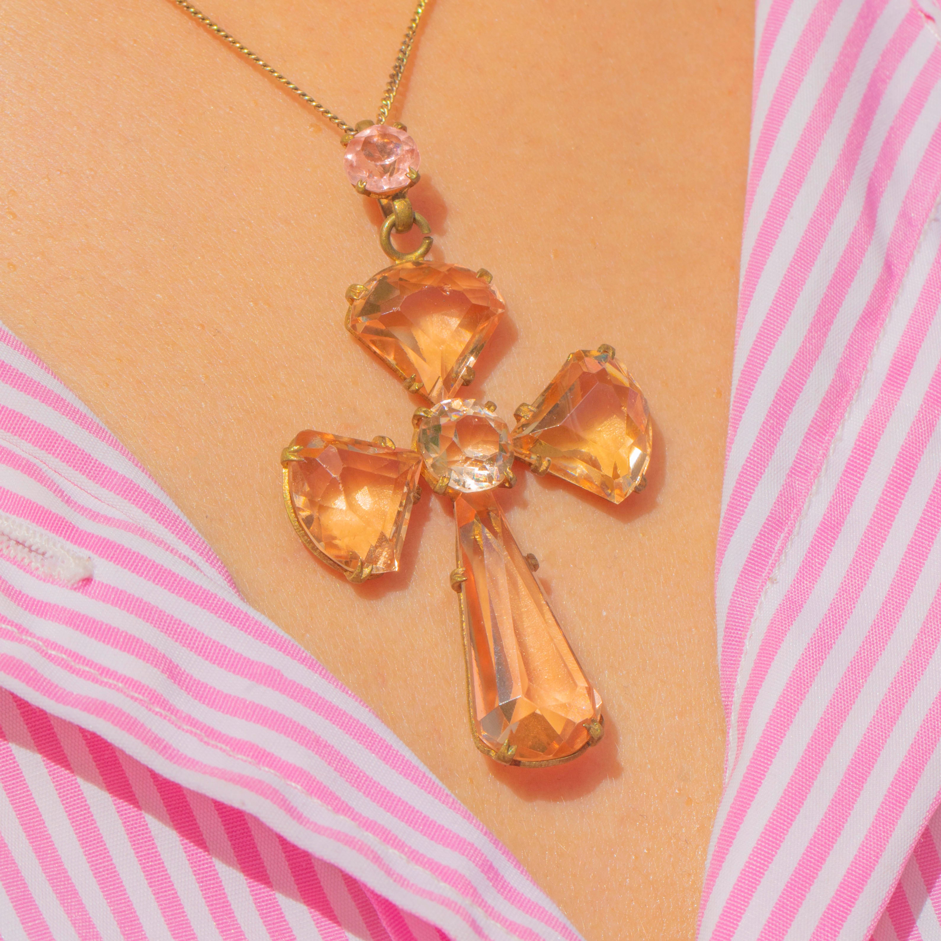 A striking Antique Victorian cross pendant, c.1850, set with glowing peach-coloured Paste gemstones. The gemstones are beautifully cut and foiled to catch the light, radiating a warm golden-orange tone that is both rare and eye-catching. Each stone is securely claw-set in a base metal frame, showcasing the skilled craftsmanship of the period.