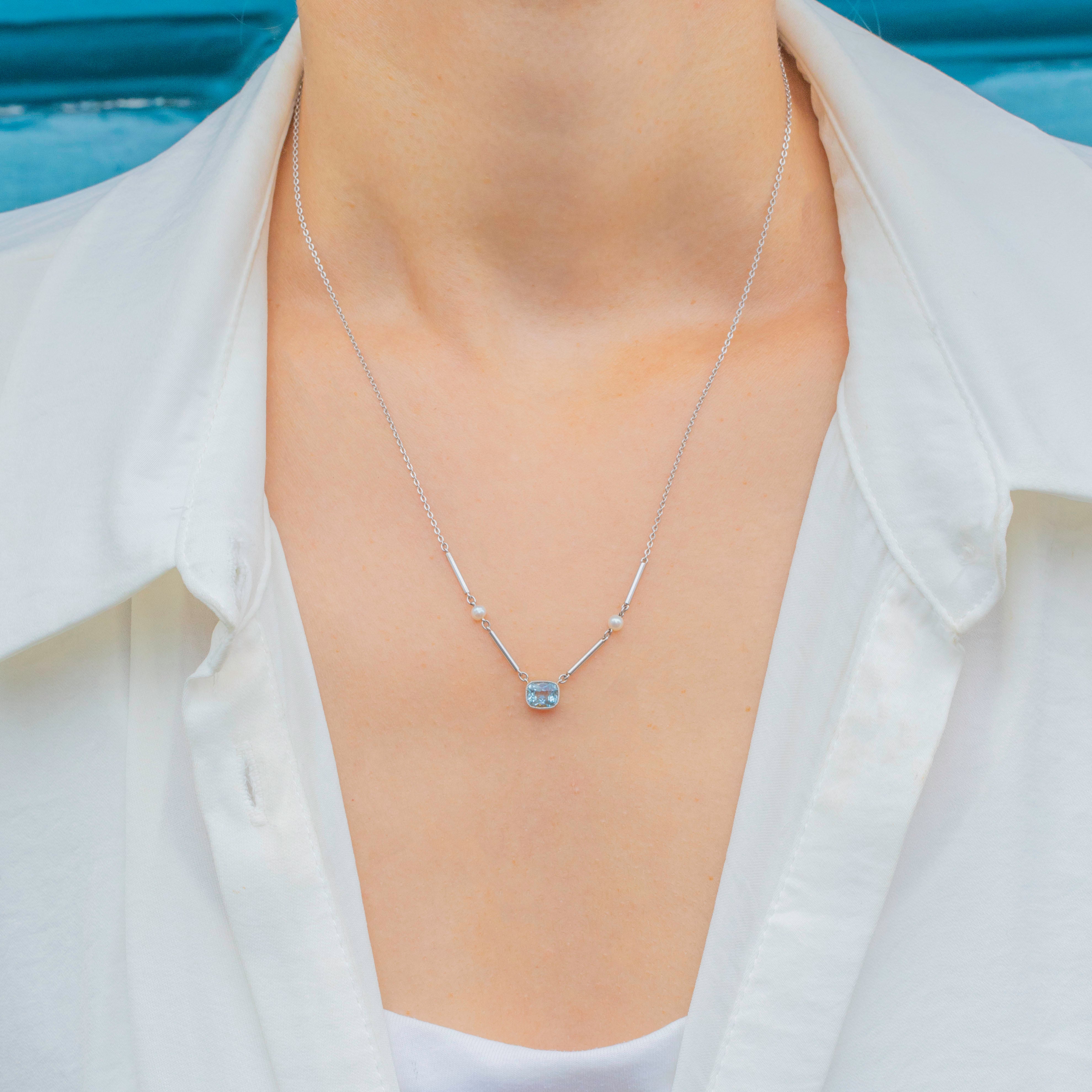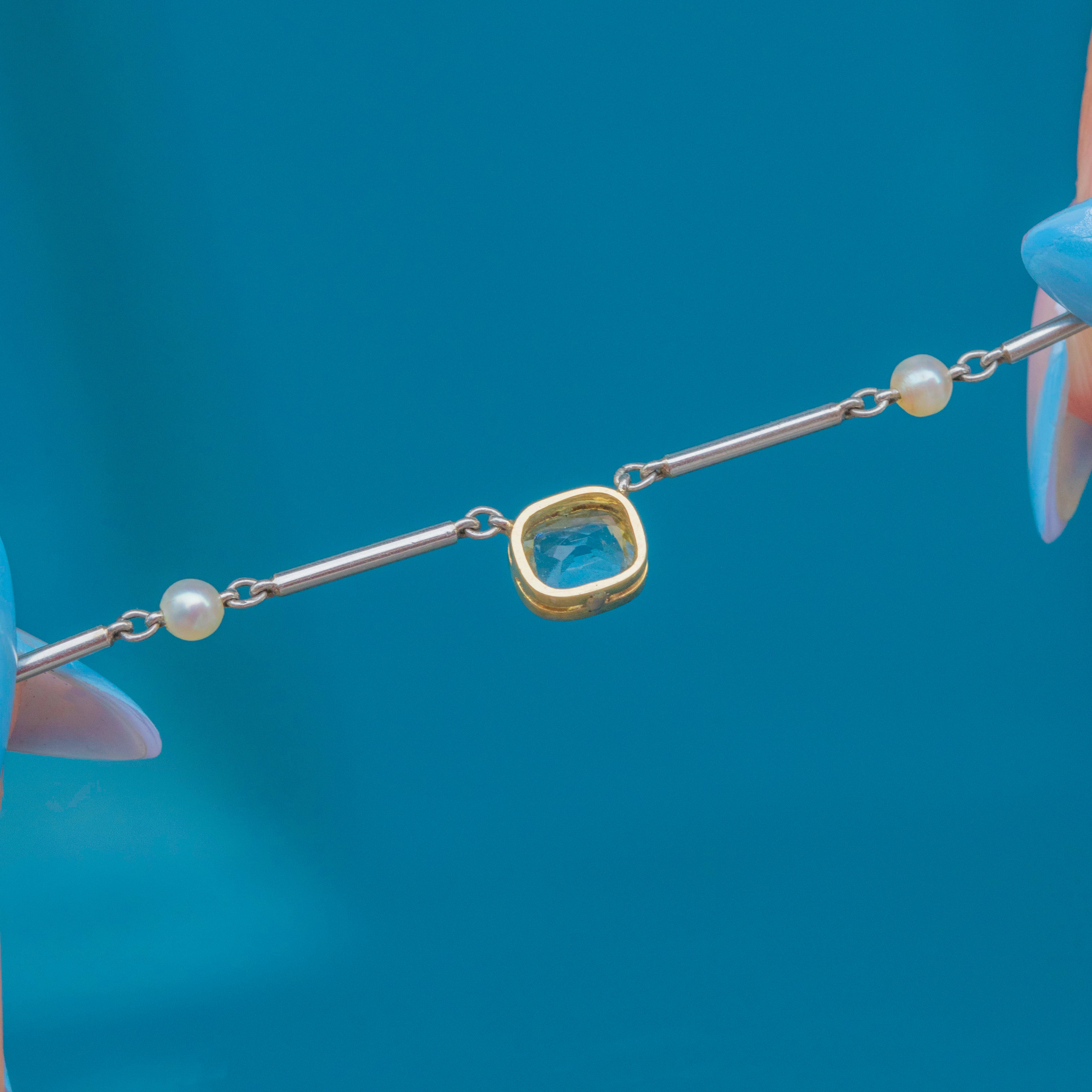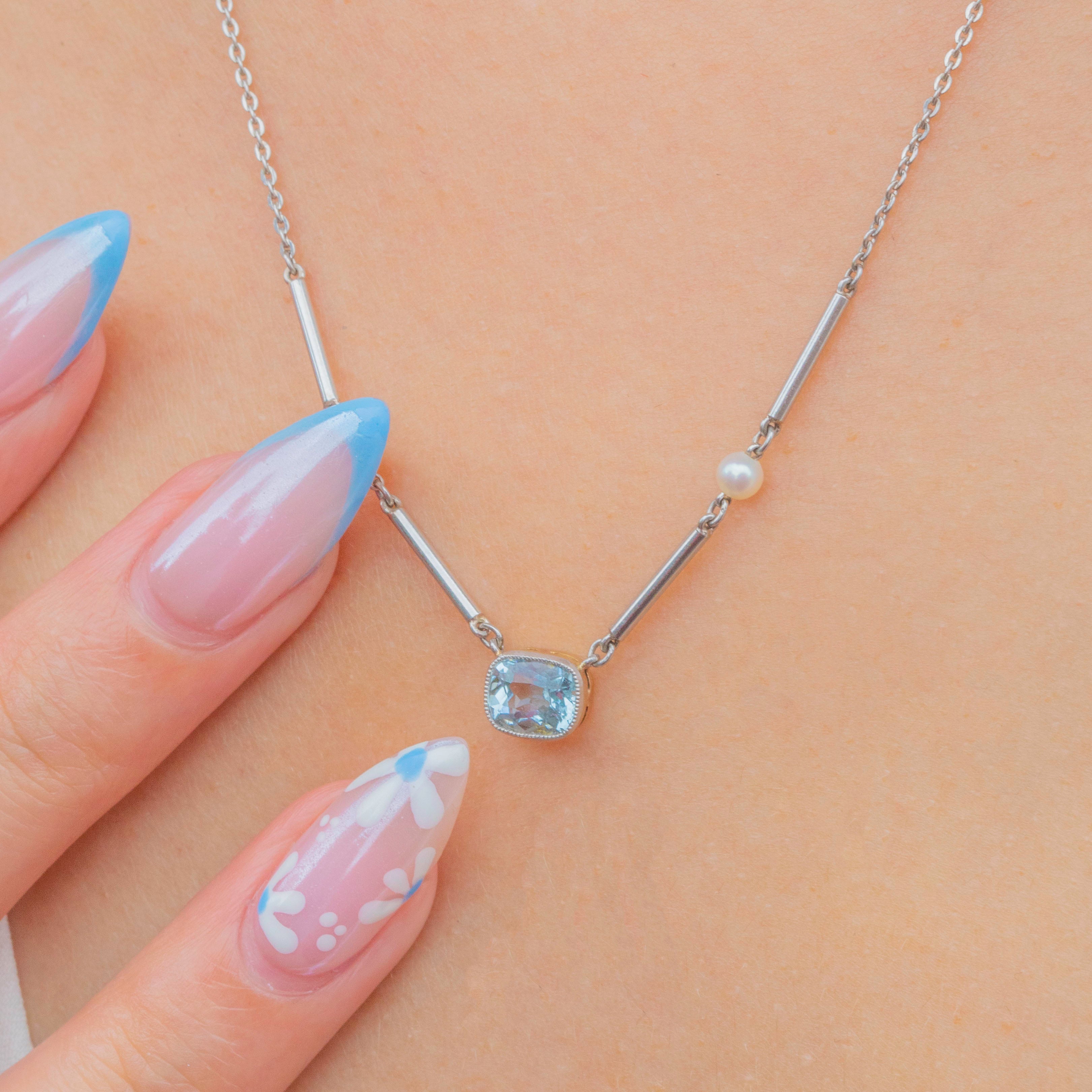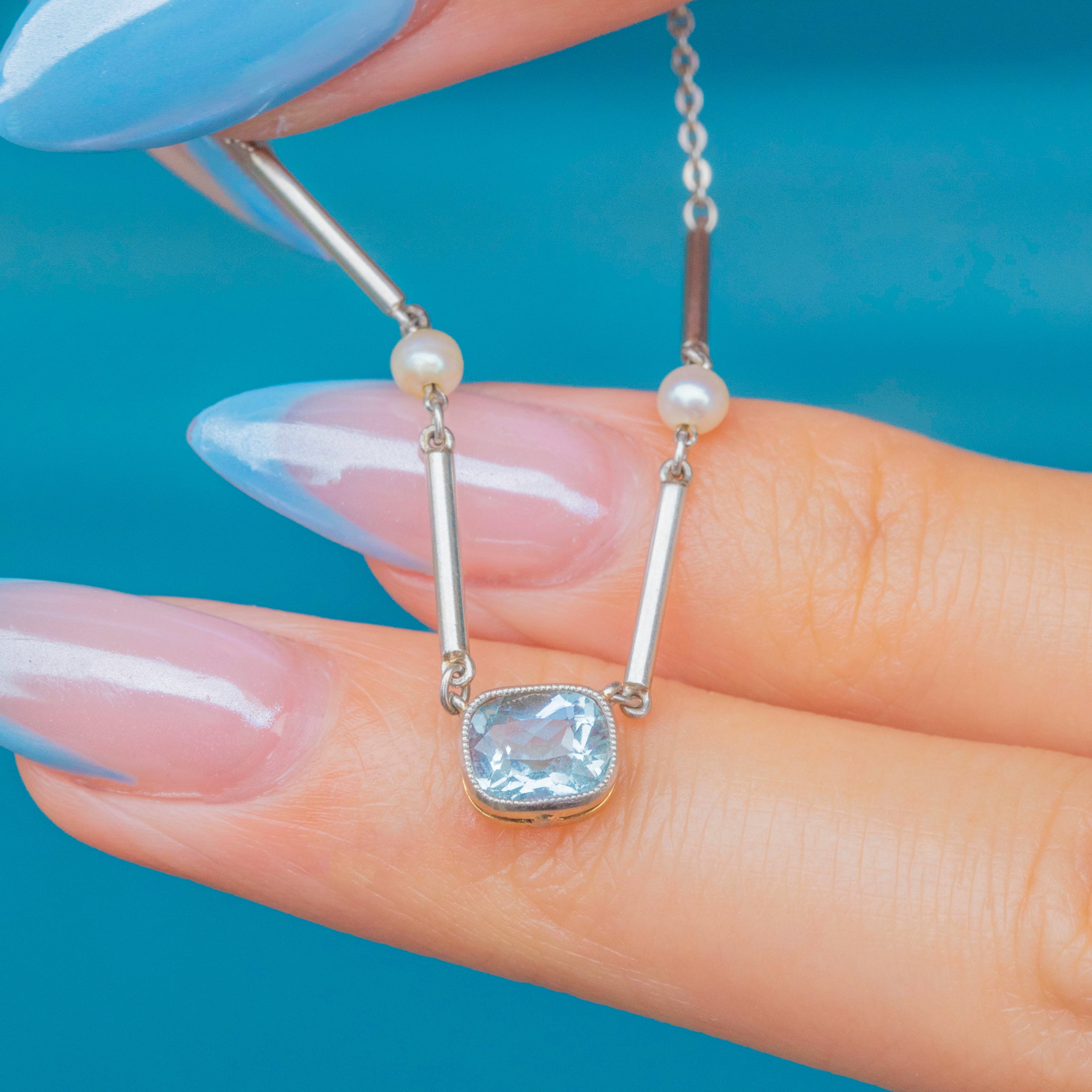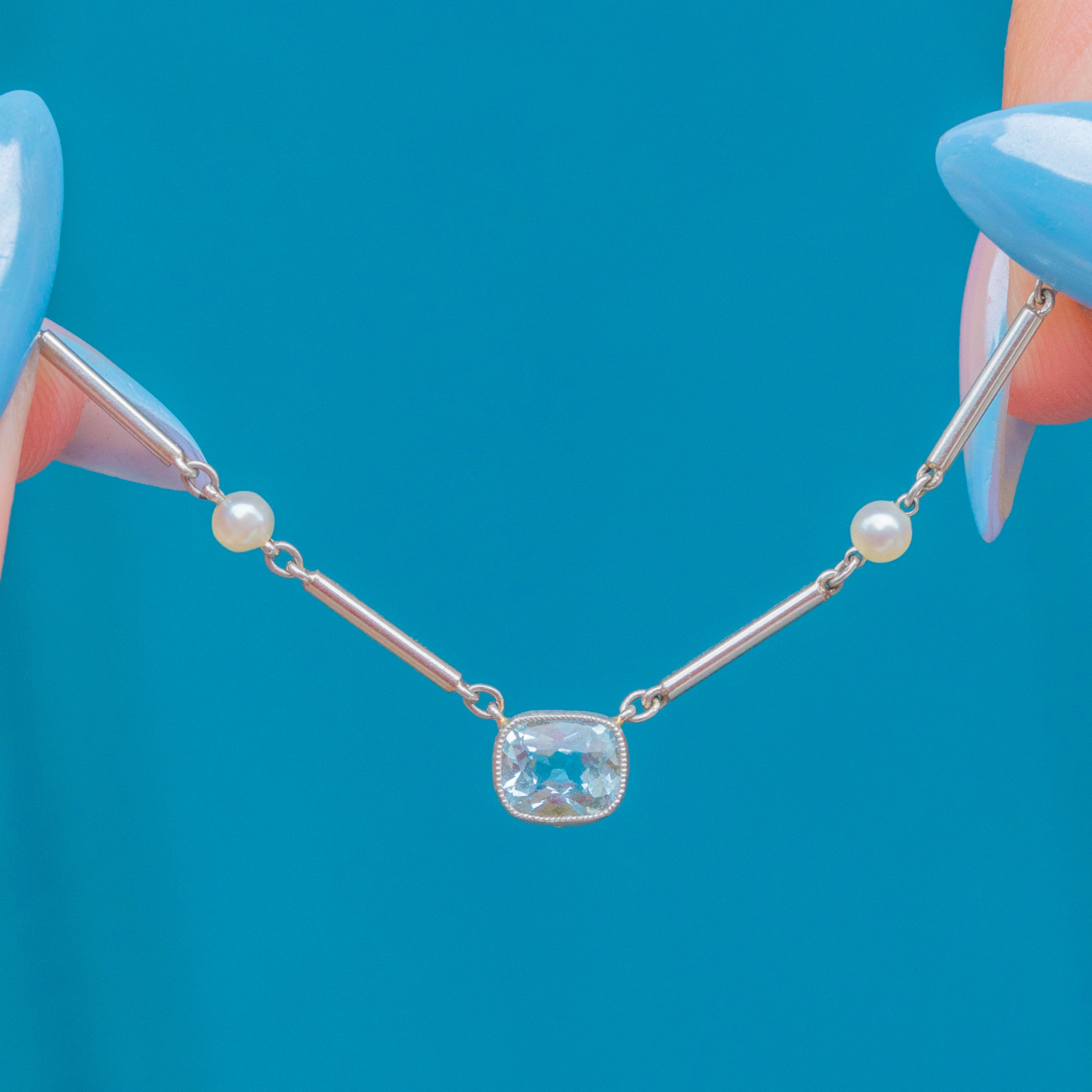 EXCELLENT: The Aquamarine is radiant and secure within its bezel, as are the surrounding Pearls. Each link of the Platinum chain is uniform and secure and with little else to note, this Edwardian necklace can be worn with utmost confidence.