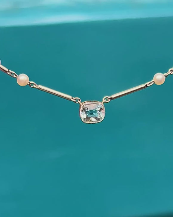 Edwardian Platinum Aquamarine & Natural Pearl Necklace