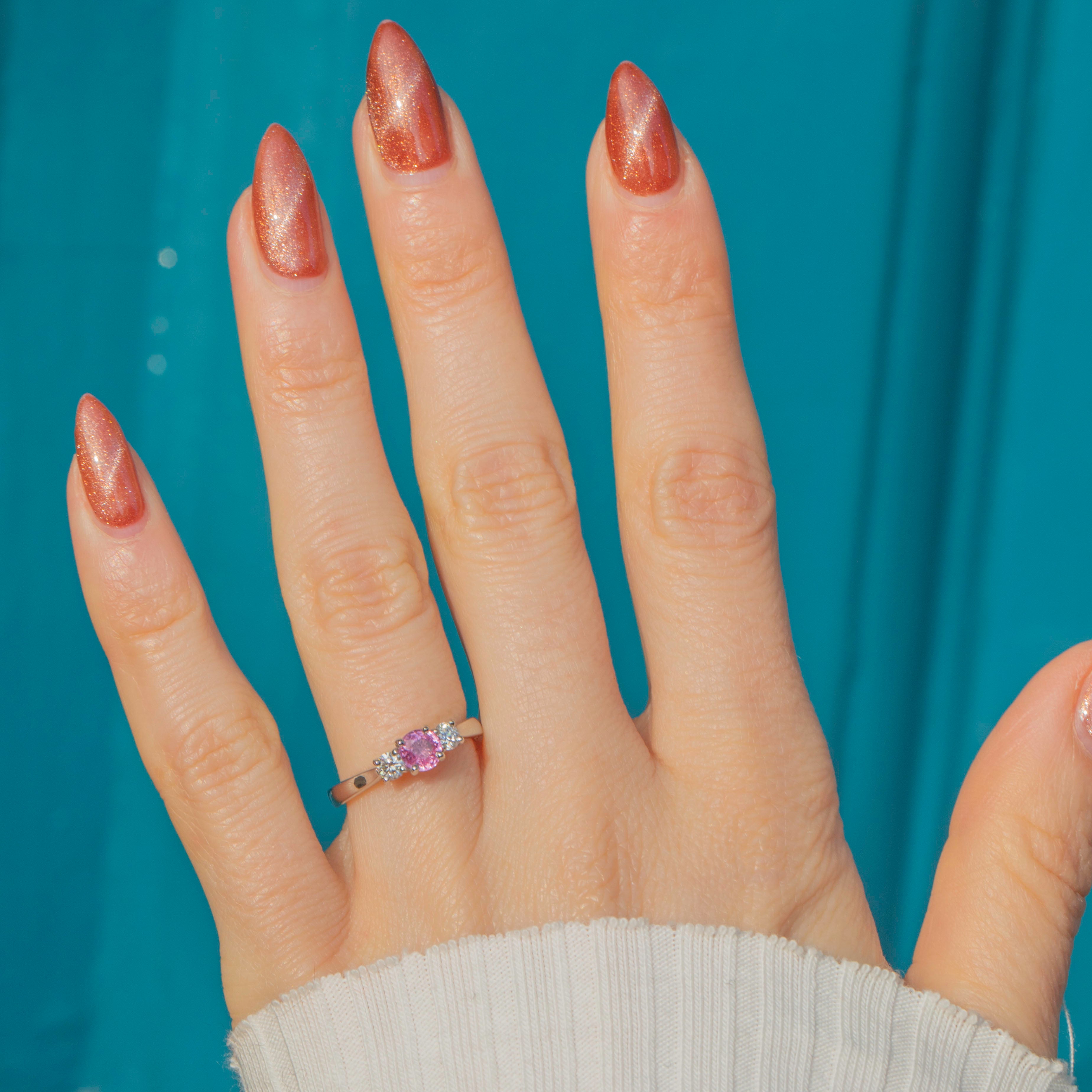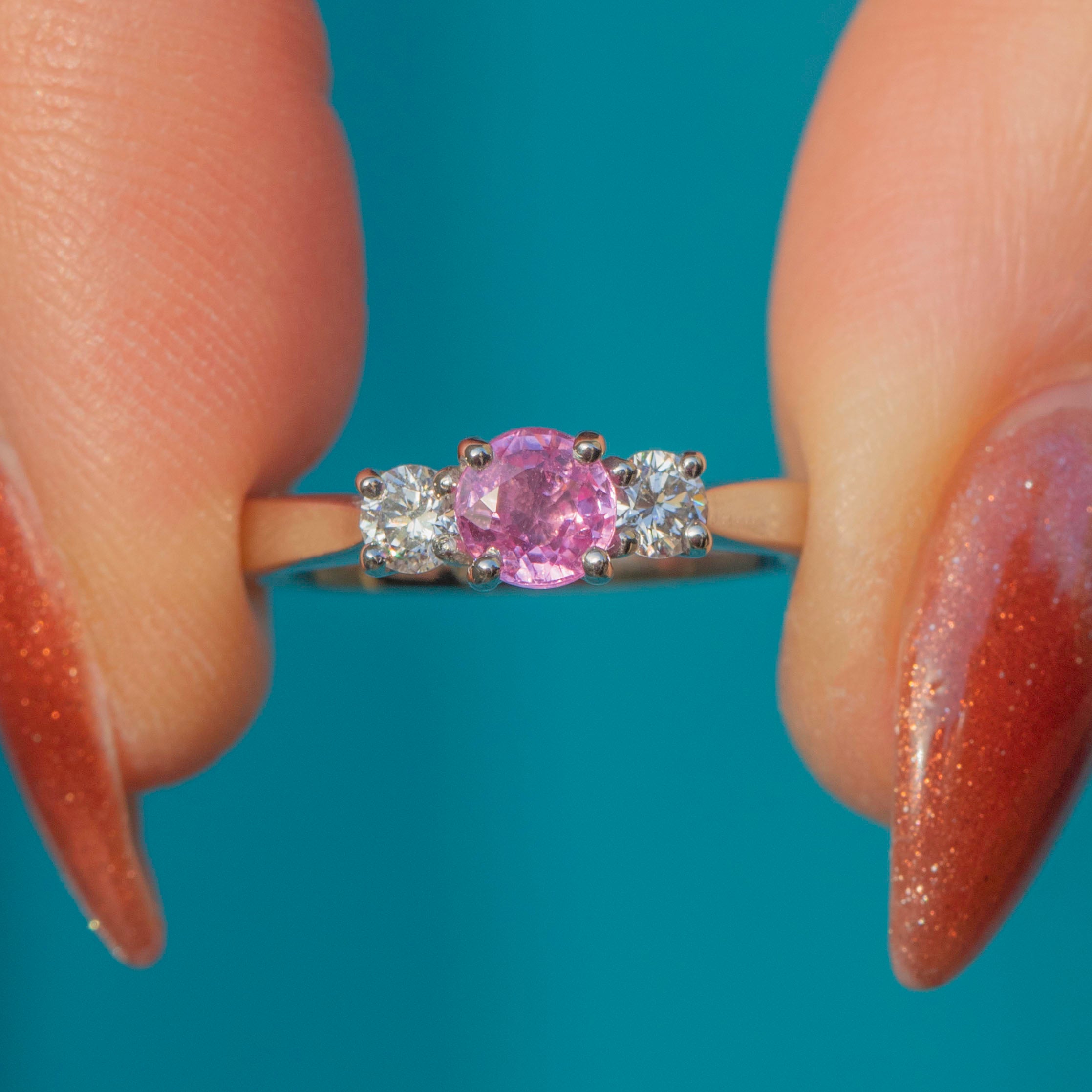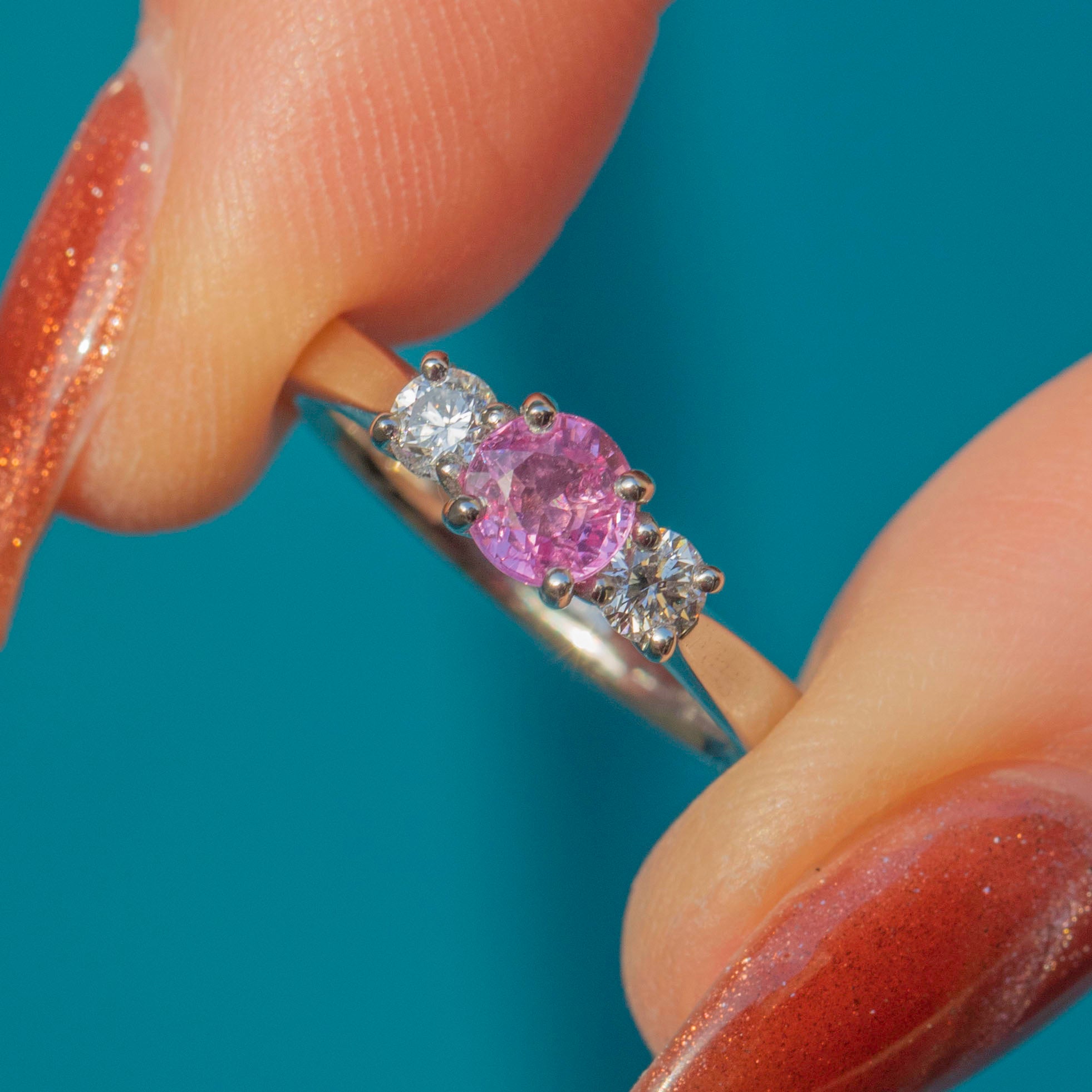 This Platinum Pink Sapphire Diamond trilogy ring is a stunning piece! As if plucked from a blossoming springtime field, this ring boasts a mesmerising 0.35ct pink Sapphire with a baby pink hue flanked by scintillating 0.10ct Diamonds.
